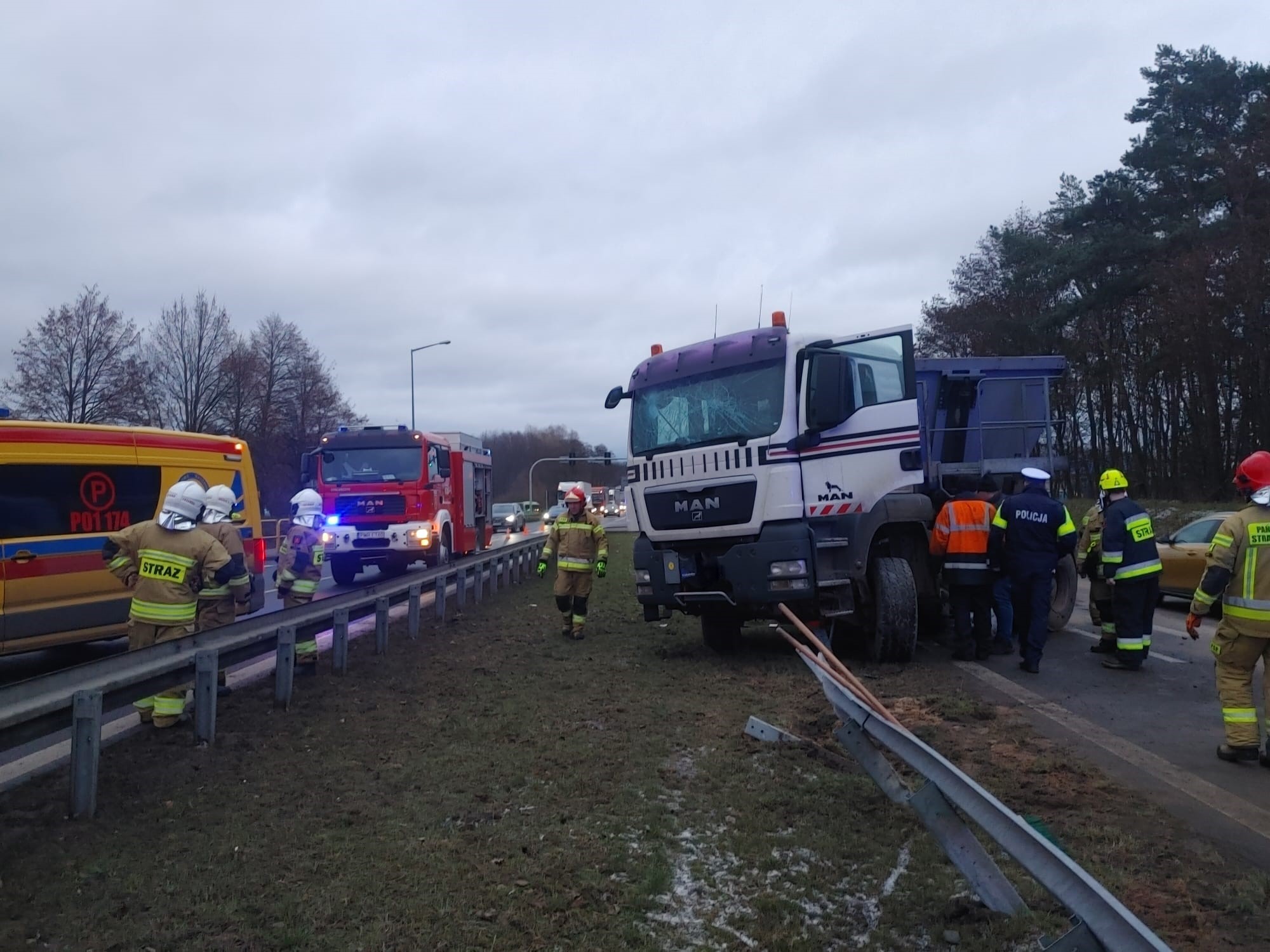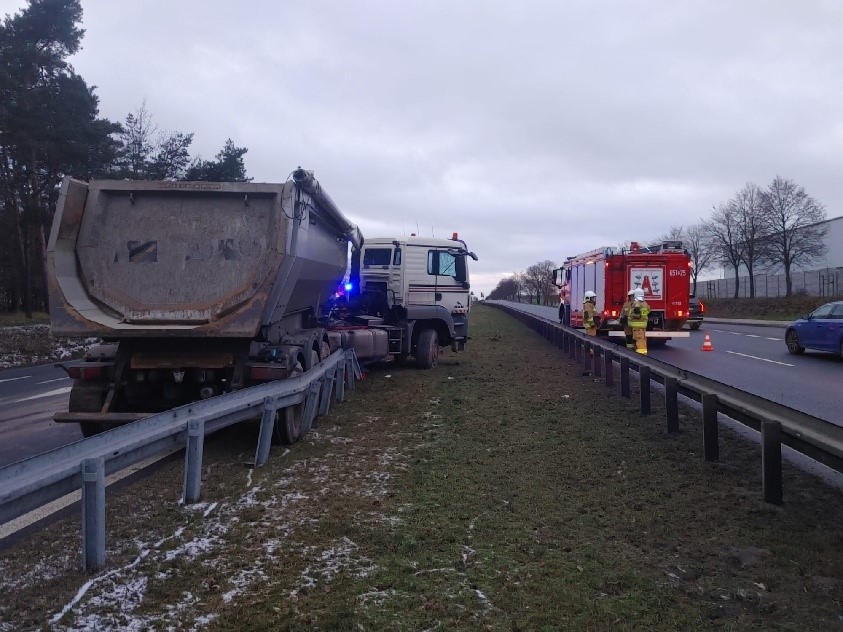 Po przybyciu jednostek na miejsce zdarzenia zastano wypadek samochodu ciężarowego z naczepą, auto uderzyło w barierki odgradzające pasy ruchu na DK 92- droga przejezdna. Kierowca znajdował się w kabinie pojazdu- przytomny, z urazem głowy.