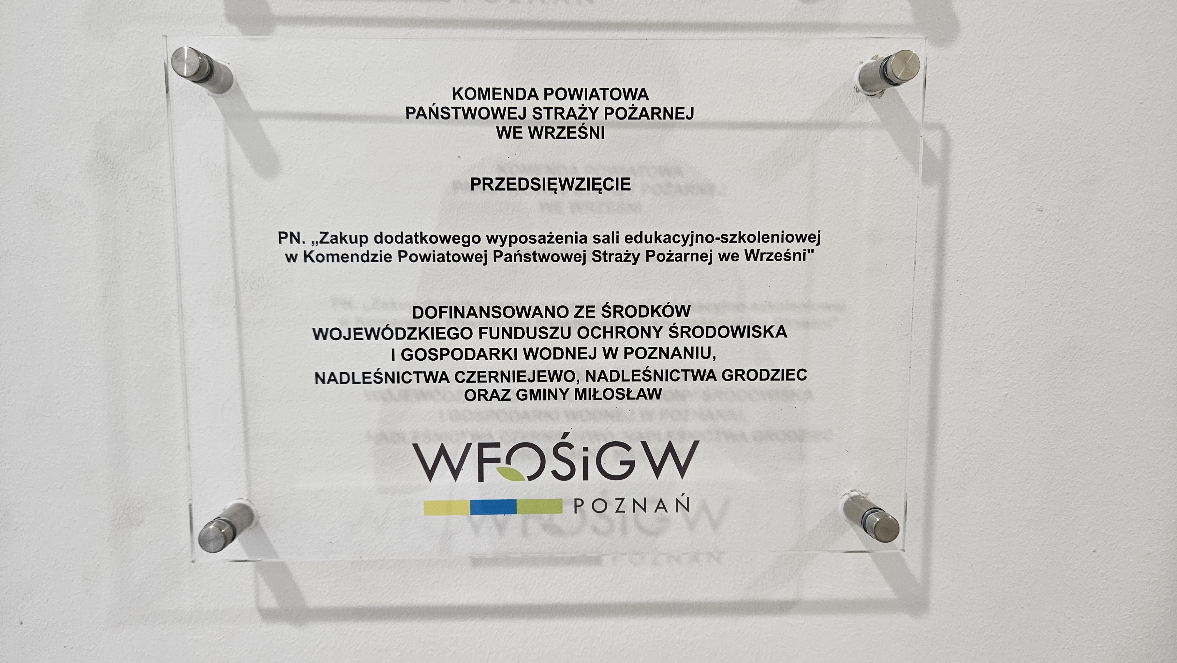Komenda Powiatowa Państwowej Straży Pożarnej we Wrześni przy wykorzystaniu środków z dofinansowania Wojewódzkiego Funduszu Ochrony Środowiska i Gospodarki Wodnej w Poznaniu oraz dofinansowania z Nadleśnictwa Grodziec, Nadleśnictwa Czerniejewo oraz Gminy Miłosław zrealizowała zadanie pn. „Zakup dodatkowego wyposażenia sali edukacyjno-szkoleniowej w Komedzie Powiatowej Państwowej Straży Pożarnej we Wrześni”.