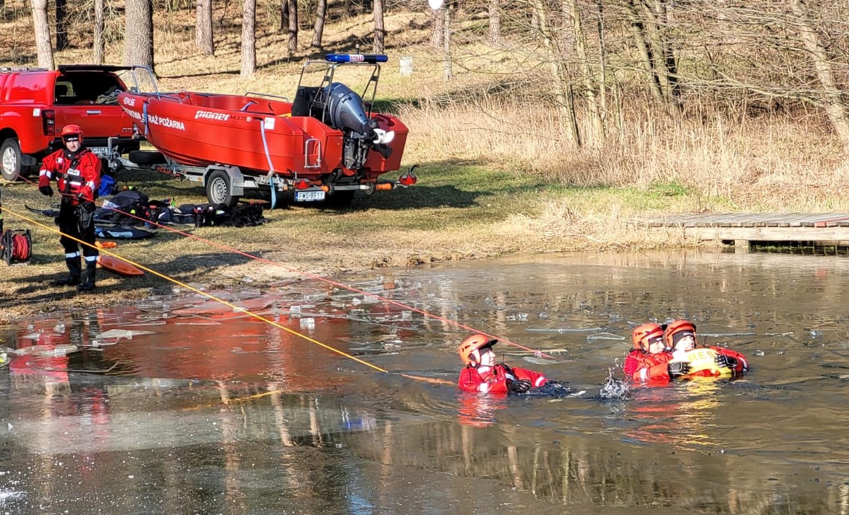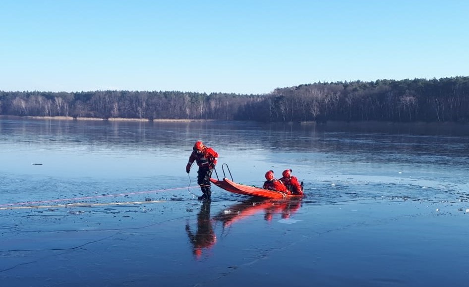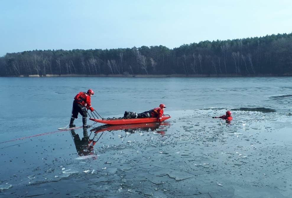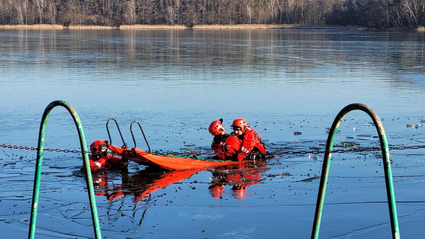Ćwiczenia w zakresie ratownictwa lodowego na Jeziorze Lgińsko.