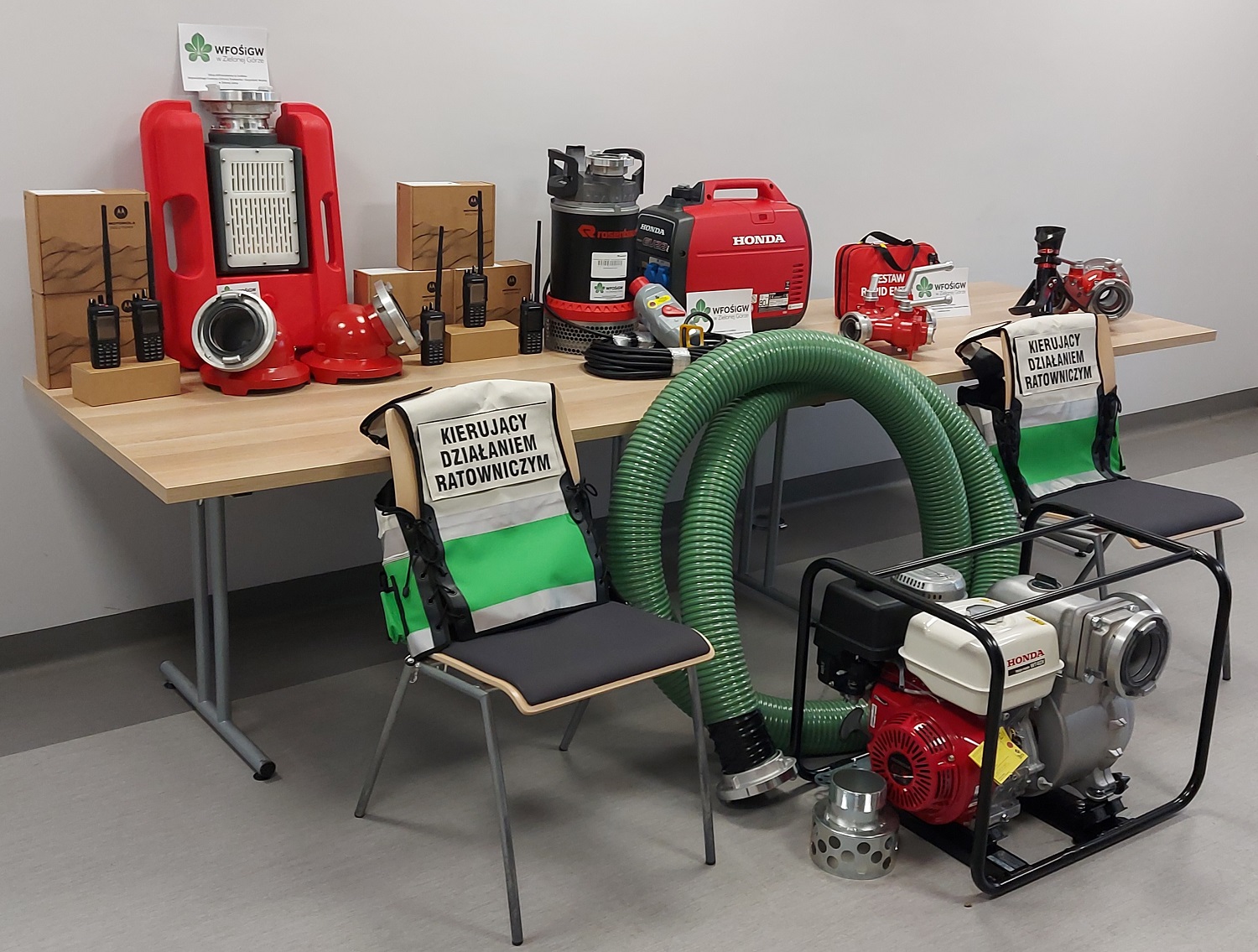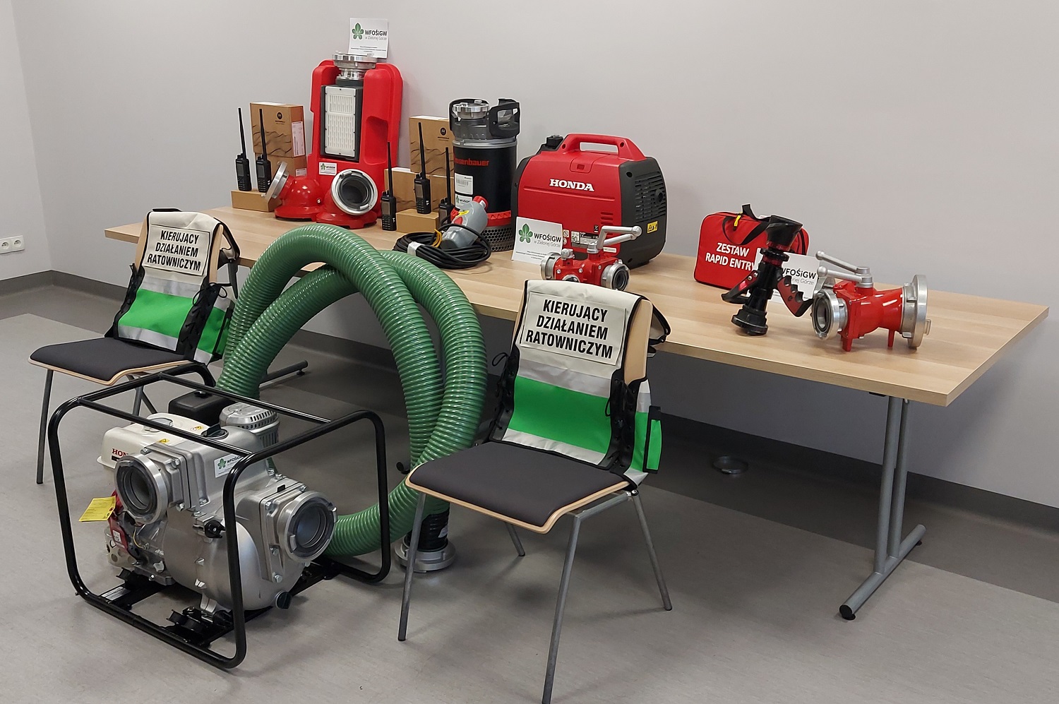 Zakupiono następujący sprzęt: pompę do wody zanieczyszczonej, elektryczną pompę zanurzeniową, agregat prądotwórczy o mocy, prądownicę turbo, 5 radiotelefonów przenośnych, 4 ładowarki samochodowe, smok pływający, 2 rozdzielacze kulowe, zestaw do wyważania drzwi, wąż ssawny, 2 smoki ssawne, 2 kamizelki taktyczne dla KDR.