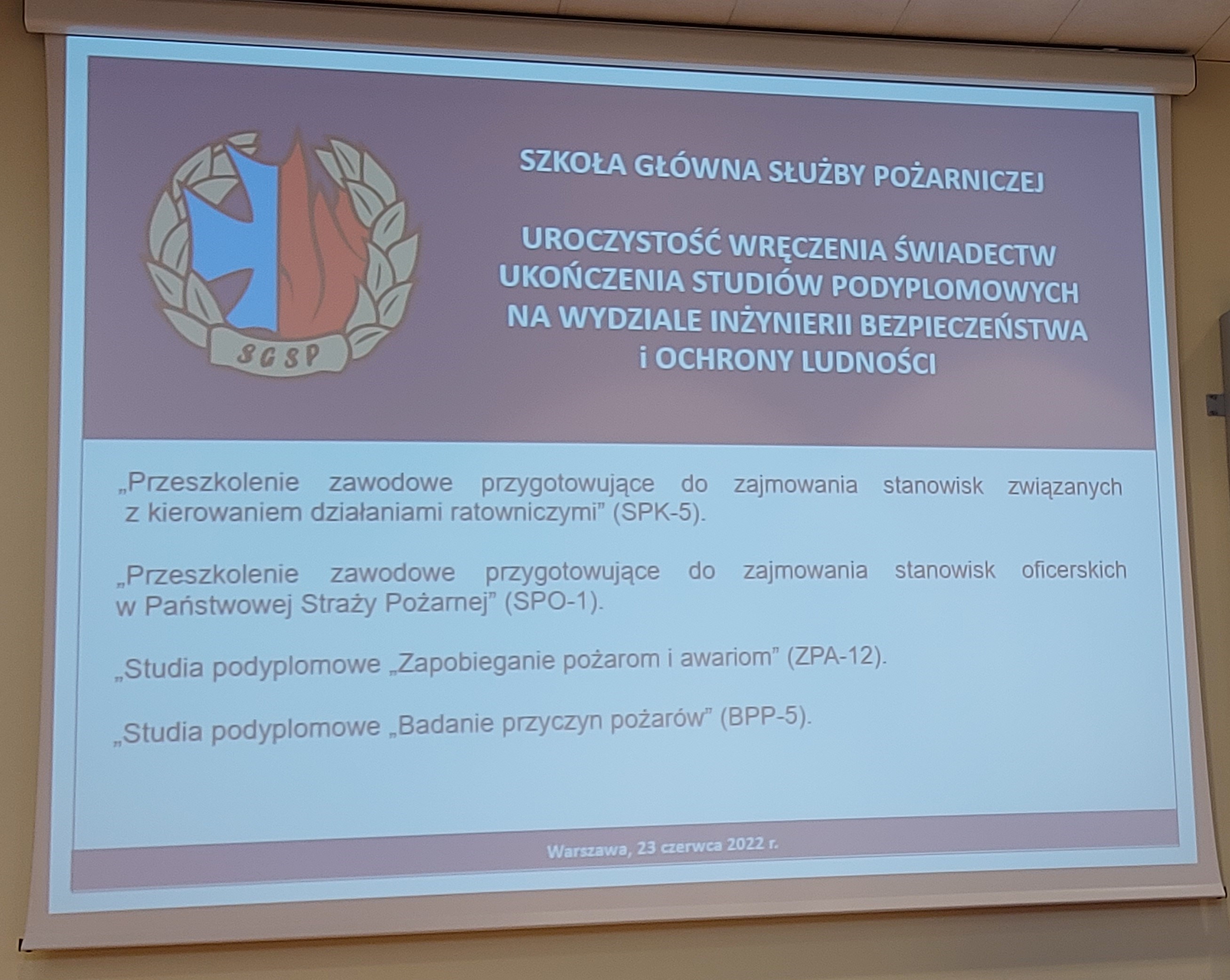 W dniu 23 czerwca 2022 roku dwóch funkcjonariuszy z Komendy Powiatowej Państwowej Straży Pożarnej we Wschowie brało udział w uroczystości wręczenia świadectw ukończenia studiów podyplomowych, która odbyła się w Szkole Głównej Służby Pożarniczej