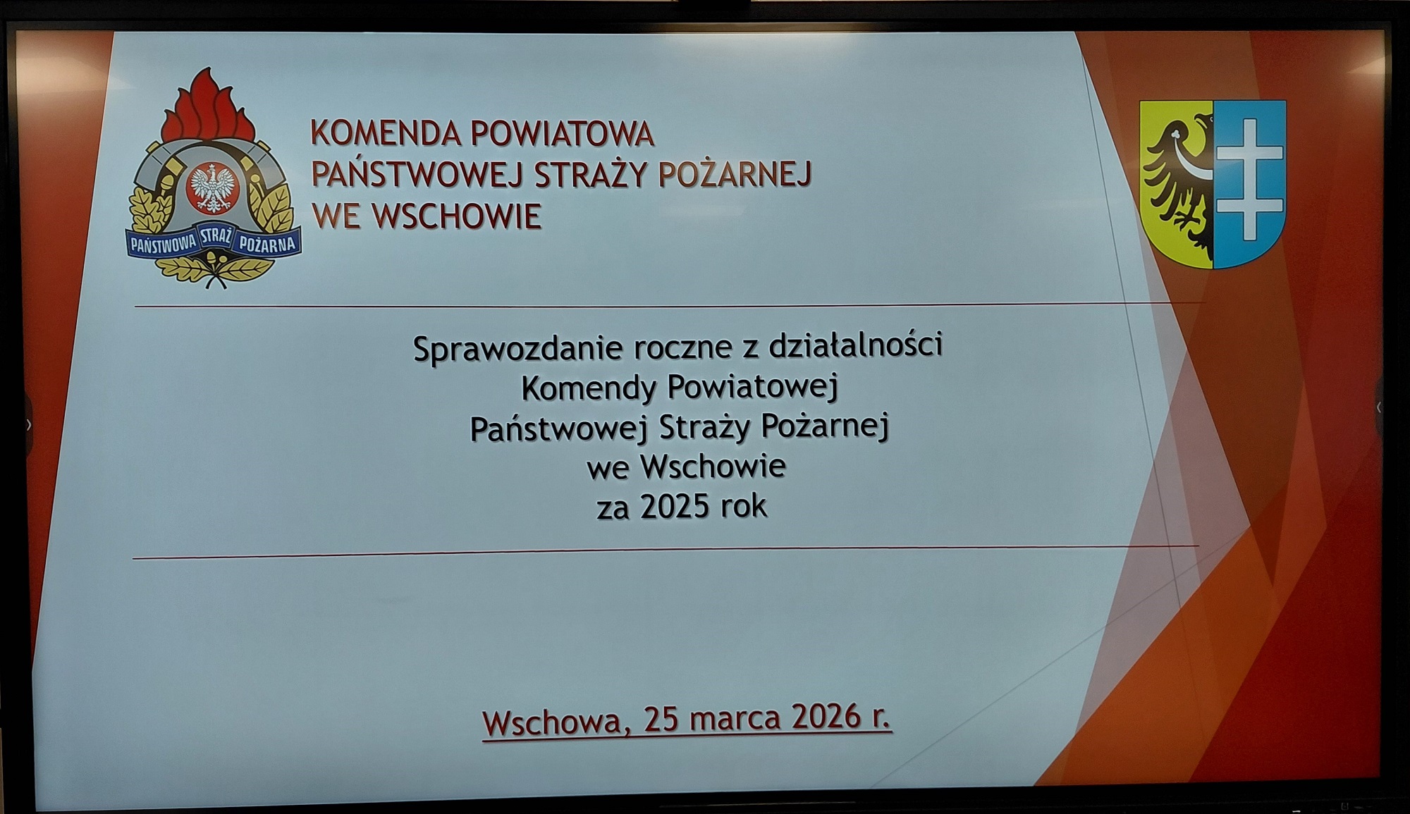 Następnie st. kpt. Piotr Tyczyński – Komendant Powiatowy PSP oraz st. bryg. Tomasz Maciejewski – Zastępca Komendanta Powiatowego PSP przedstawili „Informację z działalności Komendy Powiatowej PSP we Wschowie za rok 2025”.