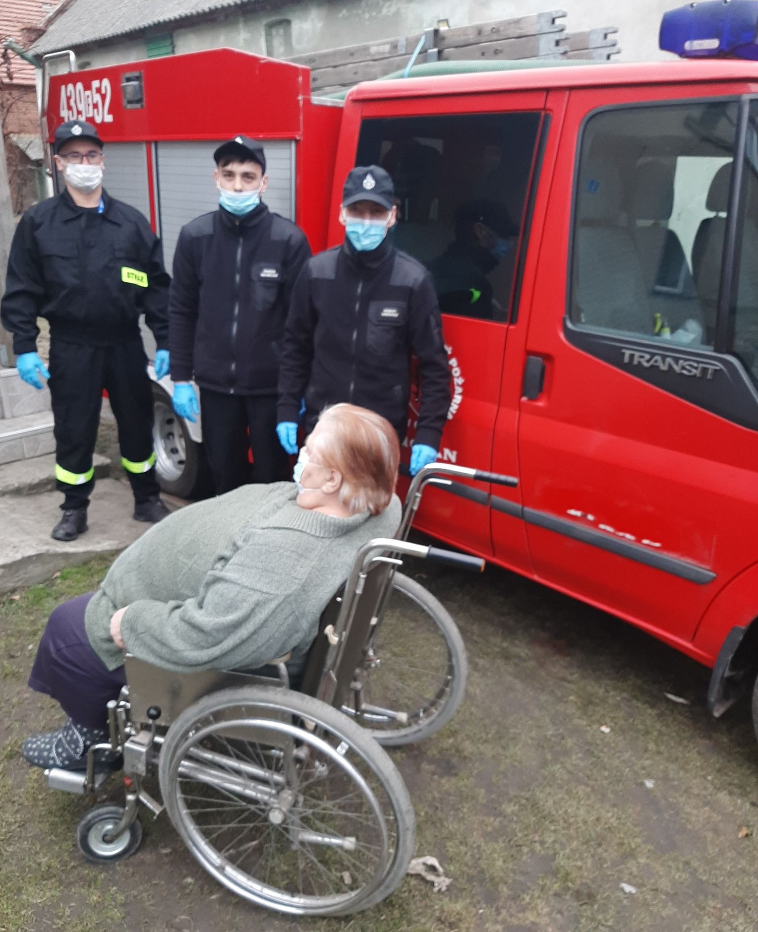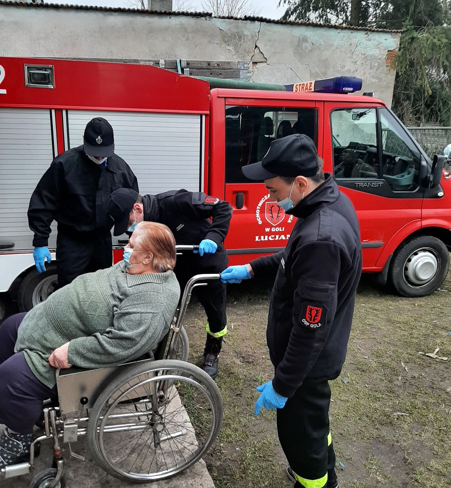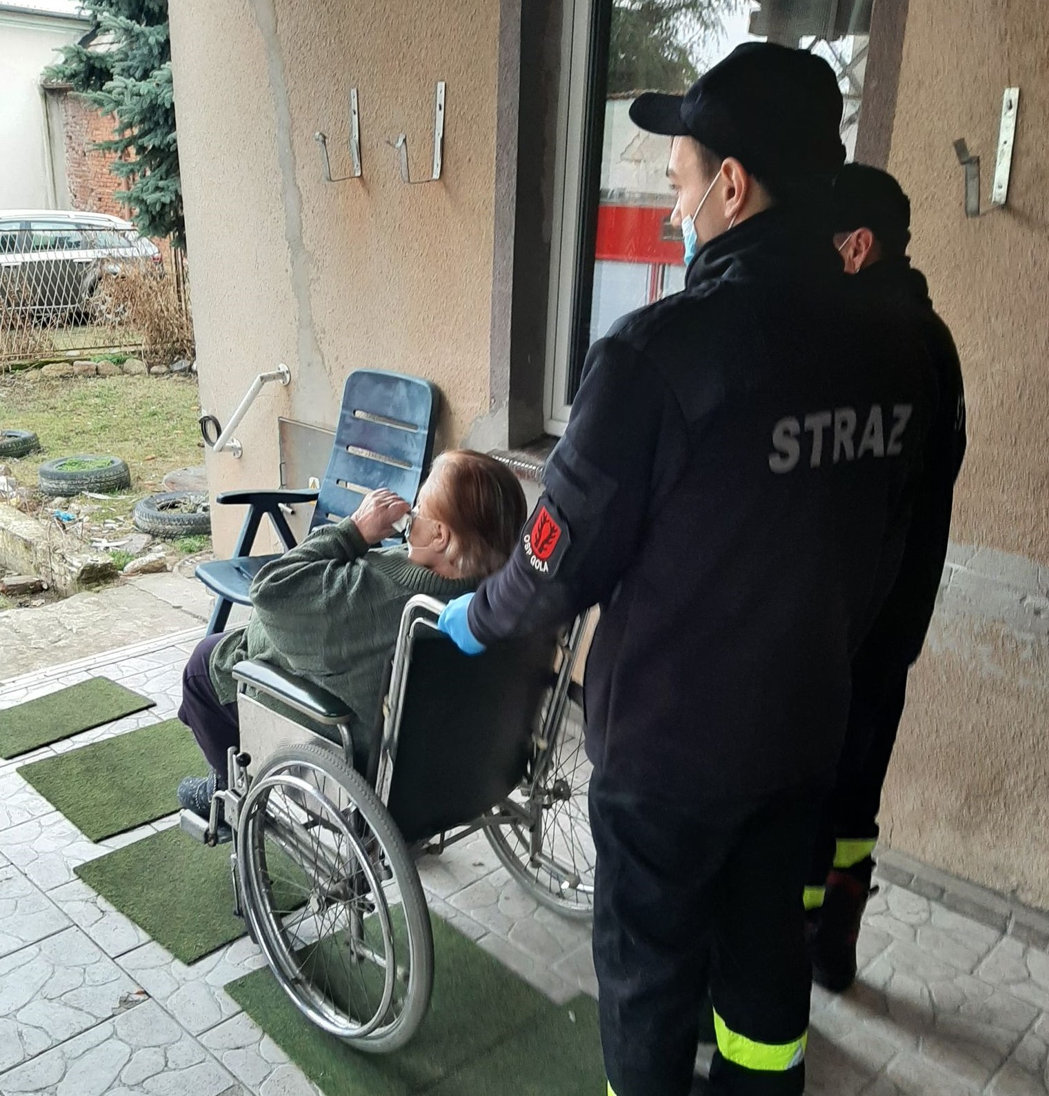 Starsza osoba otrzymała pomoc od strażaków w dotarciu do punktów szczepień