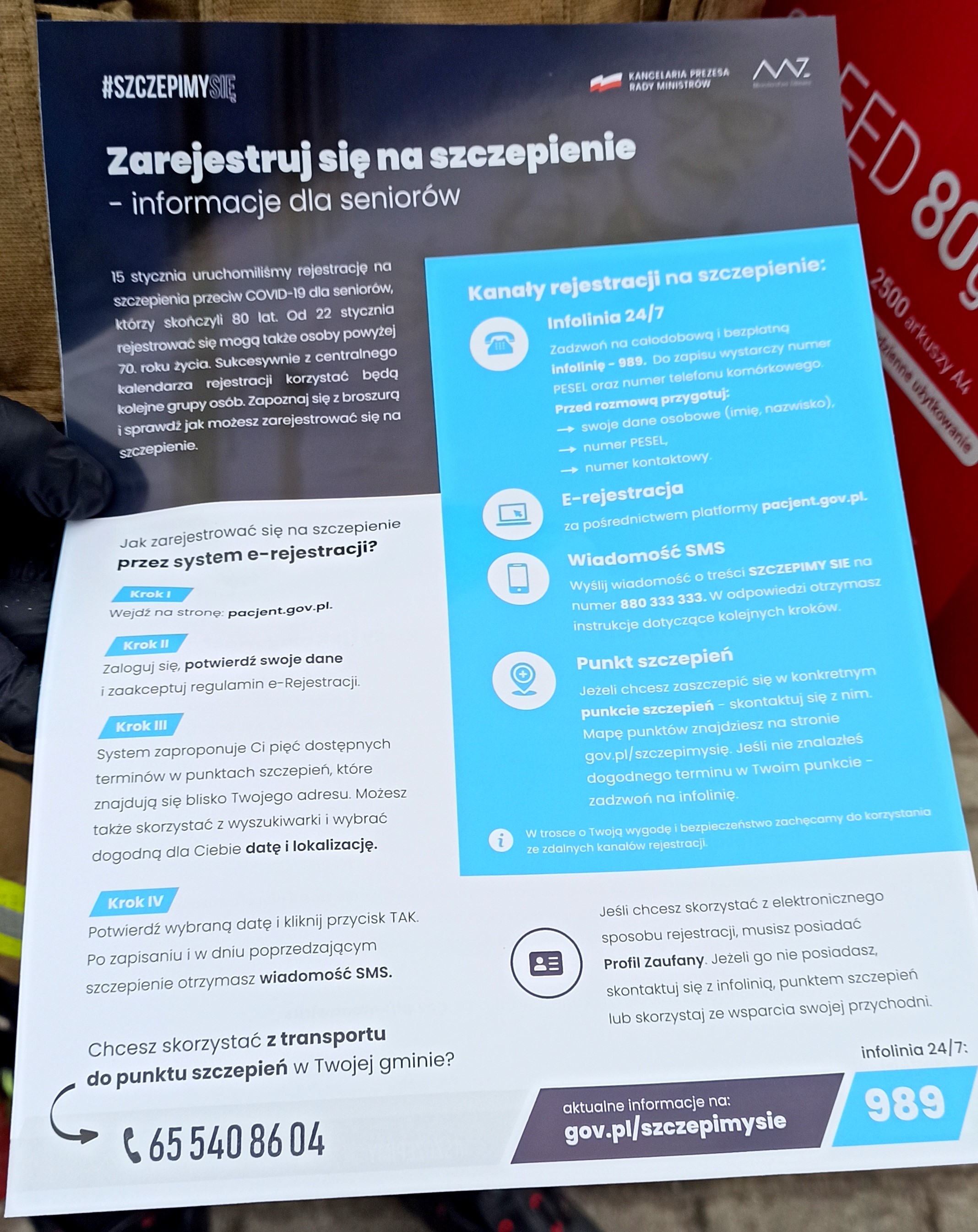 Na każdej ulotce znajduje się numeru telefonu, pod którym mieszkańcy danej gminy mogą kontaktować się w przypadku potrzeby uzyskania pomocy w dowiezieniu do punktów szczepień oraz zapoznać się z informacjami dotyczącymi akcji „SzczepimySię” w ramach Narodowego Programu Szczepień przeciw COVID-19