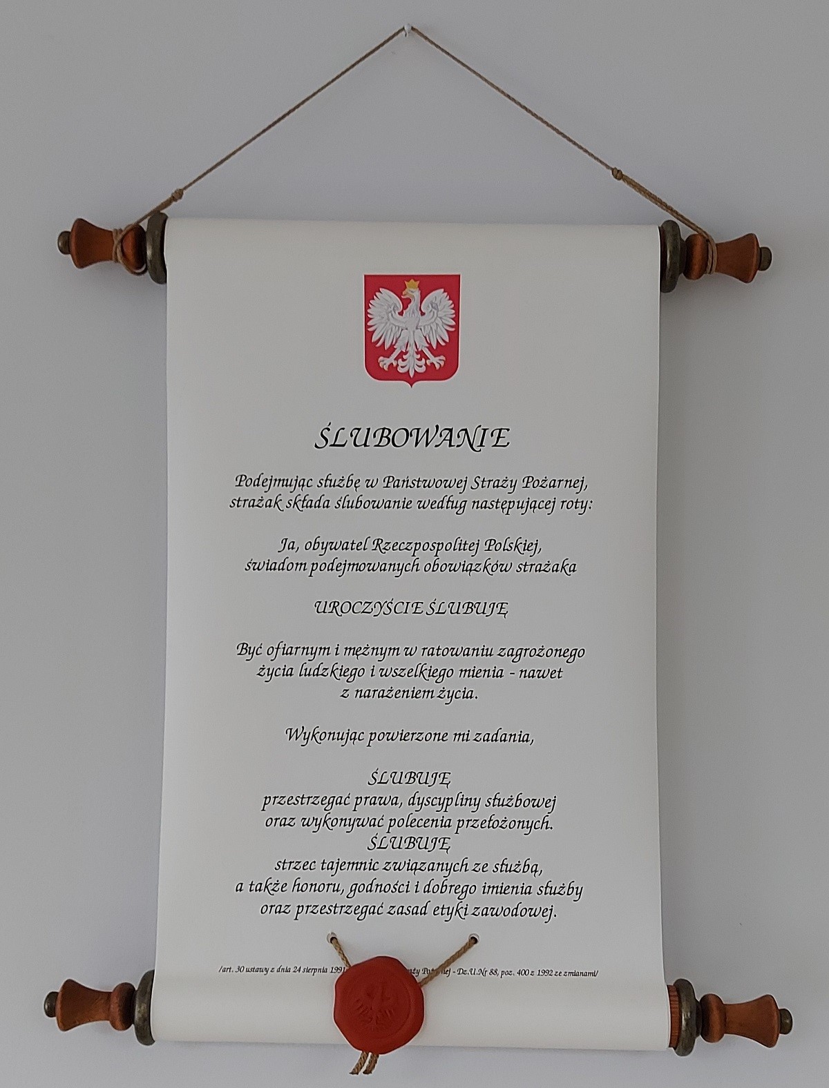 Na wstępie Komendant Powiatowy nawiązał do roty ślubowania, podkreślając znaczenie tej chwili w życiu zawodowym każdego strażaka. Zaznaczył także, że funkcjonariusz reprezentuje tą zasłużoną formację nie tylko w czasie służby, ale także poza nią. Podejmując służbę w Państwowej Straży Pożarnej, strażak składa ślubowanie według następującej roty: