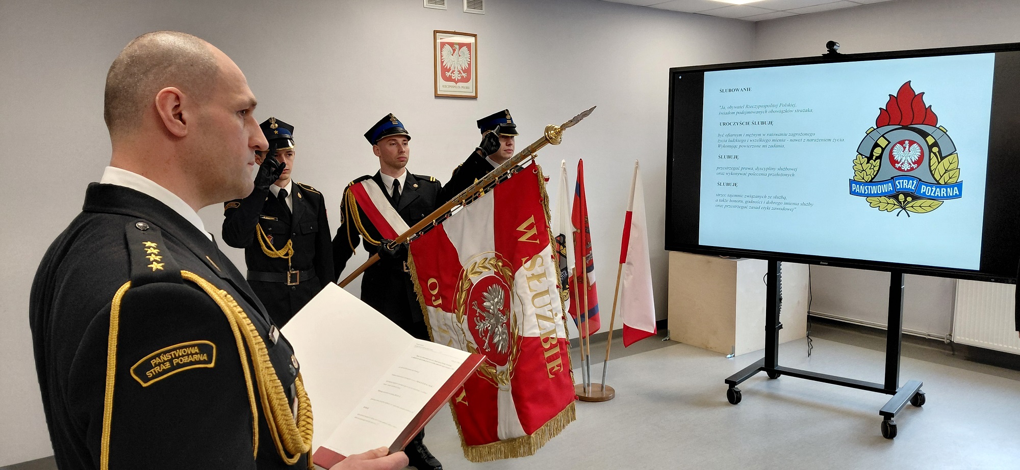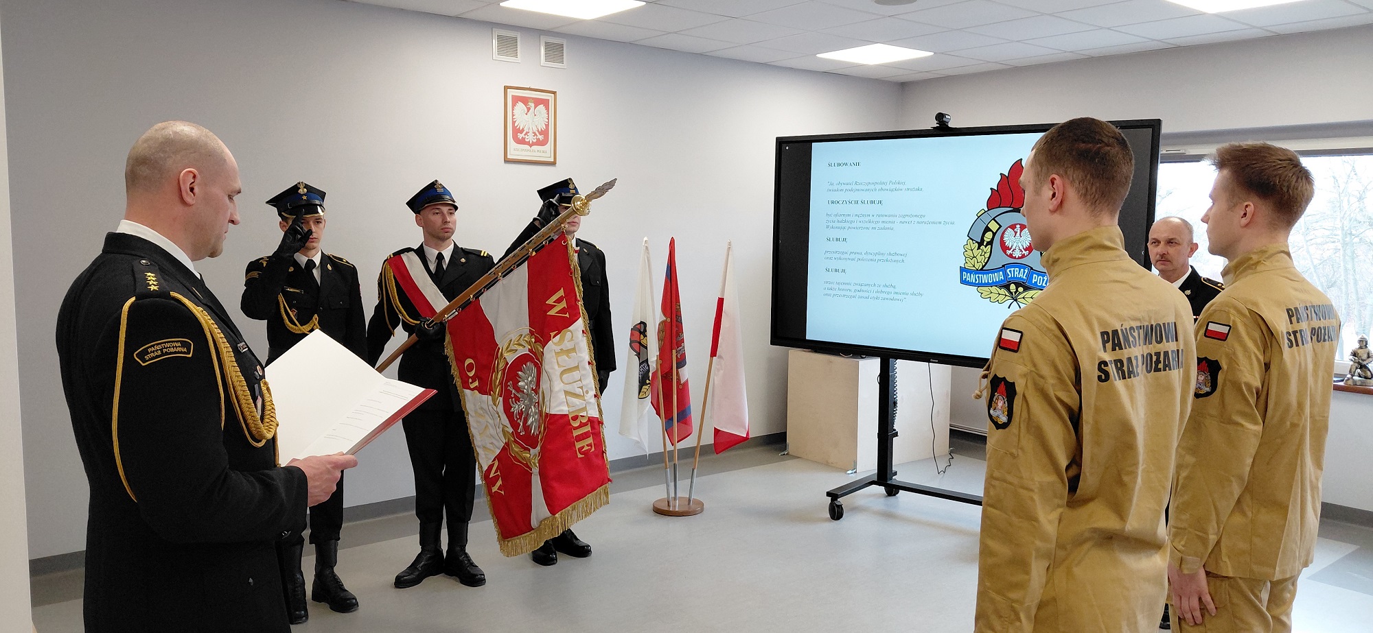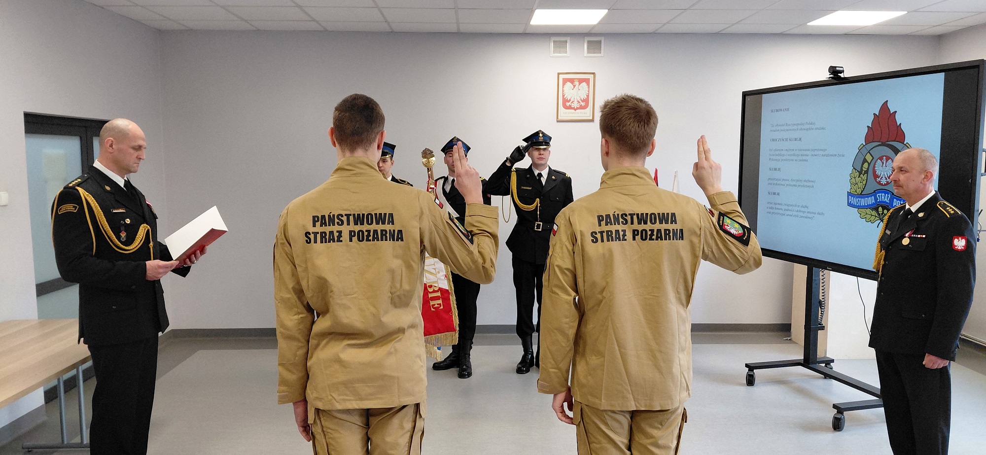 W dniu 13 lutego 2026 roku w Komendzie Powiatowej Państwowej Straży Pożarnej we Wschowie odbyło się uroczyste ślubowanie dwóch funkcjonariuszy przyjętych z dniem 1 grudnia 2025 roku do służby w Państwowej Straży Pożarnej.