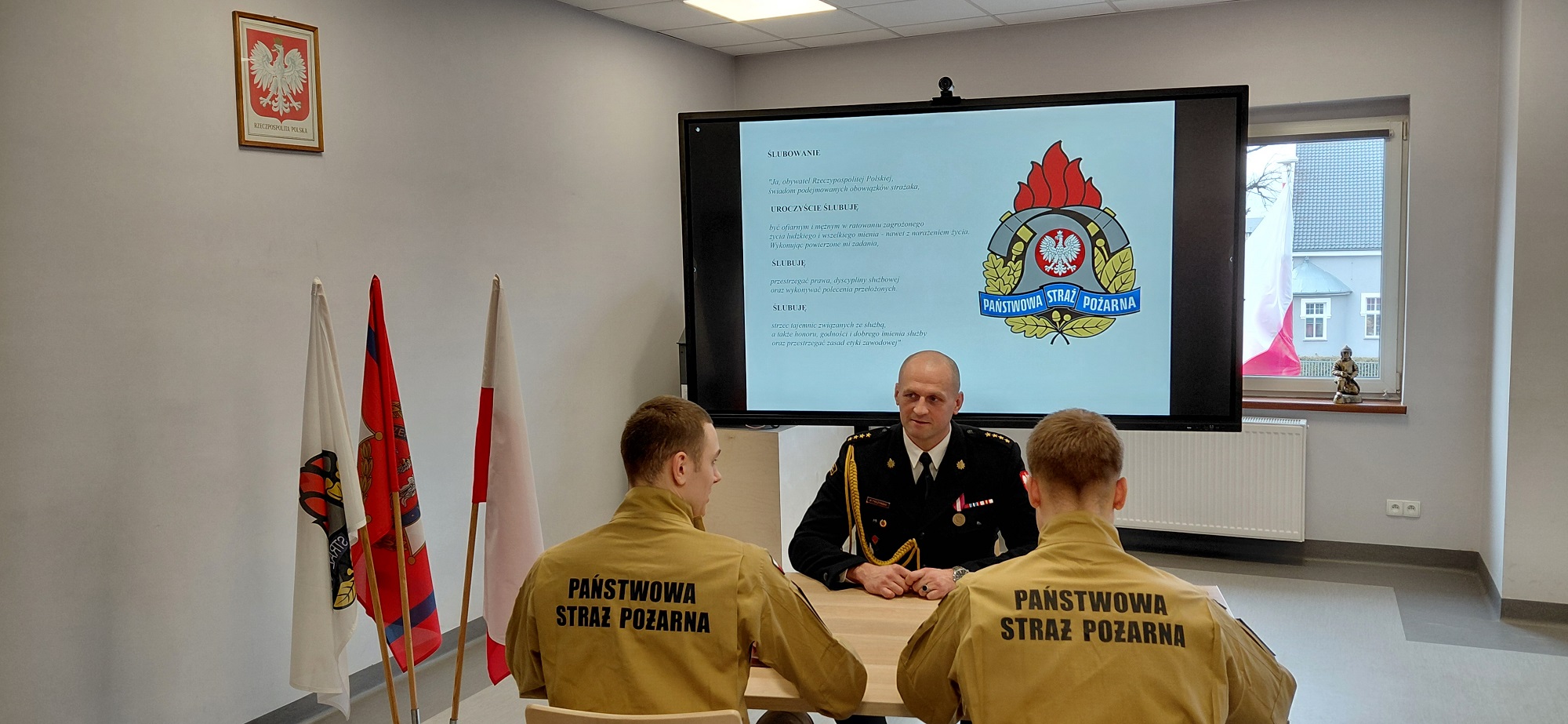 Na wstępie Komendant Powiatowy pogratulował i powitał nowego funkcjonariusza w służbie, nawiązując do roty ślubowania, podkreślając znaczenie tej chwili w życiu zawodowym każdego strażaka. Zaznaczył także, że funkcjonariusz reprezentuje tą zasłużoną formację nie tylko w czasie służby, ale także poza nią.