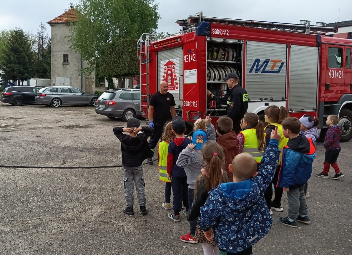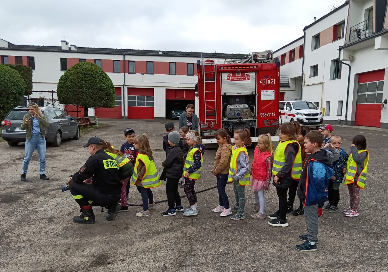 Dzieci zostały zapoznane ze służbą strażaków z Jednostki Ratowniczo – Gaśniczej Państwowej Straży Pożarnej we Wschowie, następnie strażacy zaprezentowali samochody strażackie wraz z wyposażeniem. W dalszej kolejności dzieci odwiedziły Stanowisko Kierowania Komendanta Powiatowego, w którym przypomniano przedszkolakom numery alarmowe. Na zakończenie wizytacji został przeprowadzony próbny alarm. Przedszkolakom wręczono również książeczki o ,,Przygodach Dzielnego Psa Żarka”.