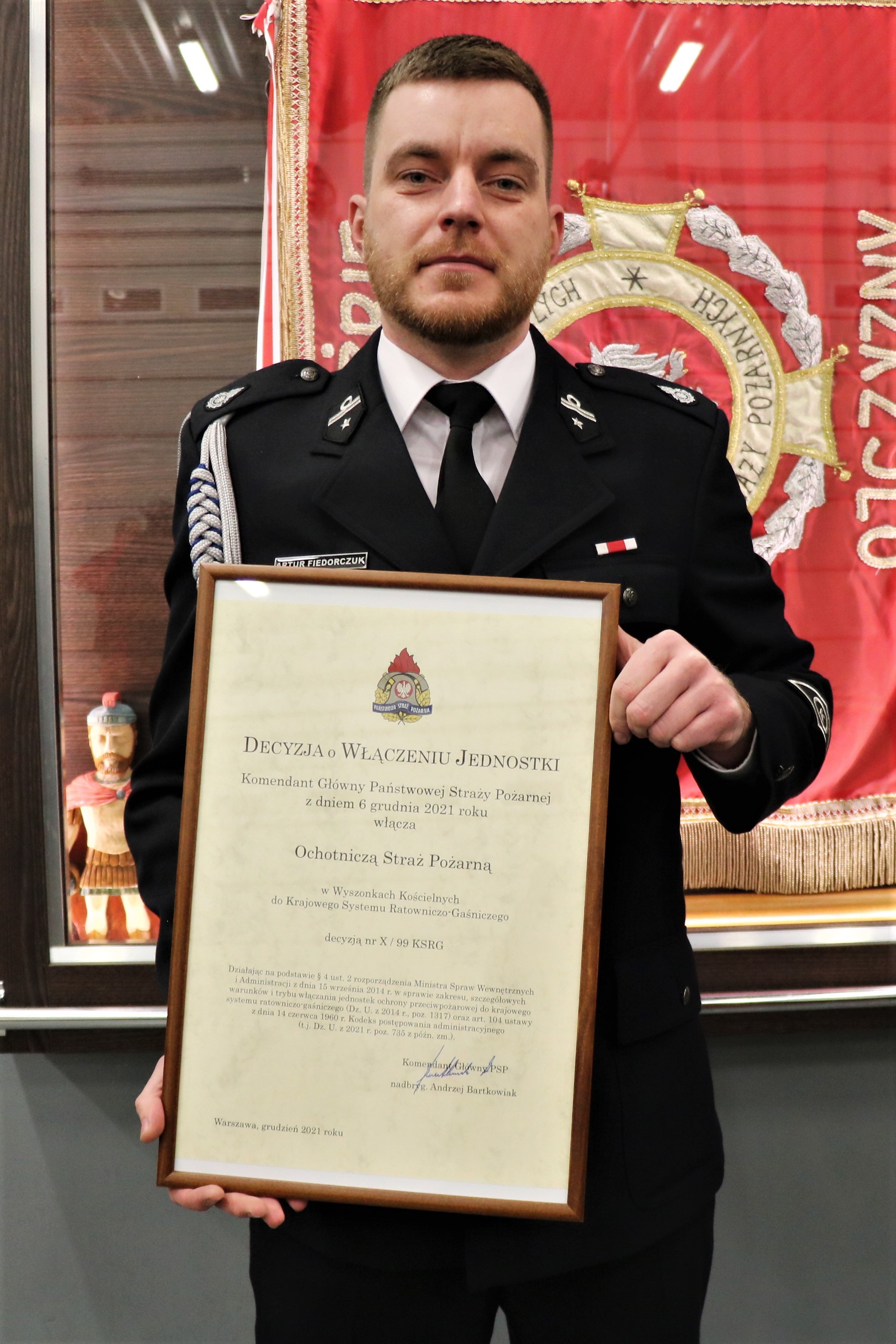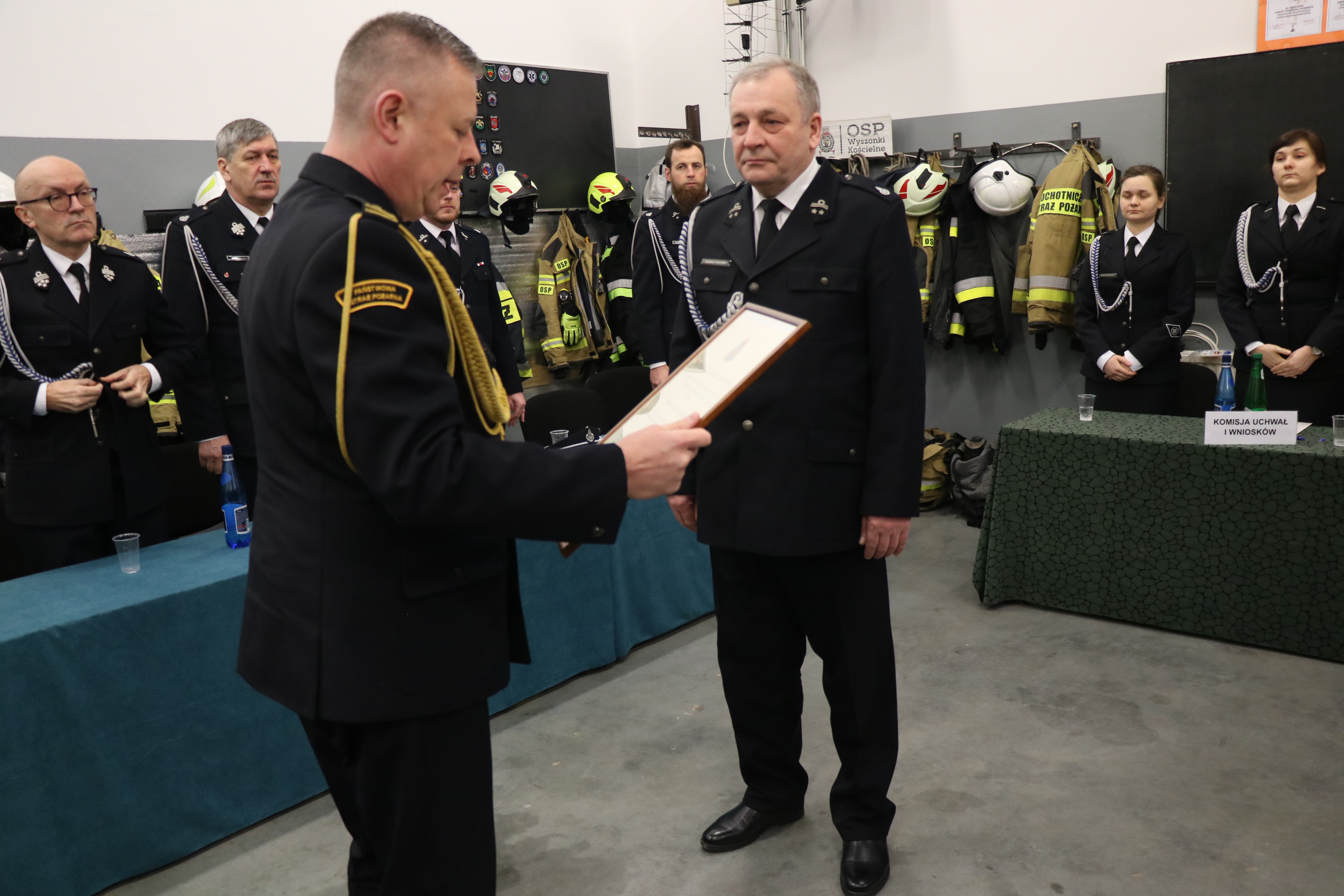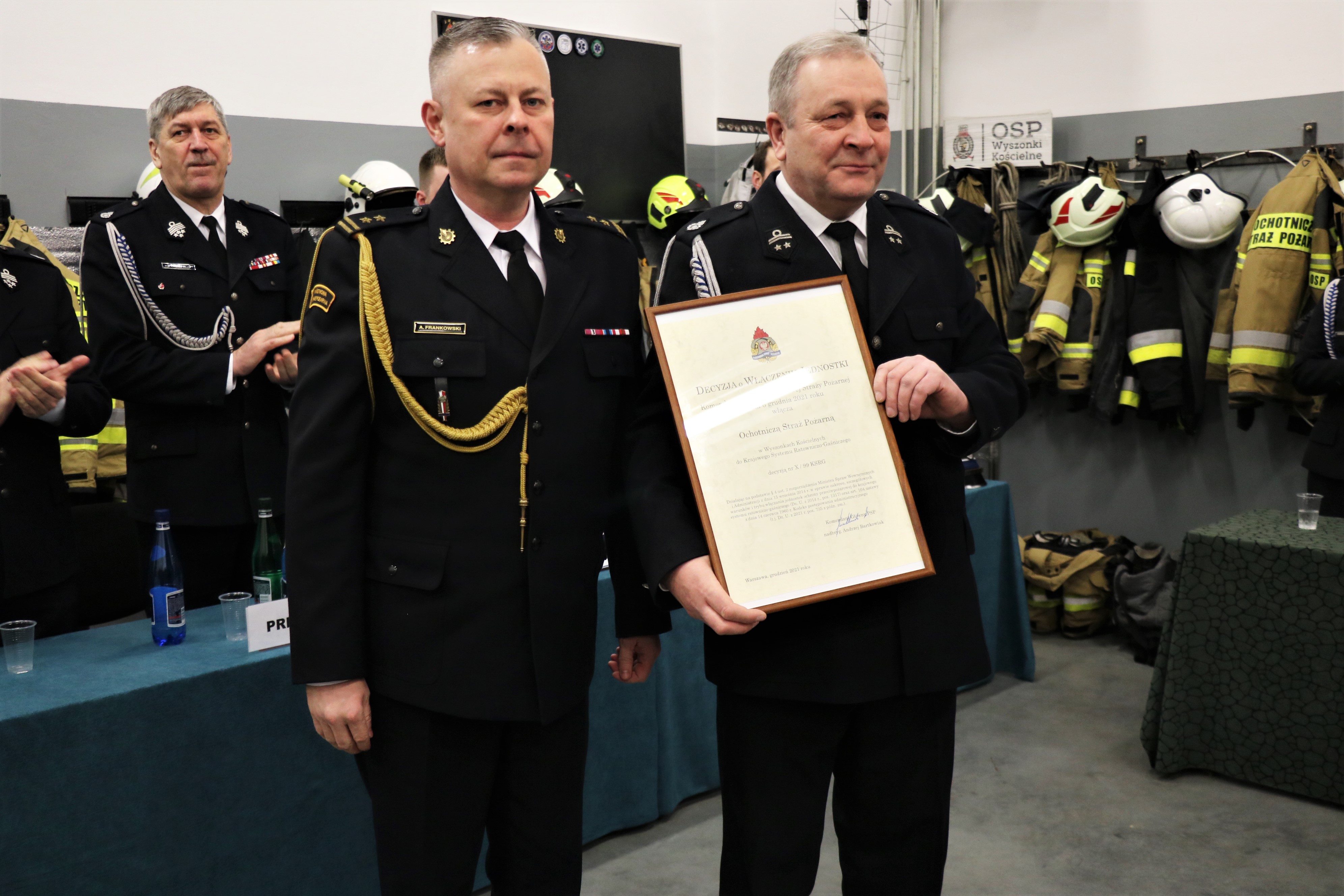 Bardzo istotnym, szczególnym i doniosłym elementem zebrania w OSP Wyszonkach Kościelnych był fakt wręczenia aktu włączenia do KSRG. Decyzją nr X/99 Komendanta Głównego PSP nadbryg. Andrzeja Bartkowiaka z dniem 6 grudnia 2021 roku jednostka OSP w Wyszonkach Kościelnych została włączona w struktury Krajowego Systemu Ratowniczo Gaśniczego. Uroczystego wręczenia atu dokonał Komendant Powiatowy PSP w Wysokiem Mazowieckiem bryg. Adam Frankowski. W zebraniu uczestniczyli również starosta wysokomazowiecki Pan Bogdan Zieliński, wójt gminy Klukowo Pan Piotr Uszyński, prezes podlaskiego Oddziału ZOSP RP Pan Andrzej Koc, prezes OSP gminy Klukowo druh Grzegorz Kulesza oraz zaproszeni goście. Jest to już 19 jednostka włączona do Krajowego Systemu Ratowniczo Gaśniczego w powiecie wysokomazowieckim Jesteśmy dumni z rozwoju jednostki oraz bardzo dobrej współpracy. Gratulujemy i życzymy dalszych sukcesów.