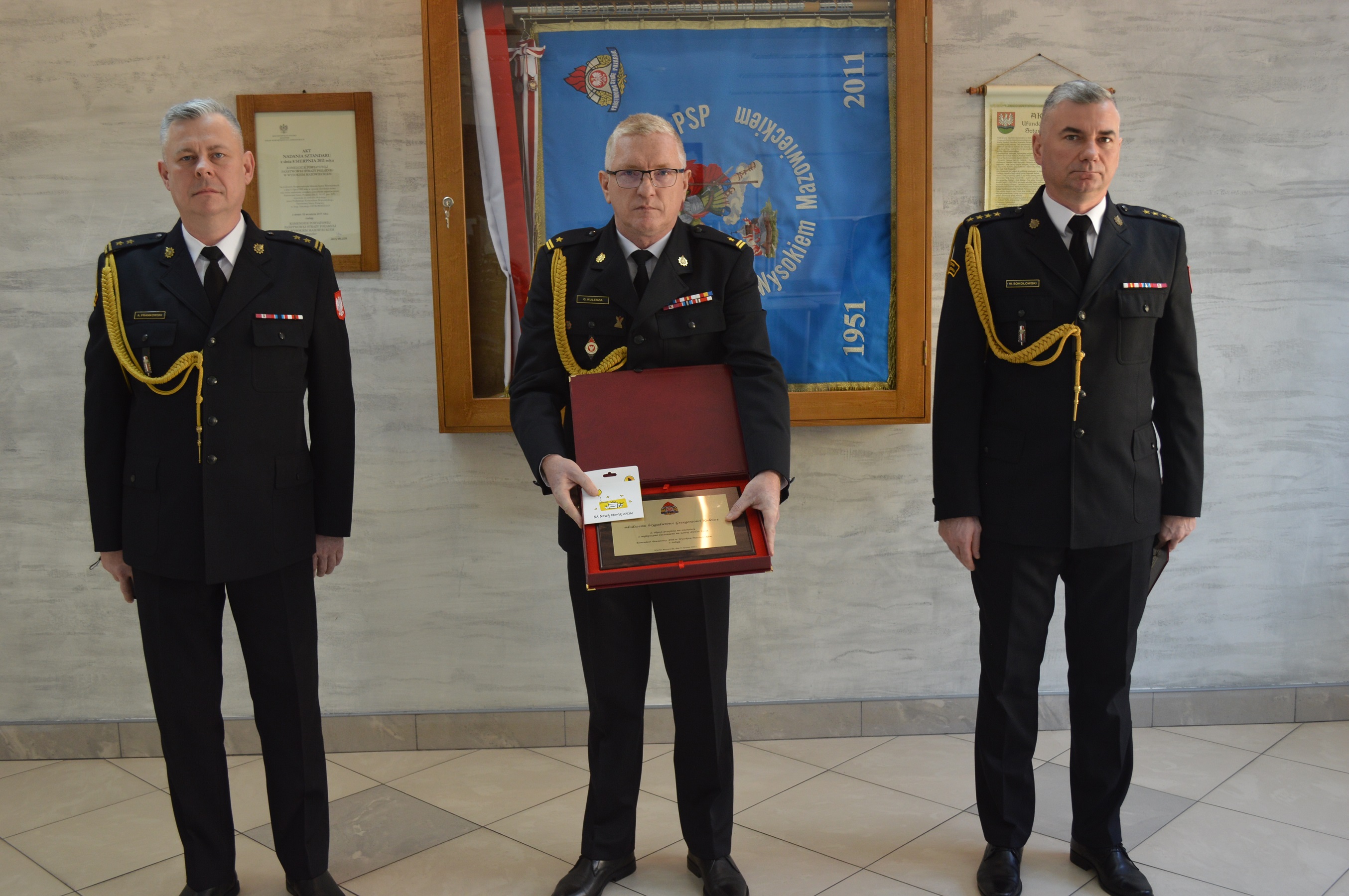 Komendant Powiatowy PSP w Wysokiem Mazowieckiem bryg. mgr inż. Adam Frankowski podziękował mł. bryg. inż. Grzegorzowi Kuleszy za wieloletnią służbą oraz życzył radości i realizacji planów na nowym etapie życia.