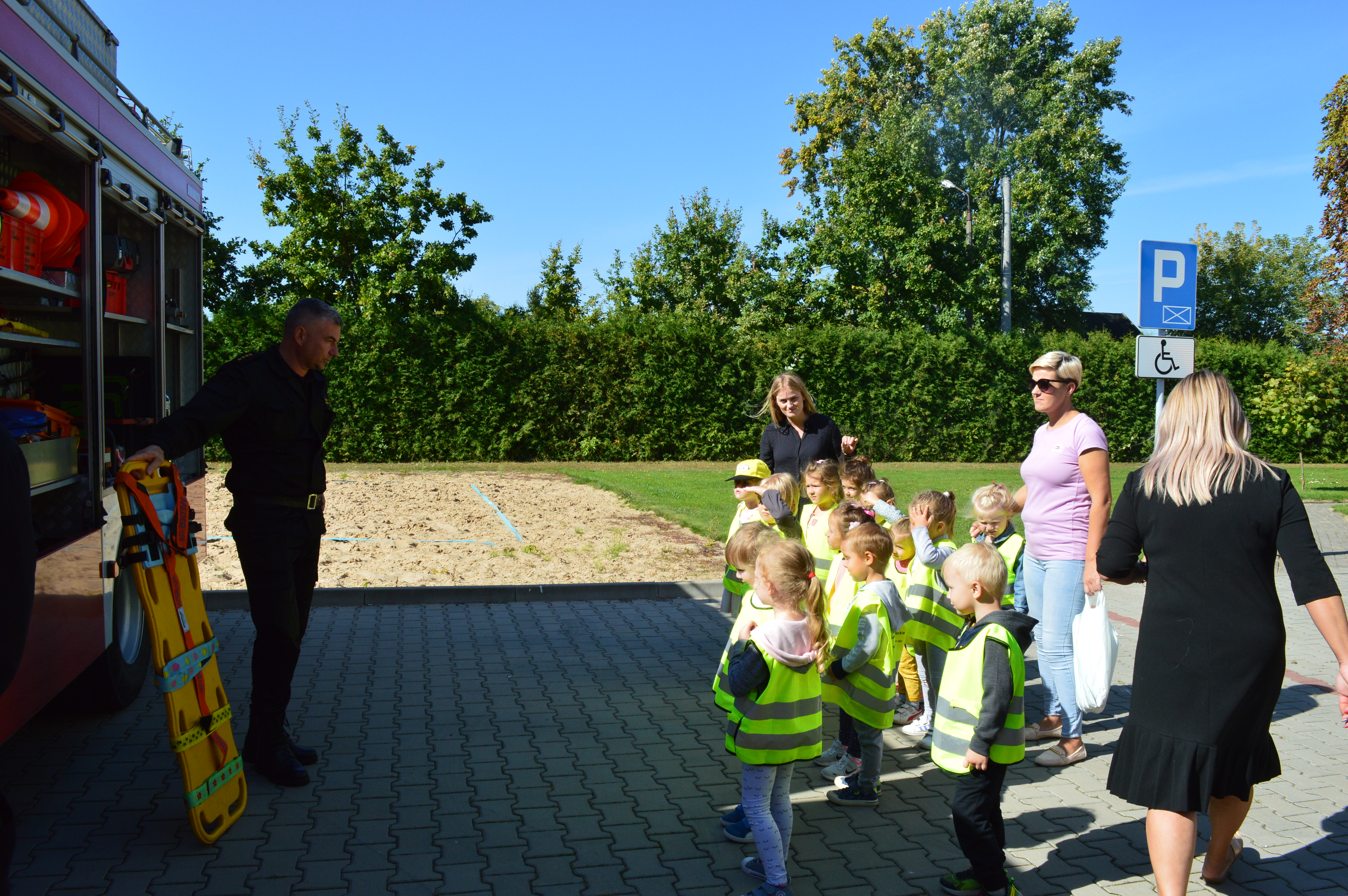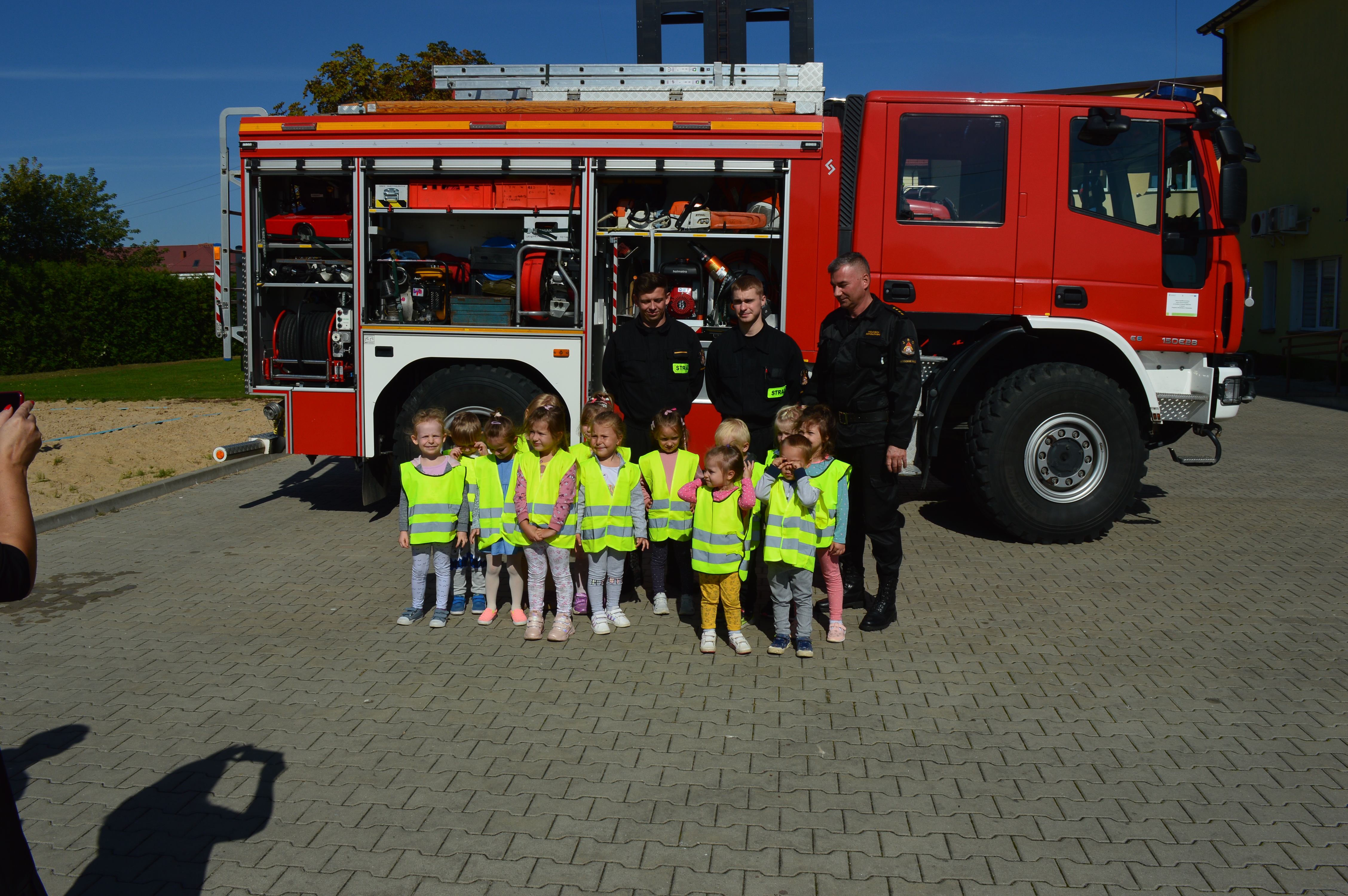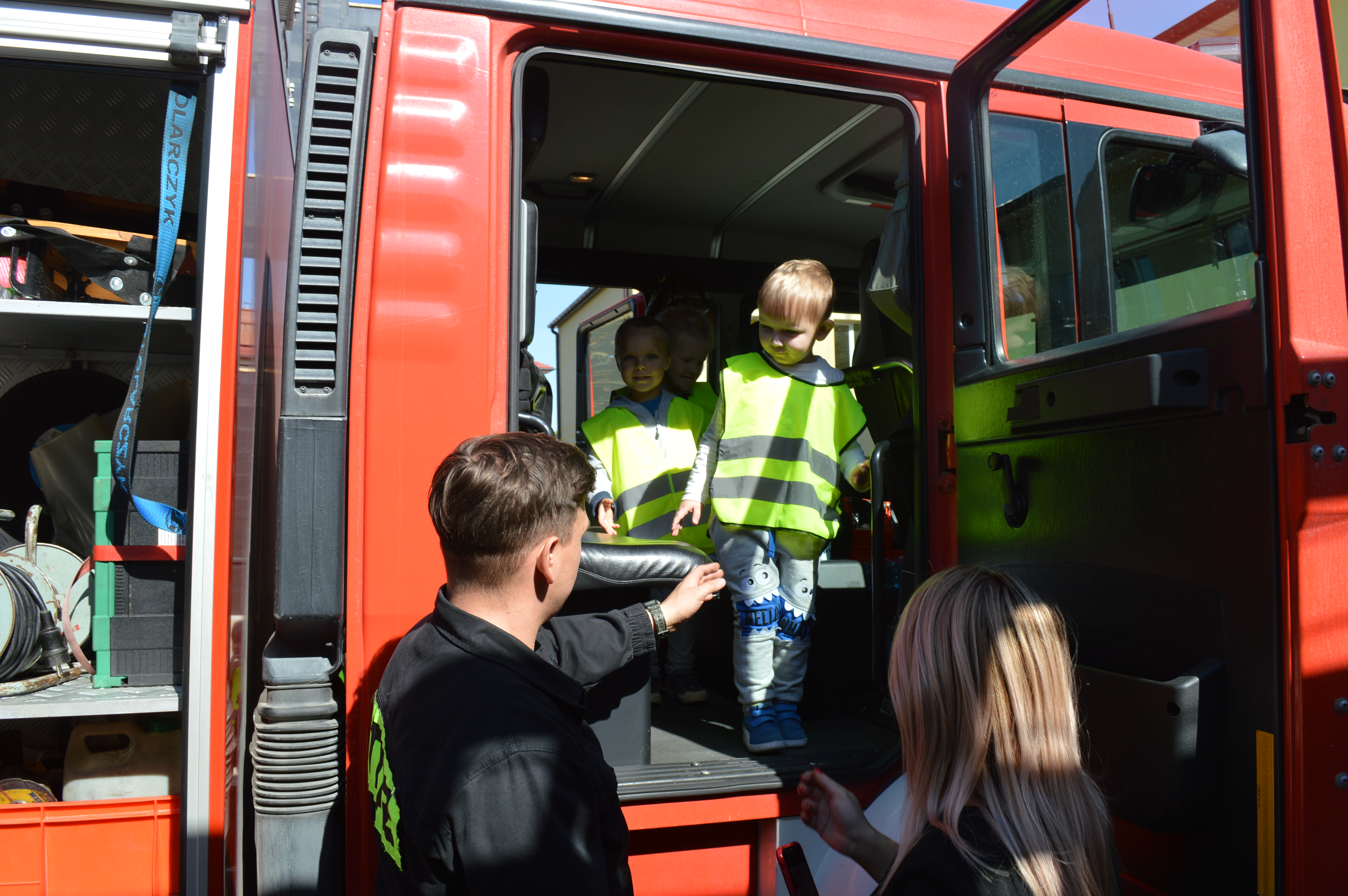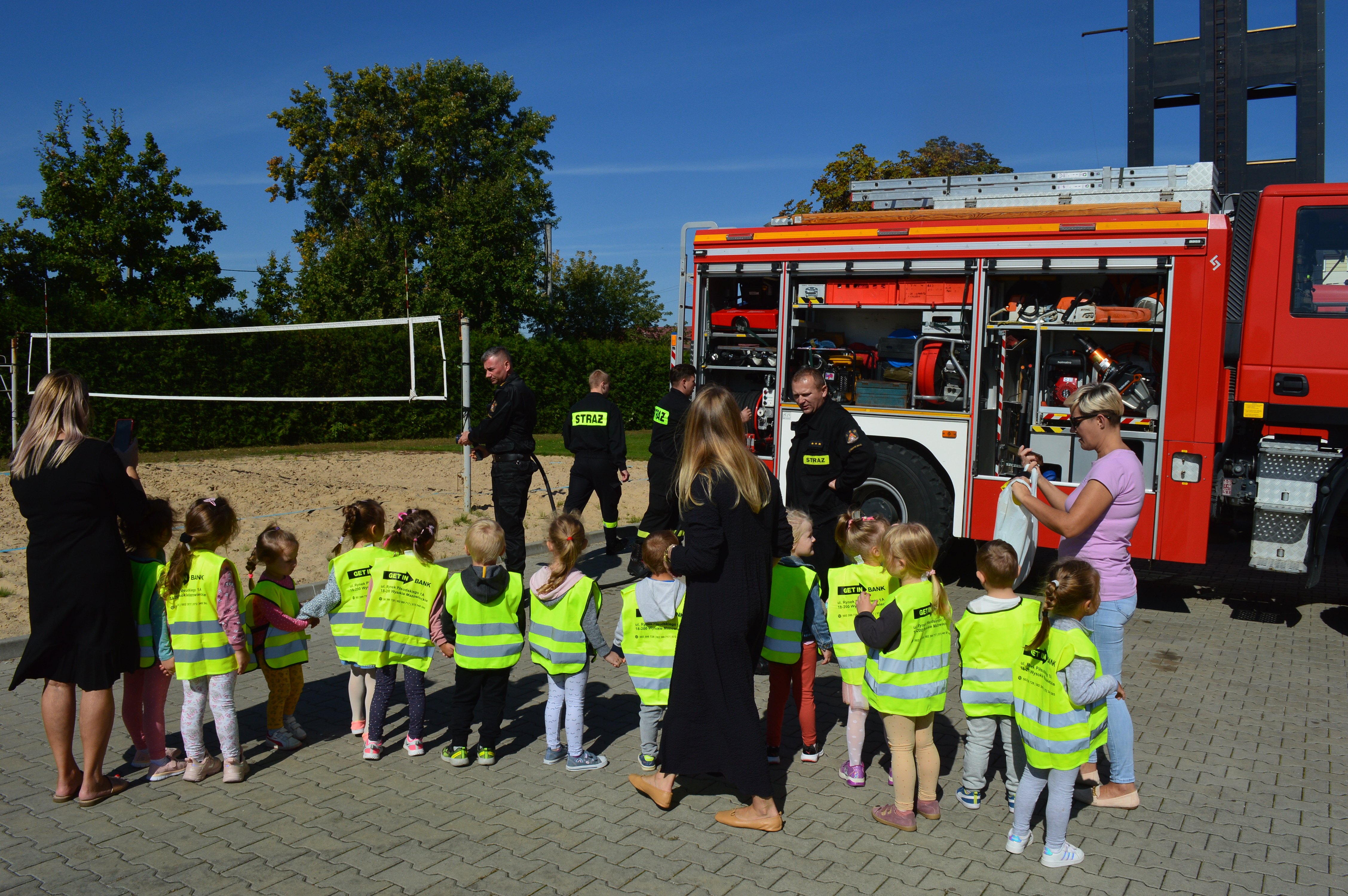 Duże zaineresowanie wśród dzieci wzbudziło wyposażenie sprzętowe strażaków jak również wozy strażackie. Dzieci miały możliwość zaobserwowania strażaków szykujących się do wyjazdu na akcję ratunkową, jak również podania wody na symulowany pożar.