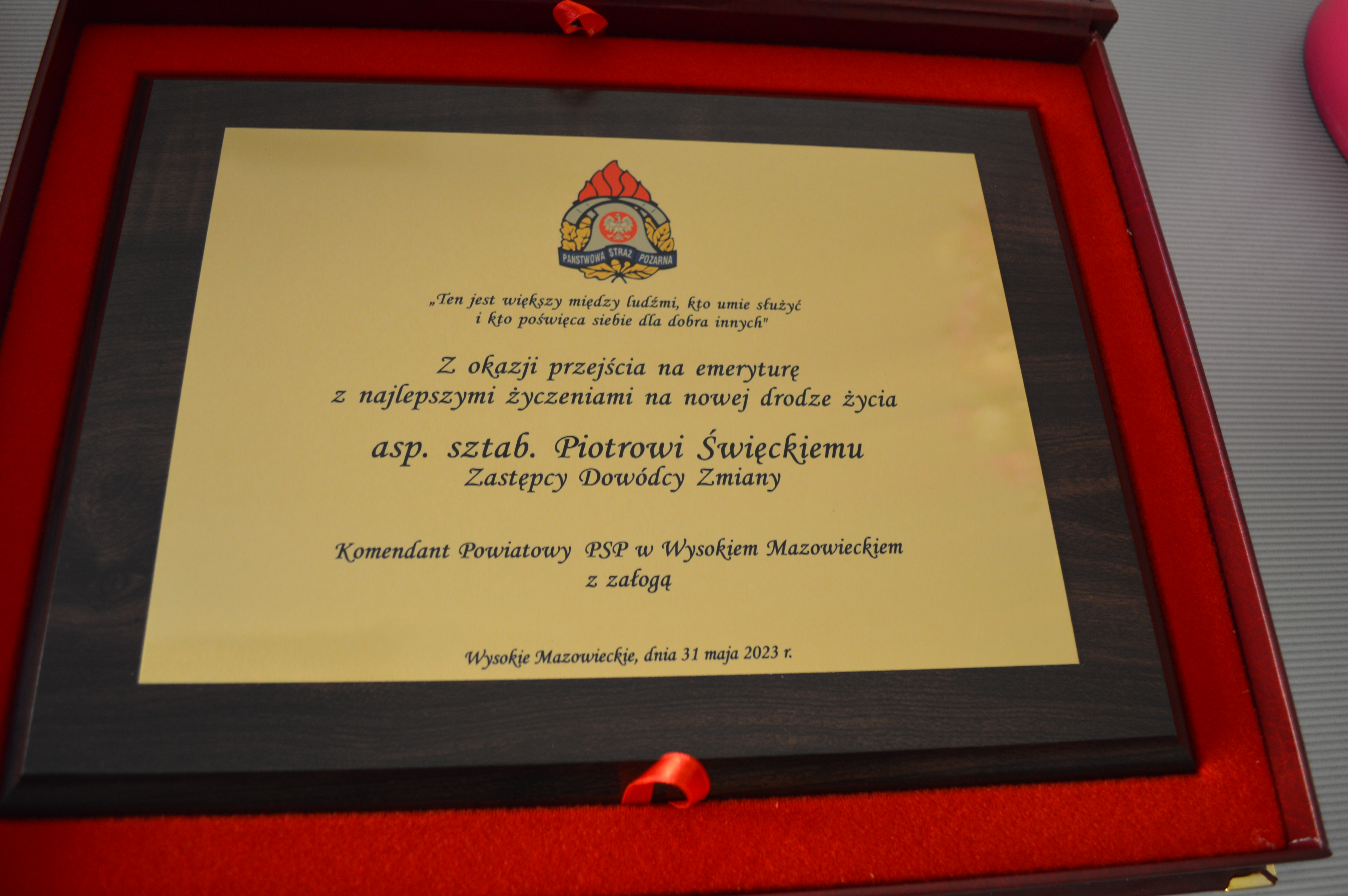 31 maja 2023 r. w świetlicy Komendy Powiatowej PSP w Wysokiem Mazowieckiem odbyło się uroczyste pożegnanie ze służbą asp. sztab. Piotra Święckiego.