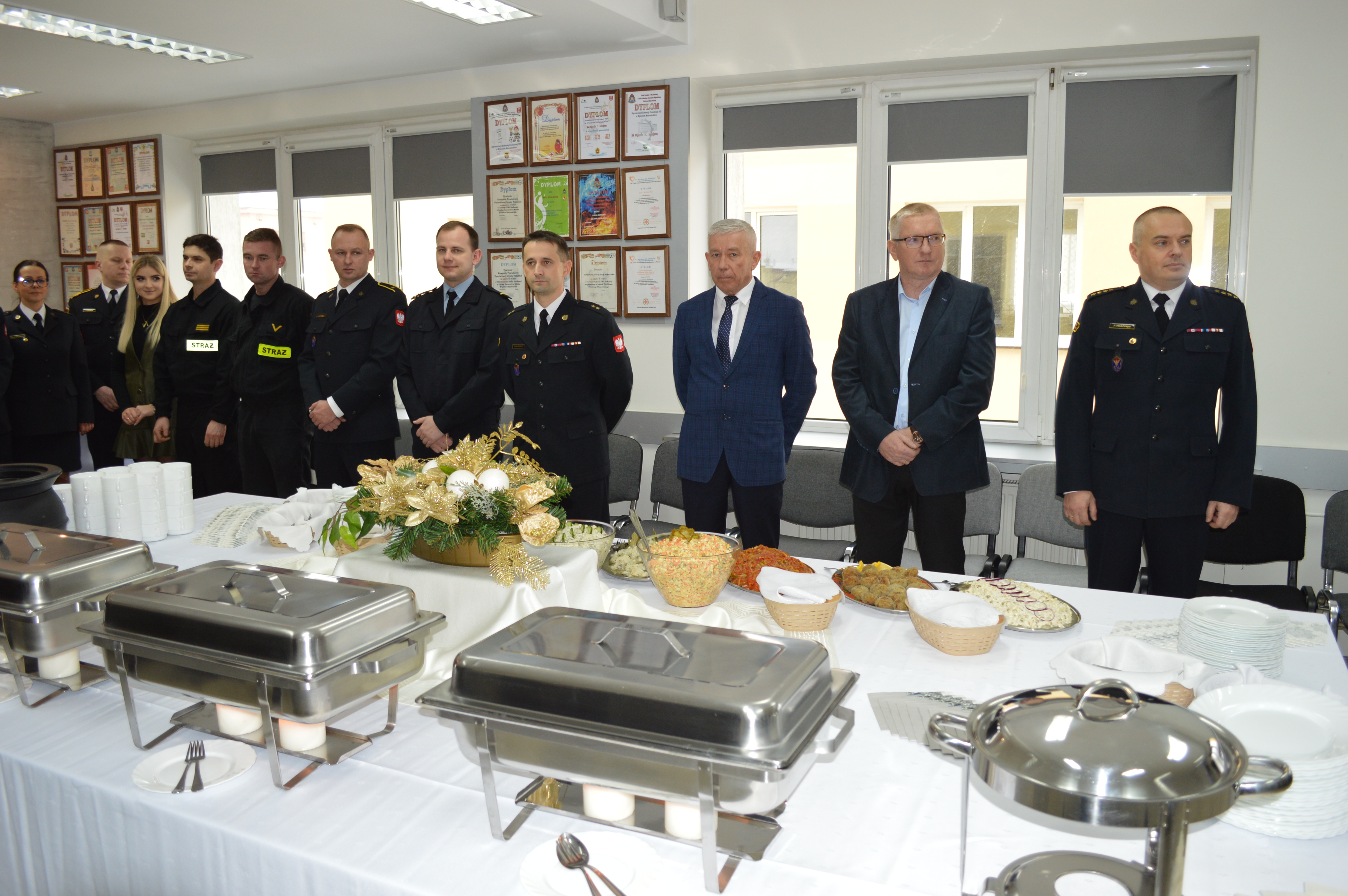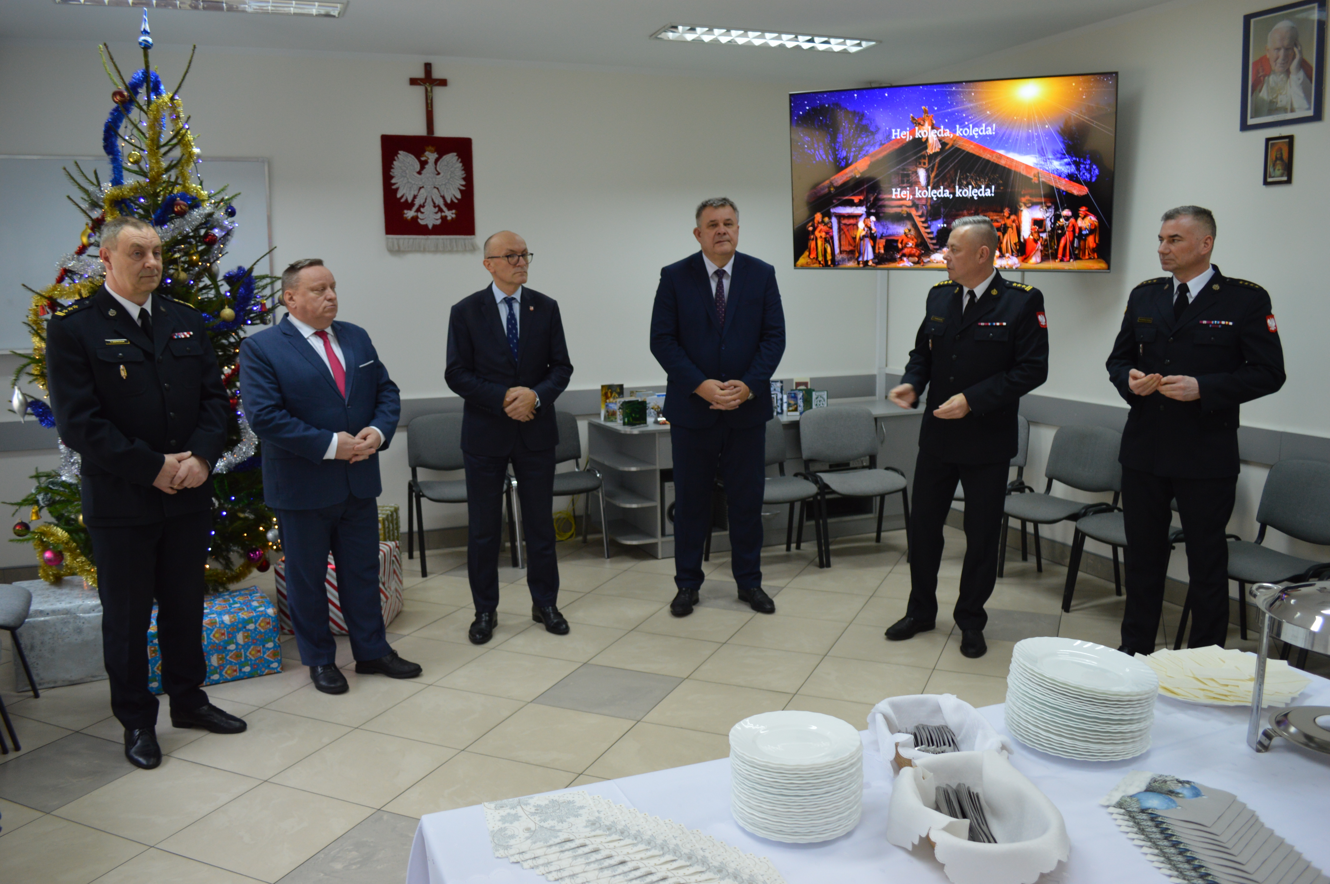 16 grudnia 2022 roku w Komendzie Powiatowej Państwowej Straży Pożarnej w Wysokiem Mazowieckiem, w związku z nadchodzącymi Świętami Bożego Narodzenia, odbyło się uroczyste spotkanie opłatkowe. Uczestniczyli w nim Komendant Powiatowy PSP st. bryg. Adam Frankowski, Zastępca Komendanta Powiatowego PSP st. kpt. Wojciech Sokołowski, strażacy i pracownicy Komendy Powiatowej PSP w Wysokiem Mazowieckiem oraz zaproszeni goście, wśród których obecni byli m.in.: Starosta Wysokomazowiecki Bogdan Zieliński, Burmistrz Miasta Wysokie Mazowieckie Jarosław Siekierko, Wójt Gminy Wysokie Mazowieckie Krzysztof Krajewski oraz przewodniczący Związku Emerytów i Rencistów Pożarnictwa w Wysokiem Mazowieckiem asp. sztab. Sławomir Uszyński.