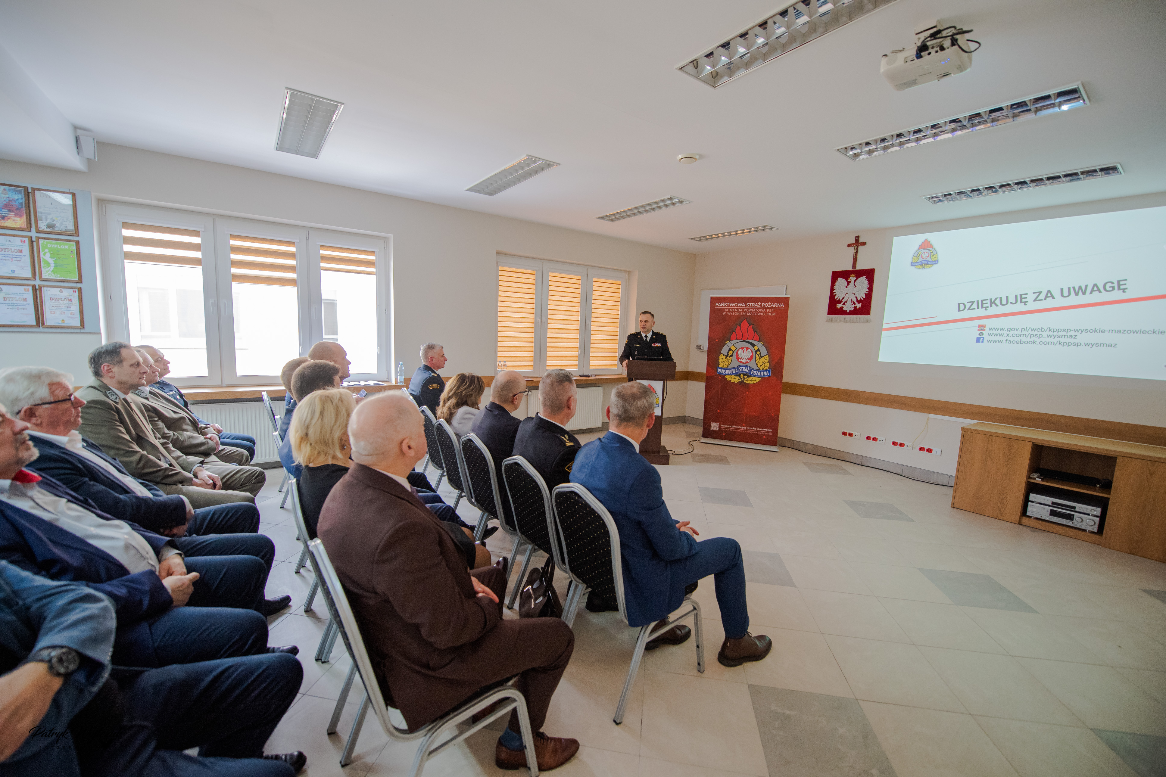 Po zakończeniu uroczystej zbiórki, na sali konferencyjnej Komendy Powiatowej PSP odbyło się podsumowanie funkcjonowania ochrony przeciwpożarowej na szczeblu powiatu w 2025 r., które przedstawił mł. bryg. Wojciech Sokołowski – Komendant Powiatowy PSP w Wysokiem Mazowieckiem.