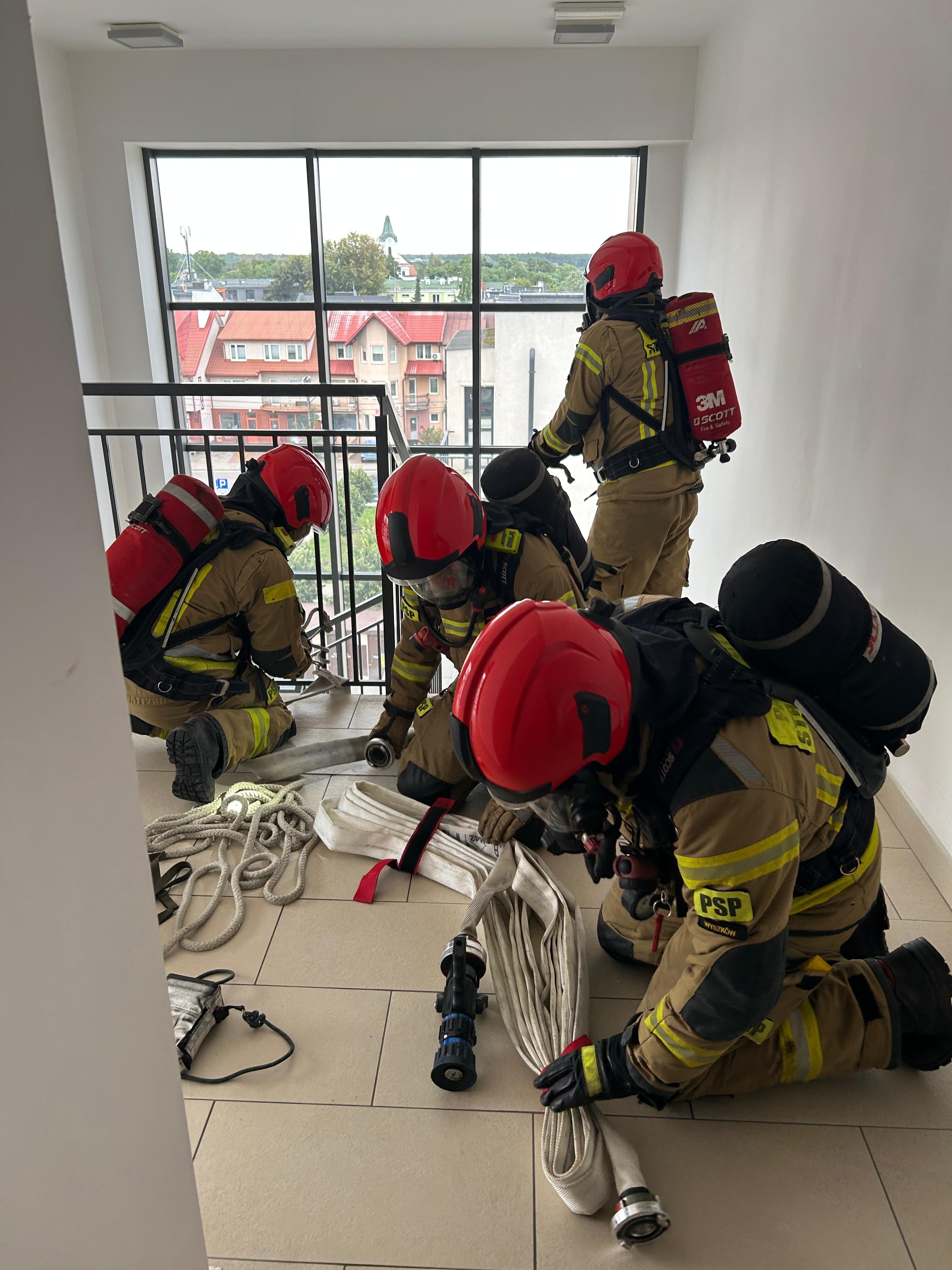 W ramach ćwiczeń trenowaliśmy prowadzenie linii gaśniczych po klatkach schodowych, wykonaliśmy rozpoznanie obiektu w tym zaopatrzenia wodnego oraz rozstawiliśmy podnośnik, który mógłby zostać wykorzystany do ewakuacji osób z wyższych pięter.