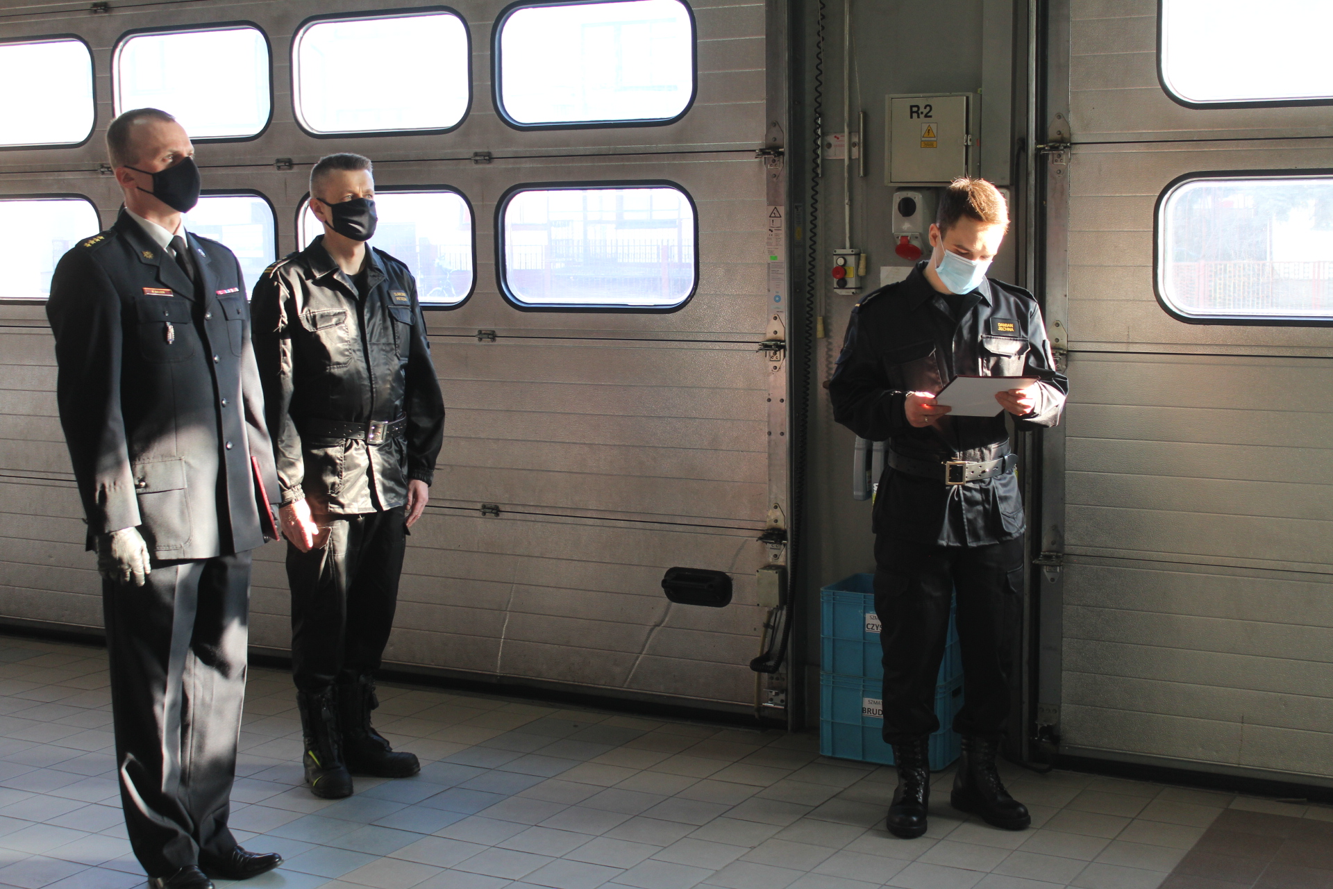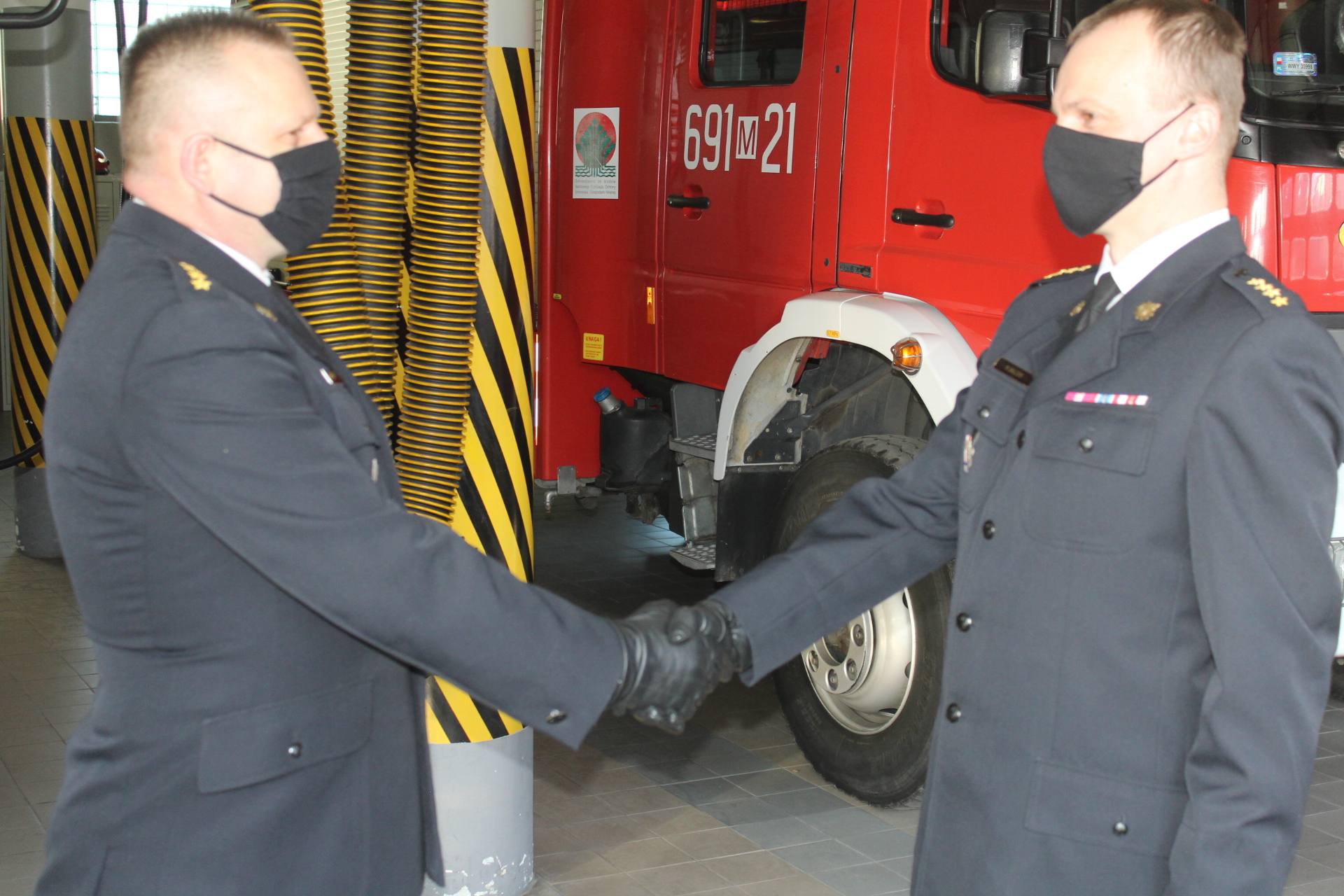 Uroczystego wręczenia aktu mianowania dokonał podczas uroczystej zbiórki st. kpt. Rafał Balcer Komendant Powiatowy Państwowej Straży Pożarnej w Wyszkowie, w obecności swojego Zastępcy st. bryg. Sławomira Pietrzaka oraz zmian służbowych JRG.