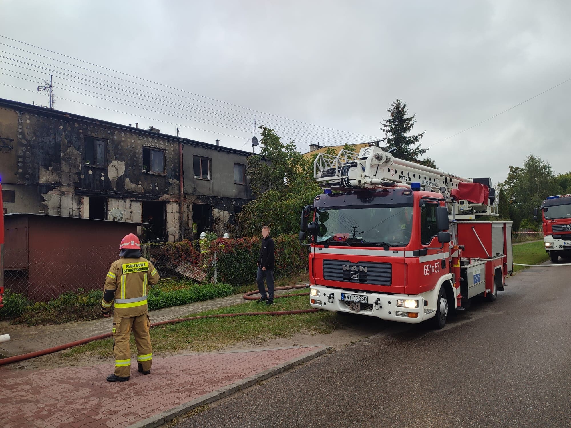 Po przybyciu na miejsce zdarzenia i przeprowadzeniu rozpoznania ustalono, że pali się jednopiętrowy budynek wielorodzinny. W chwili przyjazdu pierwszego zastępu pożar był już w fazie rozwiniętej. Ogień obejmował 2 mieszkania na parterze, przylegające do nich dwa drewniane tarasy oraz częściowo elewację budynku. Na klatce schodowej panowało intensywne zadymienie. W momencie powstania pożaru w bloku przebywało 12 osób. Wszyscy ewakuowali się samodzielnie lub z pomocą osób postronnych.
