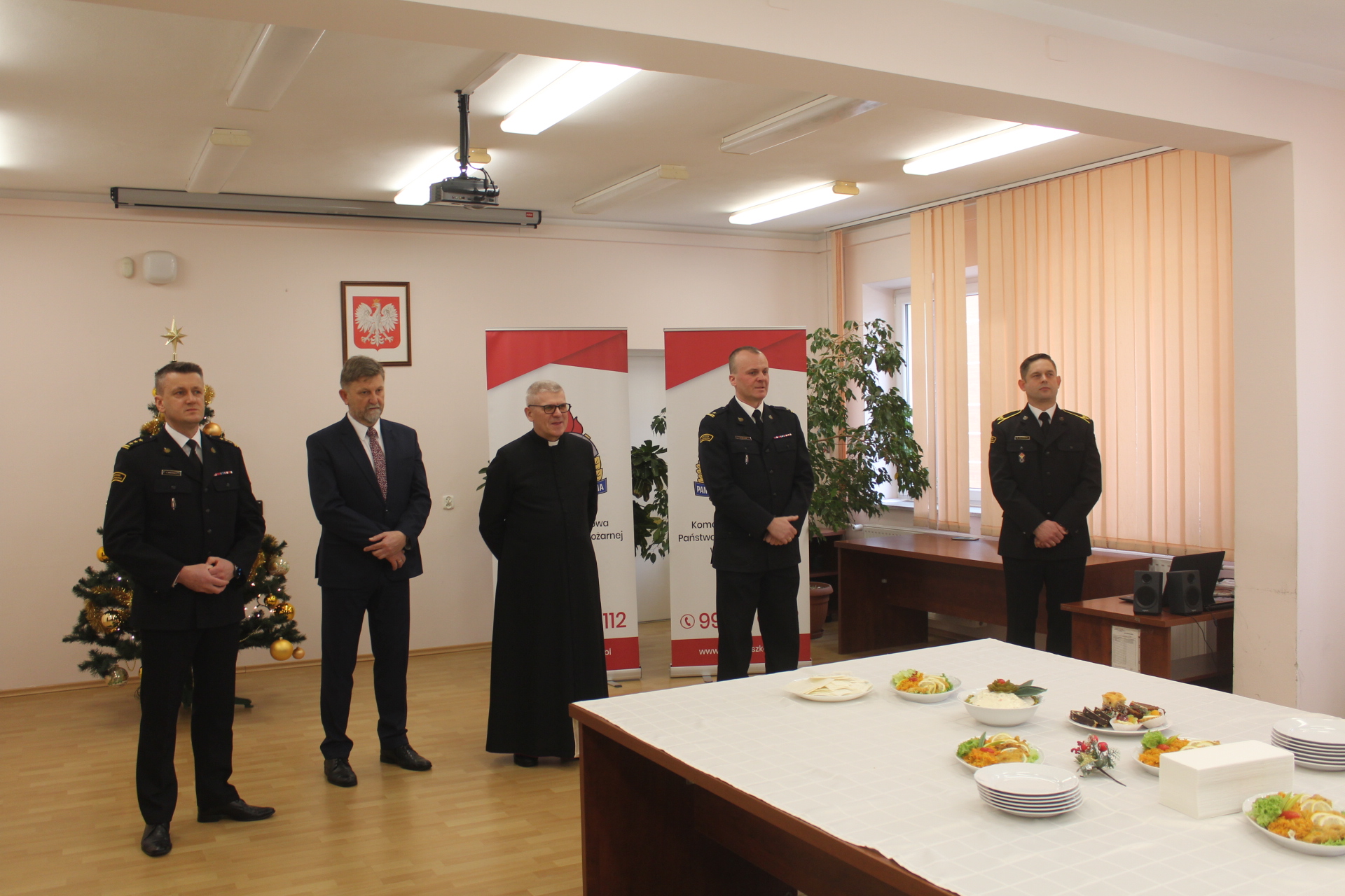 Uczestnikom spotkania Słowo Boże przybliżył powiatowy kapelan strażaków ks. kan. dr Zdzisław Golan. Po życzeniach pracownicy oraz zaproszeni goście przełamali się opłatkiem życząc sobie nawzajem zdrowia, radości oraz ciepłej i rodzinnej atmosfery. Przy świątecznej choince i kolędach wszyscy przystąpili do spożywania wigilijnych potraw.