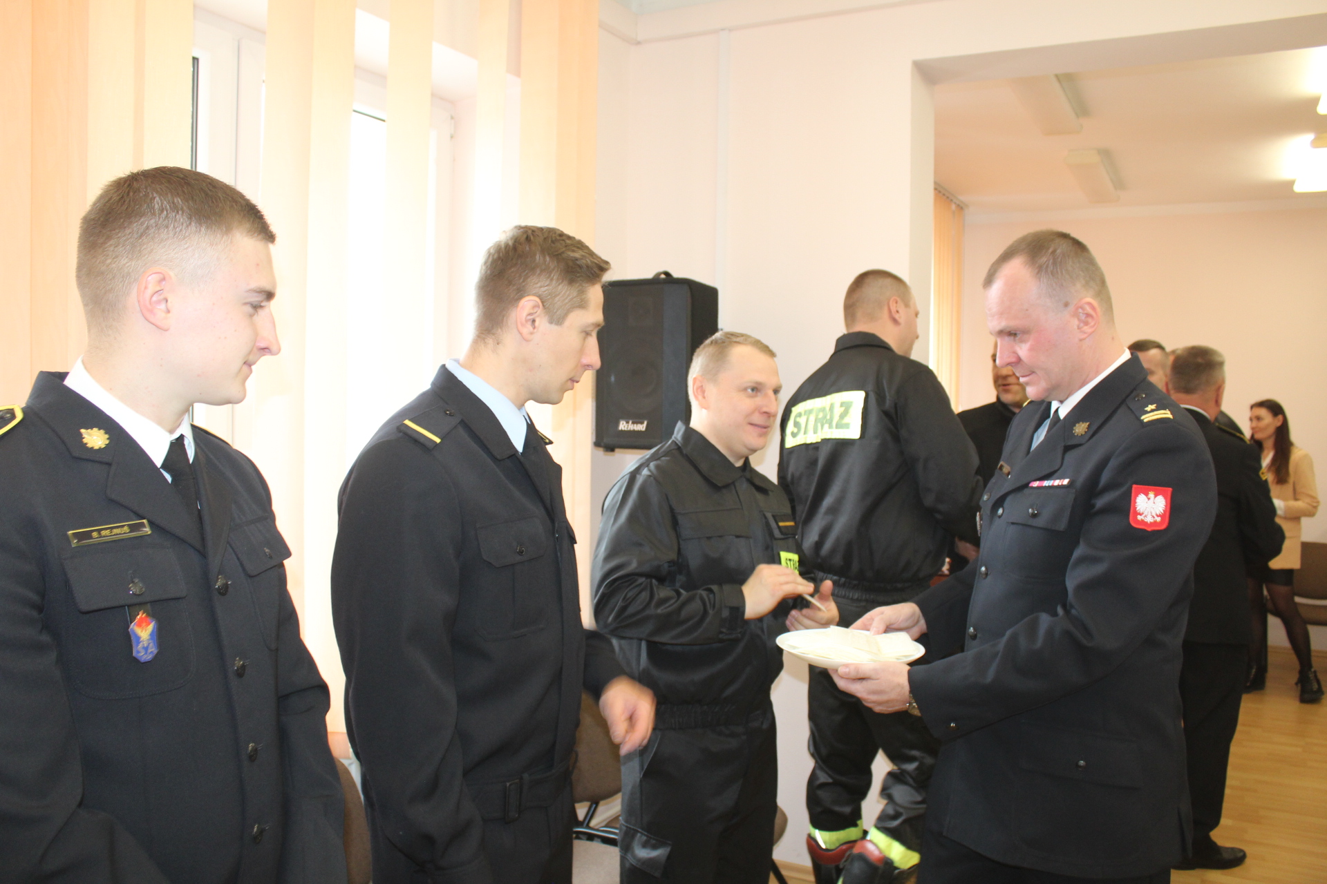 Komendant Powiatowy PSP mł. bryg. Rafał Balcer przywitał funkcjonariuszy KP PSP w Wyszkowie oraz przybyłych gości. Podziękował pracownikom cywilnym, funkcjonariuszom za wspólną pracę w minionym roku oraz złożył wszystkim życzenia z okazji zbliżających się Świąt Bożego Narodzenia.