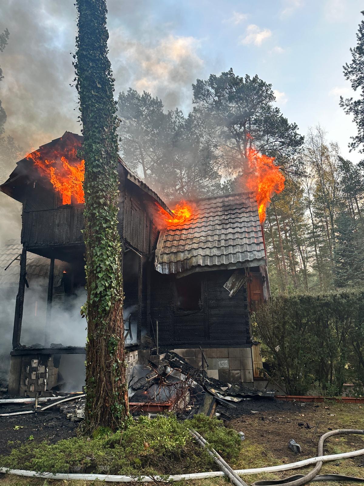 Po przybyciu na miejsce zdarzenia i przeprowadzeniu rozpoznania ustalono, że pali się drewniany domek letniskowy. W chwili przyjazdu pierwszego zastępu pożar był już w fazie rozwiniętej. Widoczne były ogień i zadymienie wydobywające się spod dachu. Na zewnątrz znajdowała się jedna poszkodowana osoba, która przekazała informację o jeszcze dwóch osobach w środku.