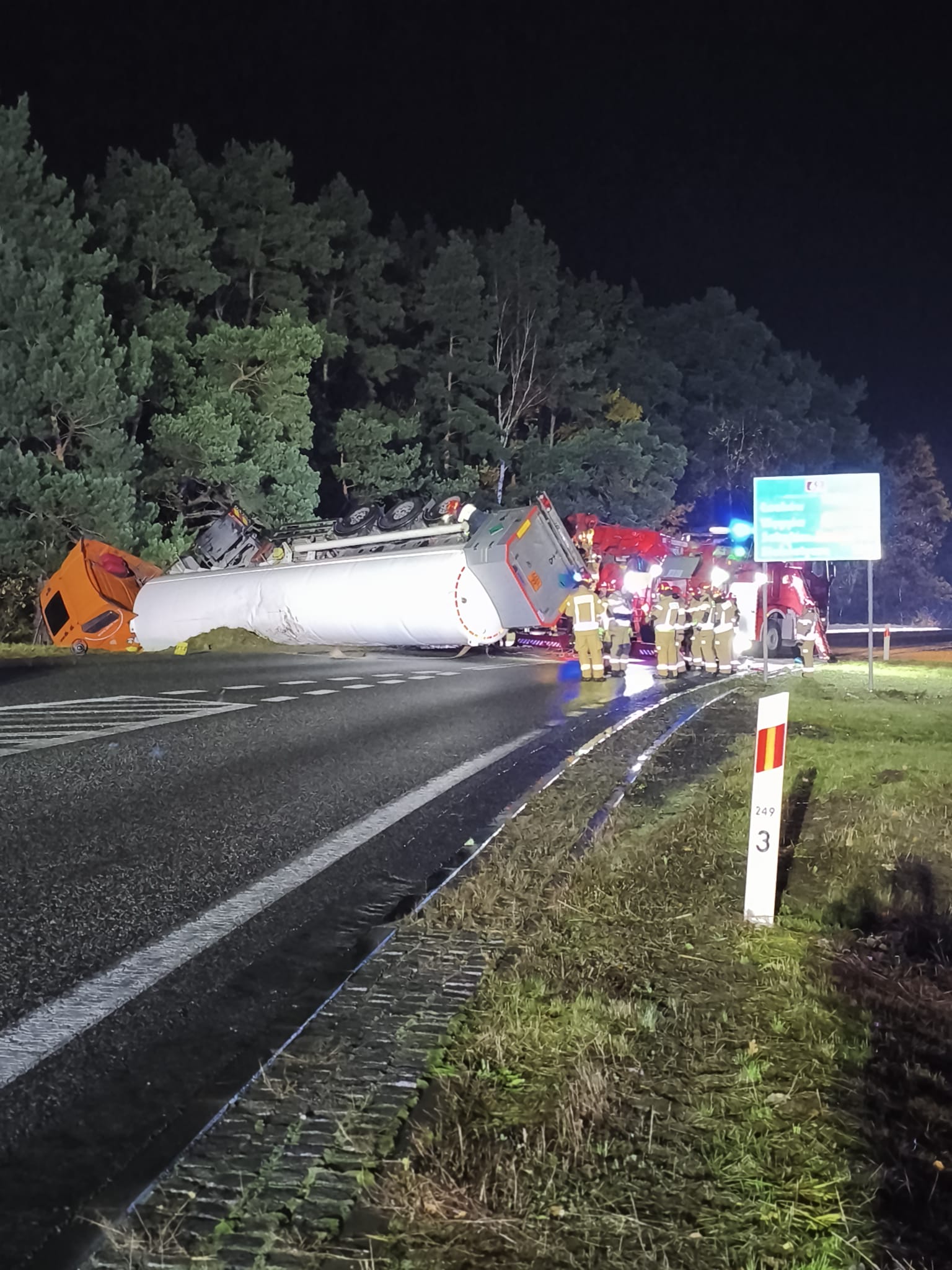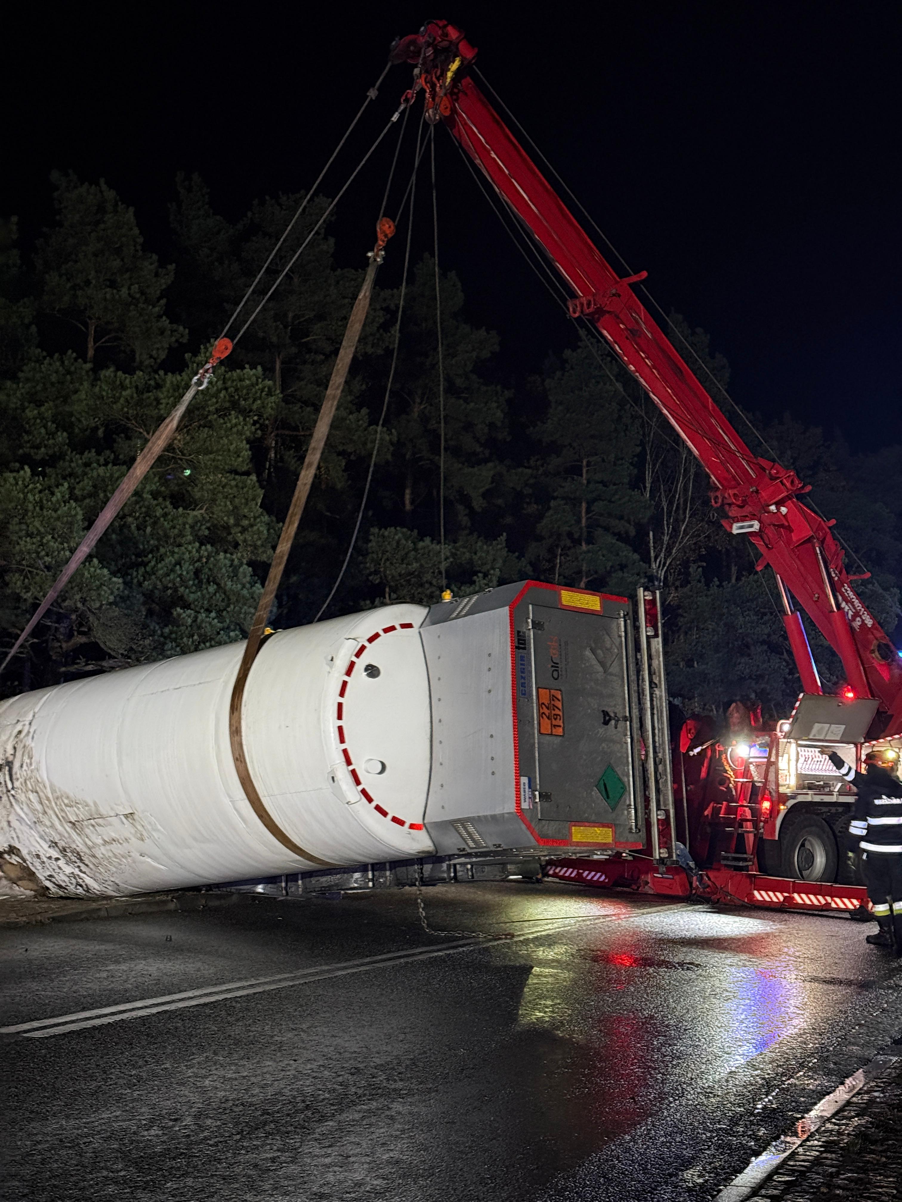 Po przybyciu na miejsce zdarzenia i przeprowadzeniu rozpoznania potwierdzono informację ze zgłoszenia. Cysterna ze skroplonym azotem leżała na boku, blokując ruch na drodze. Kierowca z lekkimi obrażeniami opuścił pojazd z pomocą osób postronnych. Nie stwierdzono rozszczelnienia zbiornika i wycieku transportowanego gazu.