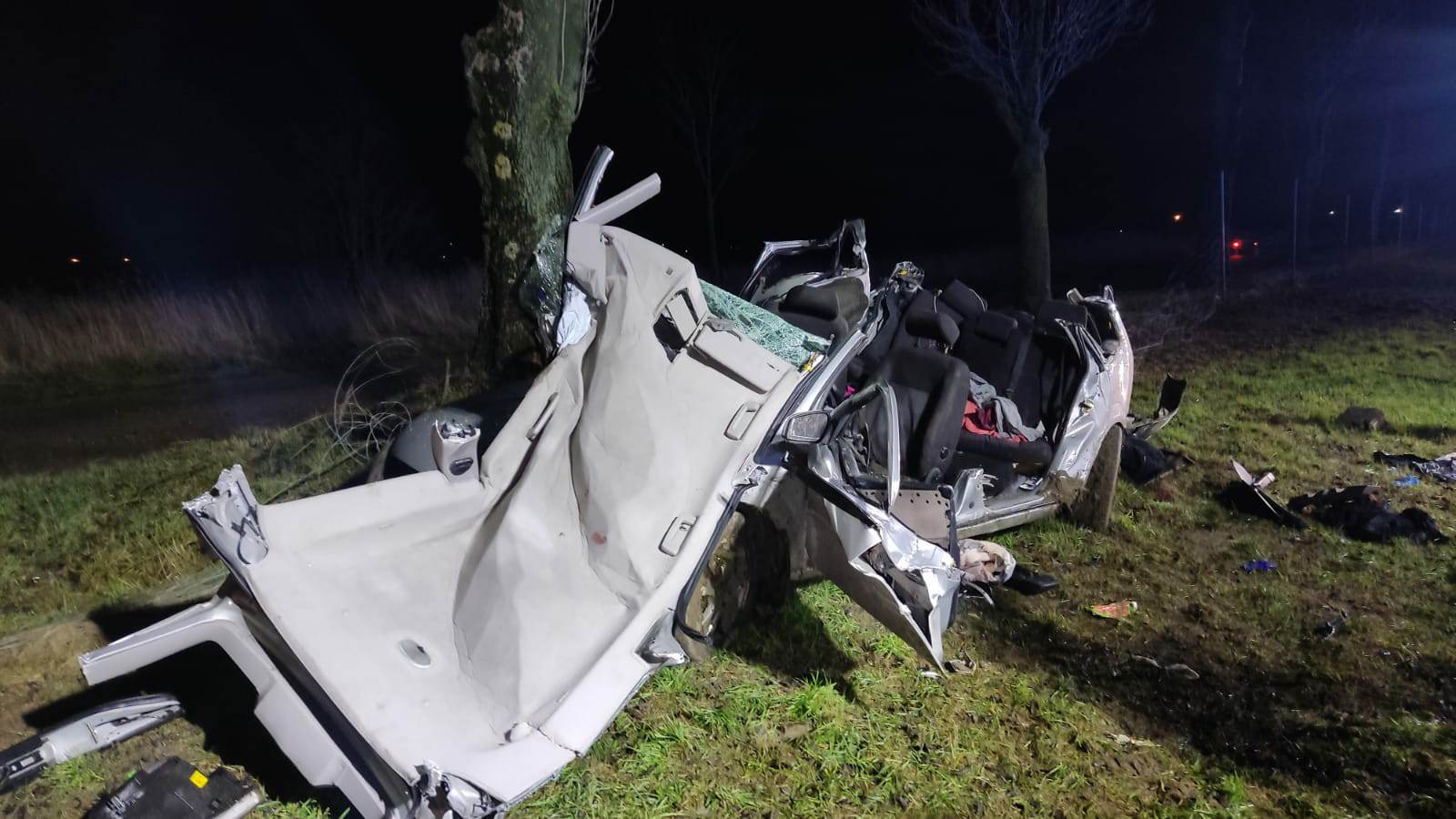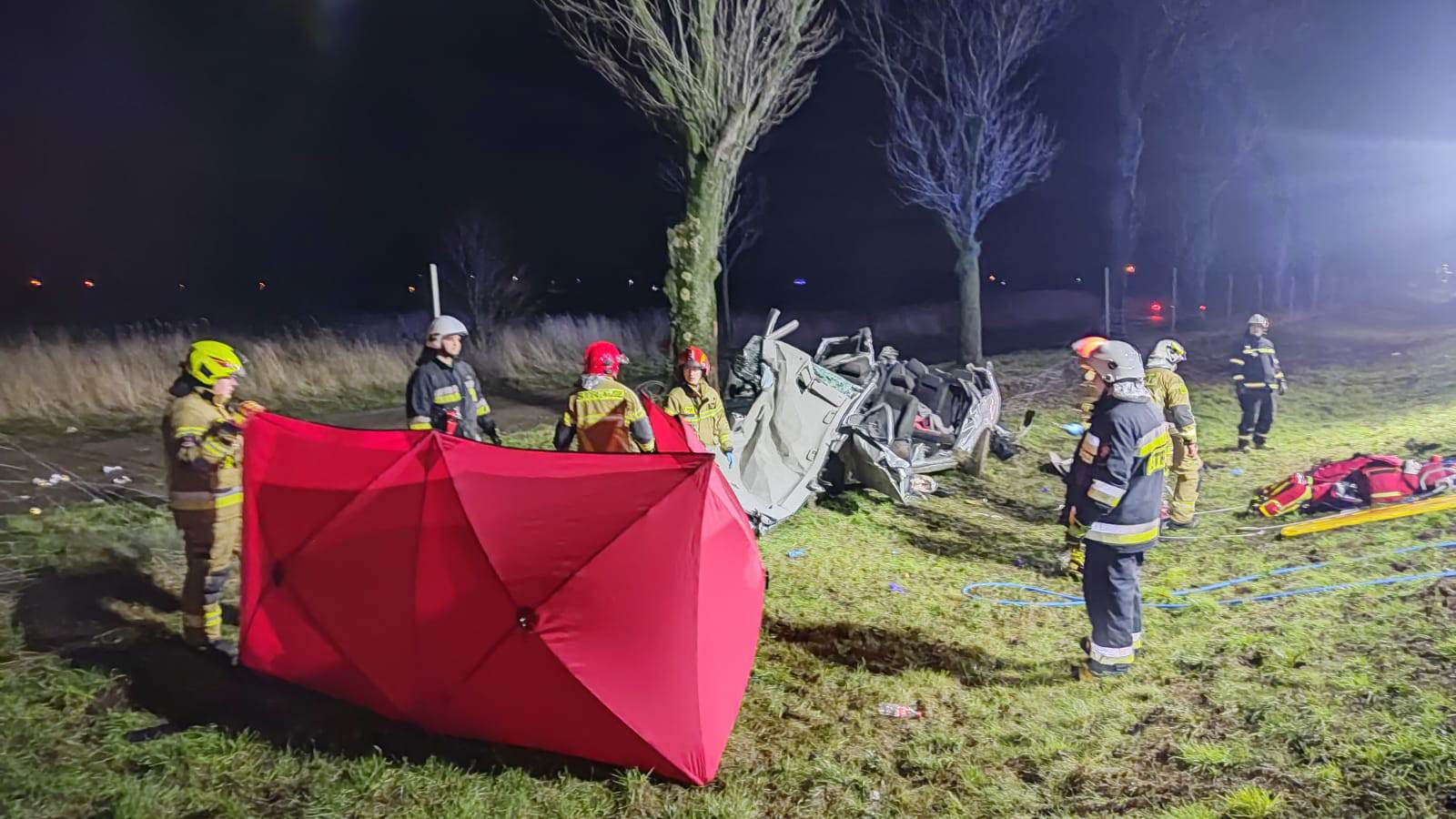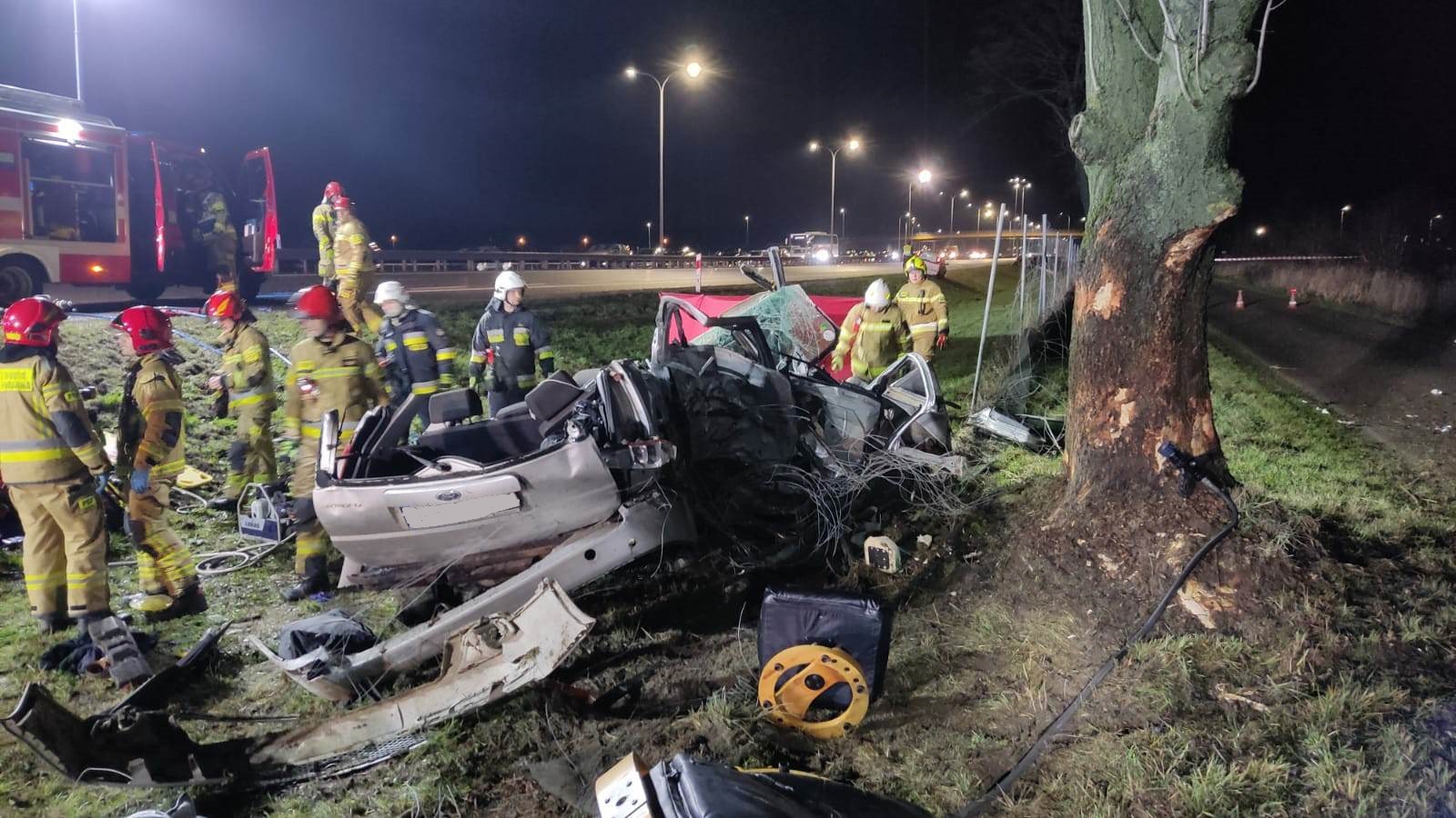 Po przybyciu na miejsce zdarzenia i przeprowadzeniu rozpoznania ustalono, że samochód osobowy zjechał z jezdni i uderzył w drzewo. W chwili przybycia pierwszego zastępu 4 osoby znajdowały się w środku. W pierwszej kolejności działania straży polegały na zabezpieczeniu miejsca zdarzenia, wykonaniu dostępu do osób poszkodowanych przy użyciu narzędzi hydraulicznych, ewakuacji na zewnątrz i przekazaniu Zespołom Ratownictwa Medycznego. Dwie osoby zostały przetransportowane do szpitali. Natomiast wobec pozostałych dwóch ratownicy medyczni rozpoznali zgon. Pozostałe działania polegały na oświetleniu i zabezpieczeniu miejsca zdarzenia podczas wykonywania czynności przez pozostałe służby.