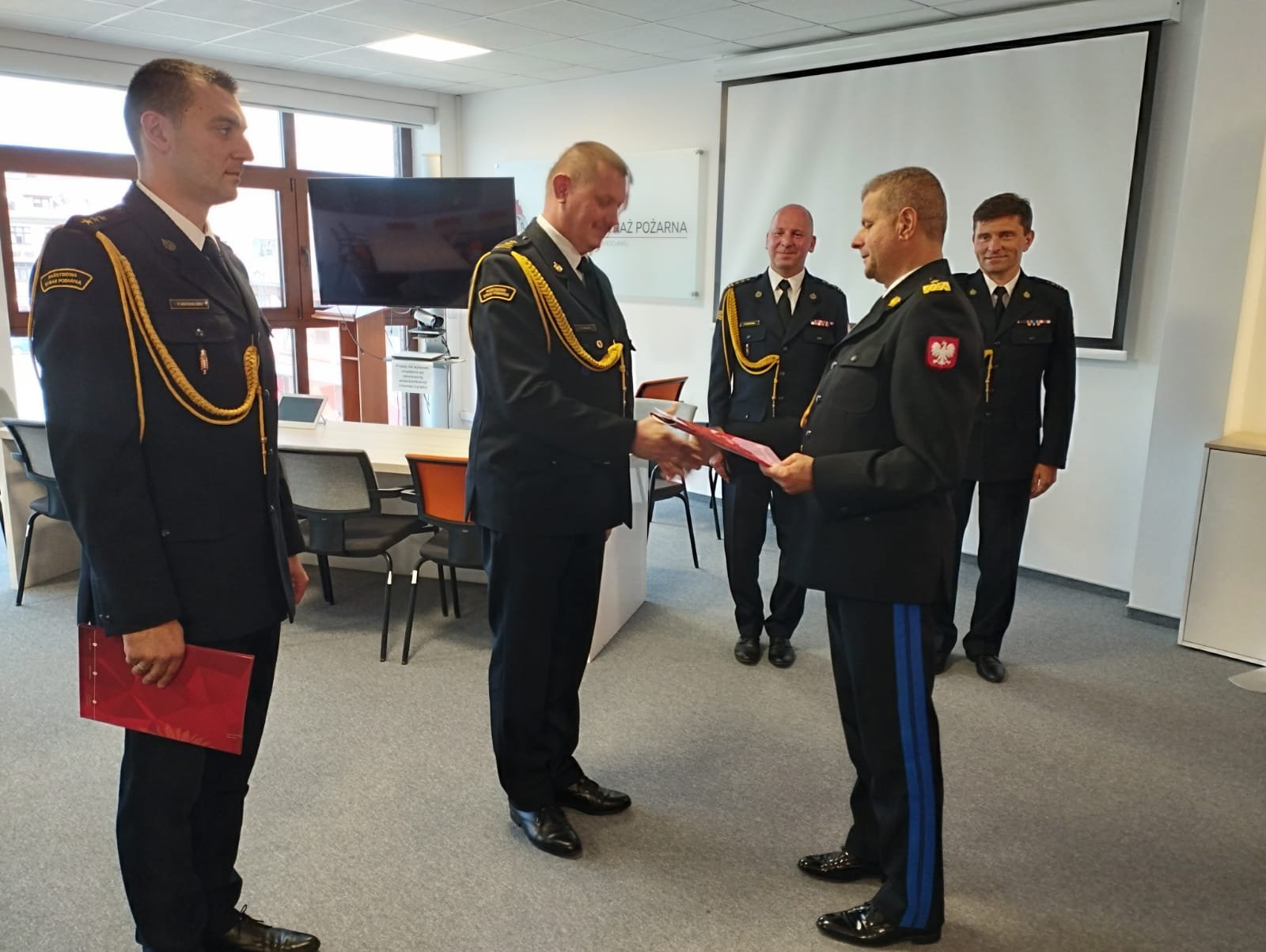 W uroczystości powołania na wyższe stanowiska służbowe udział wzięli bryg. Tomasz Mądry Komendant Powiatowy PSP w Ząbkowicach Śląskich, st. bryg. Paweł Dziadosz Komendant Powiatowy PSP w Głogowie oraz st. kpt. Przemysław Wróbel Naczelnik Wydziału Kadr KW PSP we Wrocławiu.