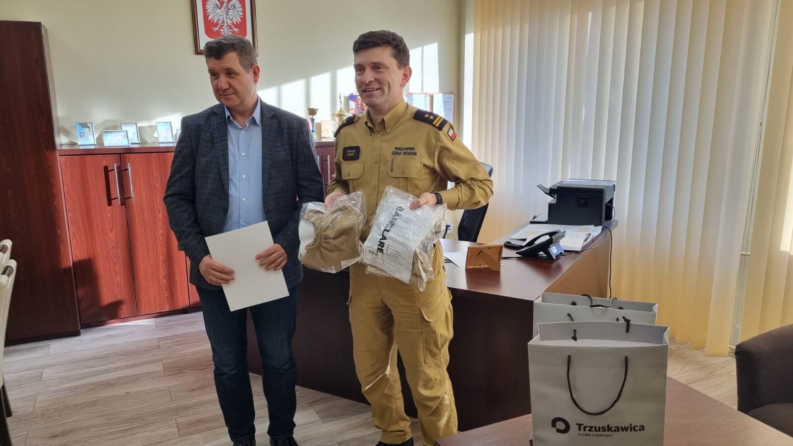 W imieniu Zarzadu z rak Panów Krzysztofa Woś Kierownika Ruchu Zakładu Górniczego Kopalni Bazaltu ,,TARGOWICA" oraz Kamila Litak Specjalisty ds. BHP i Ochrony Środowiska Kopalni Bazaltu ,,TARGOWICA" otrzymaliśmy 15 sztuk kominiarek strażackich.