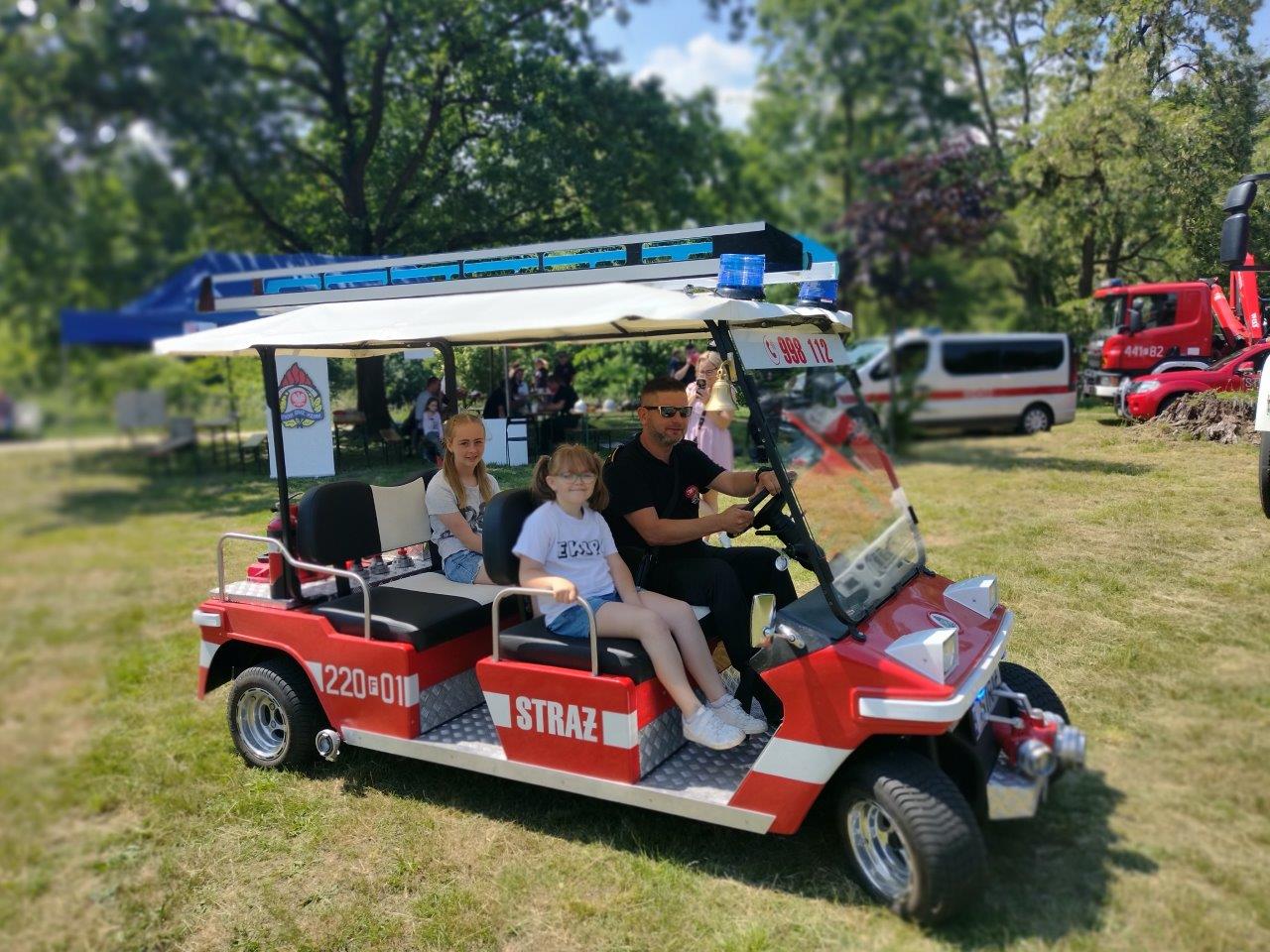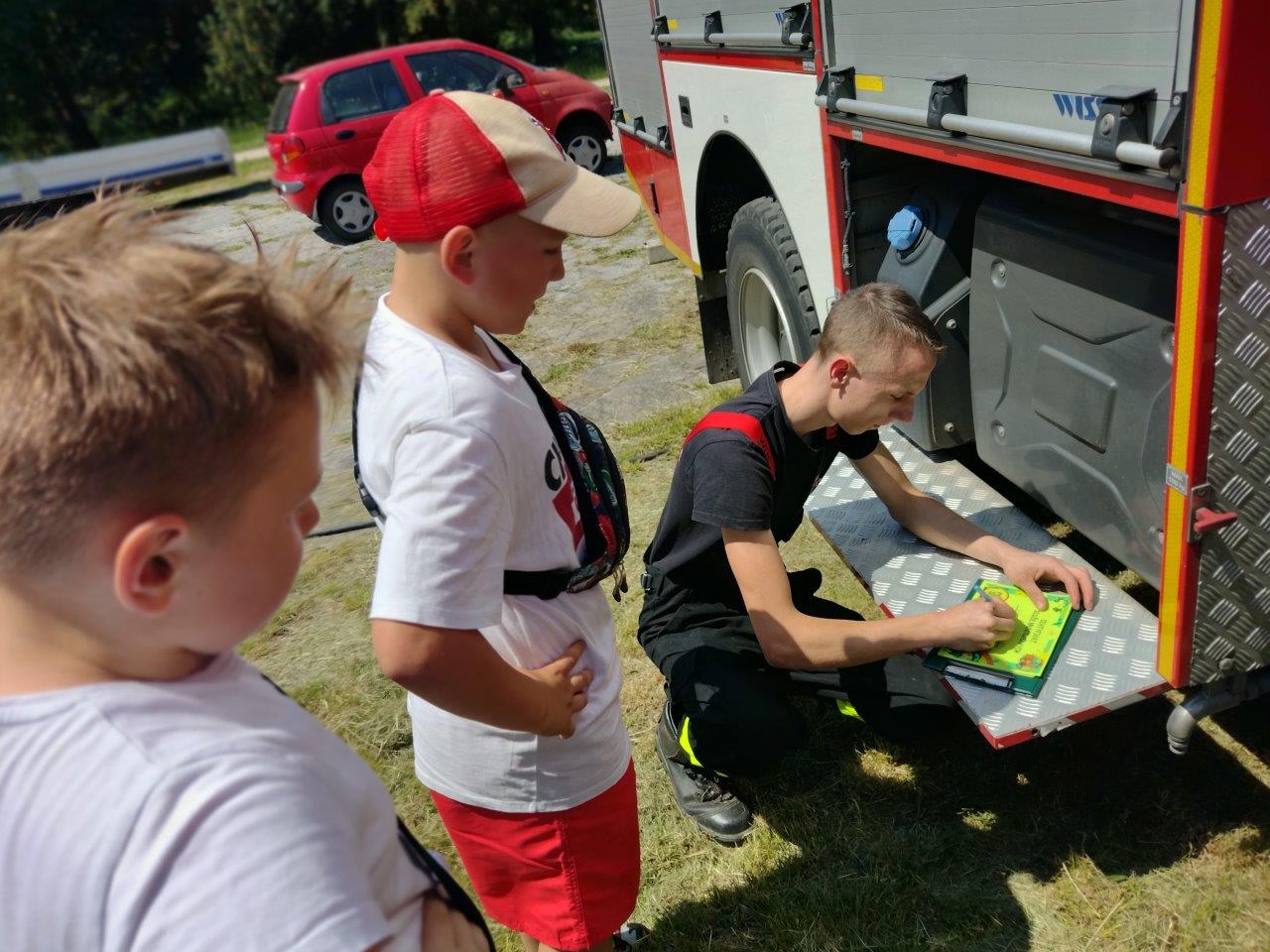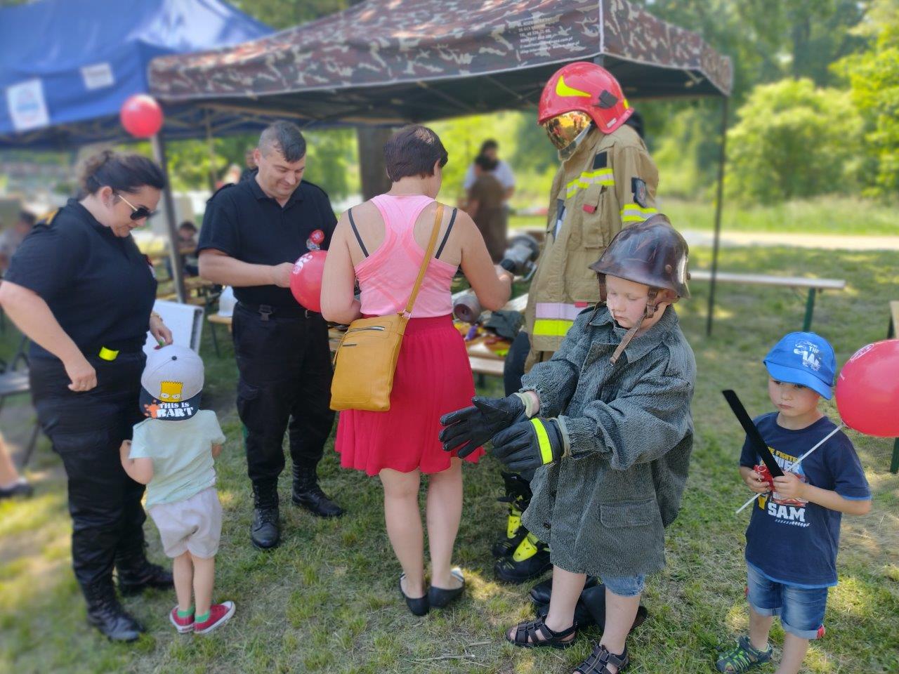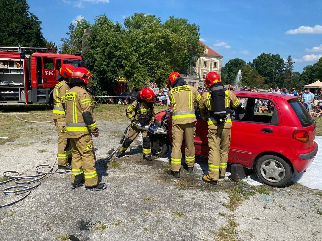Strażacy z Państwowej Straży Pożarnej w Żaganiu i Ochotniczej Straży Pożarnej w Dzietrzychowicach na pikniku dla dzieci "Mundurowy Żagań". Piknik miał miejsce w parku przy Żagańskiego Pałacu Kultury.