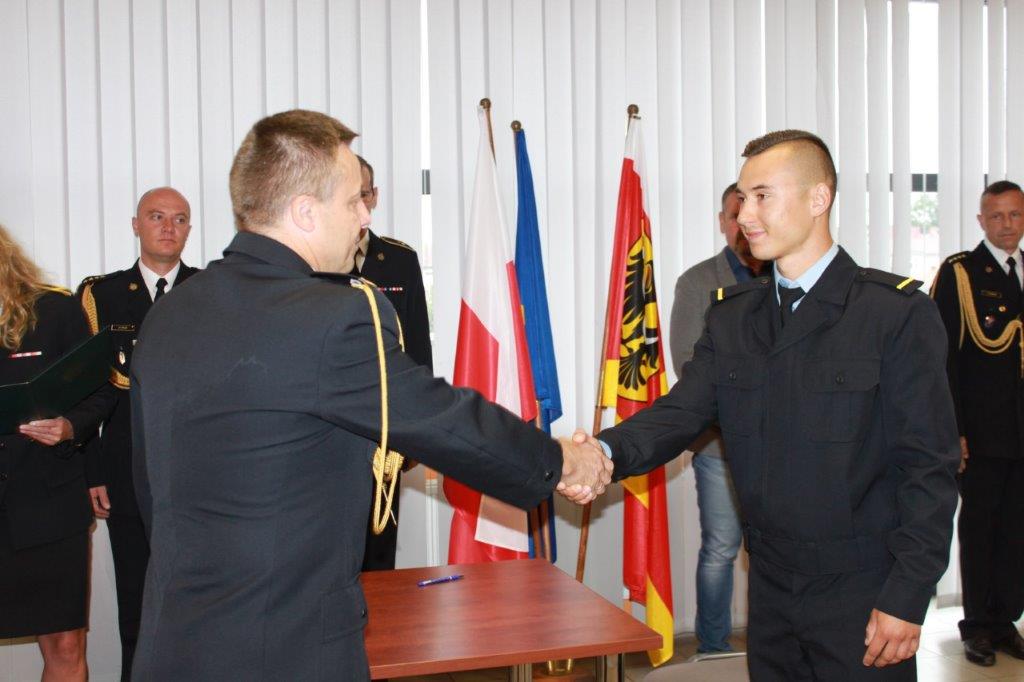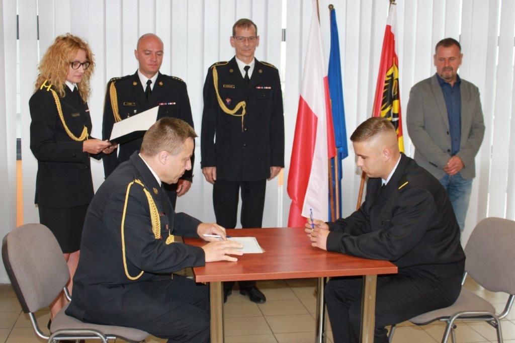 Podczas uroczystości Komendant Powiatowy mł. bryg. Jan Marszałek wręczył nadanie w stopniu młodszego aspiranta st. ogn. Arturowi Jurga i mł. ogn. Przemysławowi Urbaniakowi.