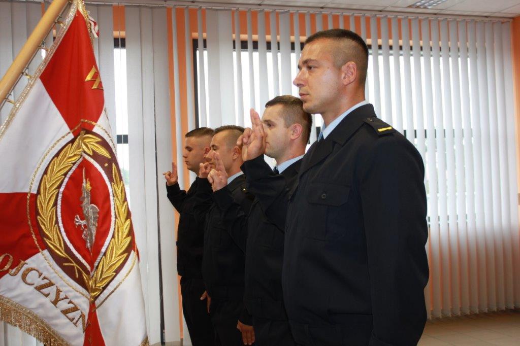 03 sierpnia br. w Komendzie Powiatowej Państwowej Straży Pożarnej w Żaganiu miała miejsce potrójna uroczystość. Odbyło się ślubowanie strażaków, którzy wstąpili w szeregi Państwowej Straży Pożarnej, tj.: str. Pawła Matkowskiego, str. Emila Poźniaka, str. Arkadiusza Sosnowskiego i str. Bartłomieja Ziemkiewicza.