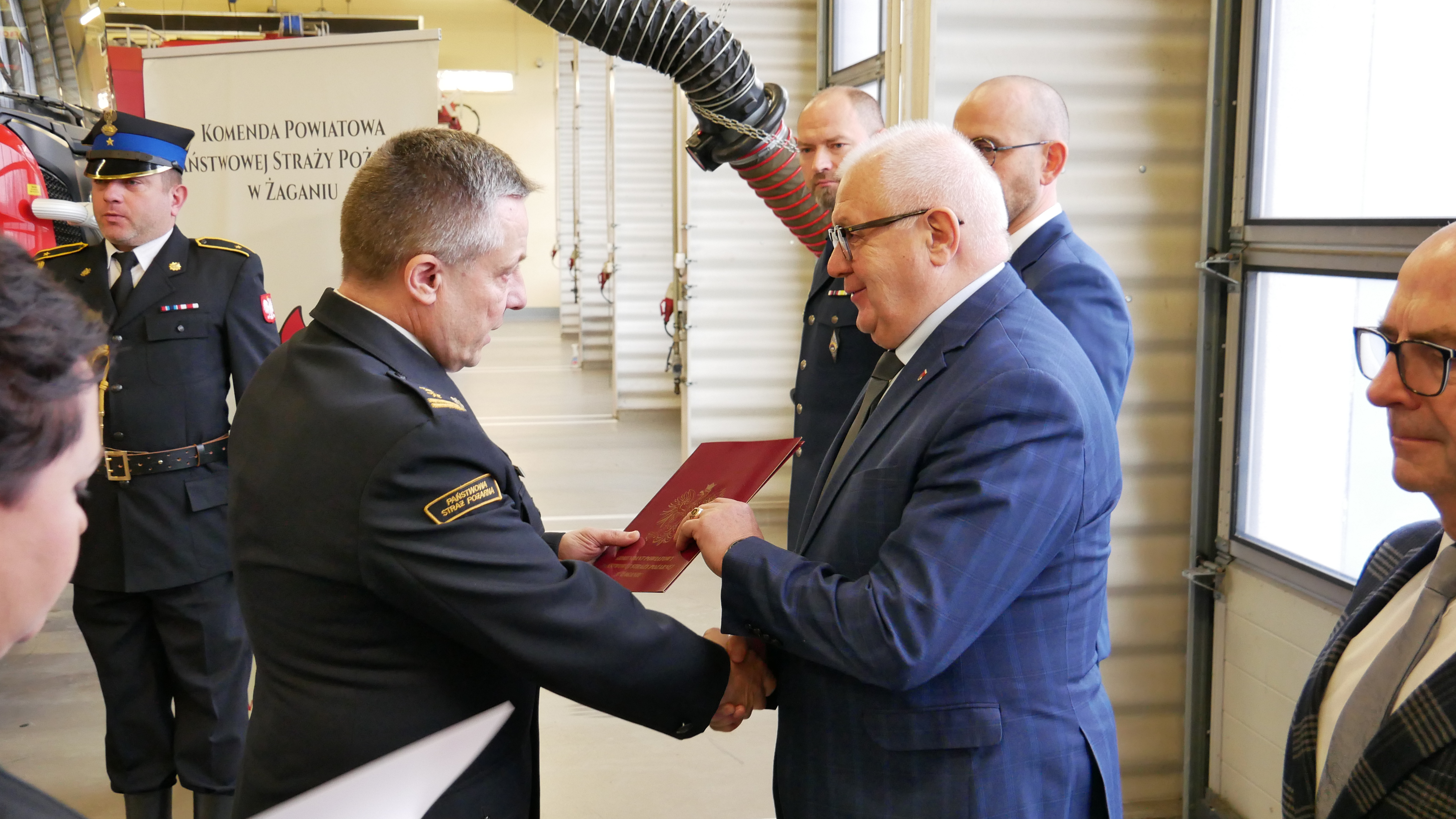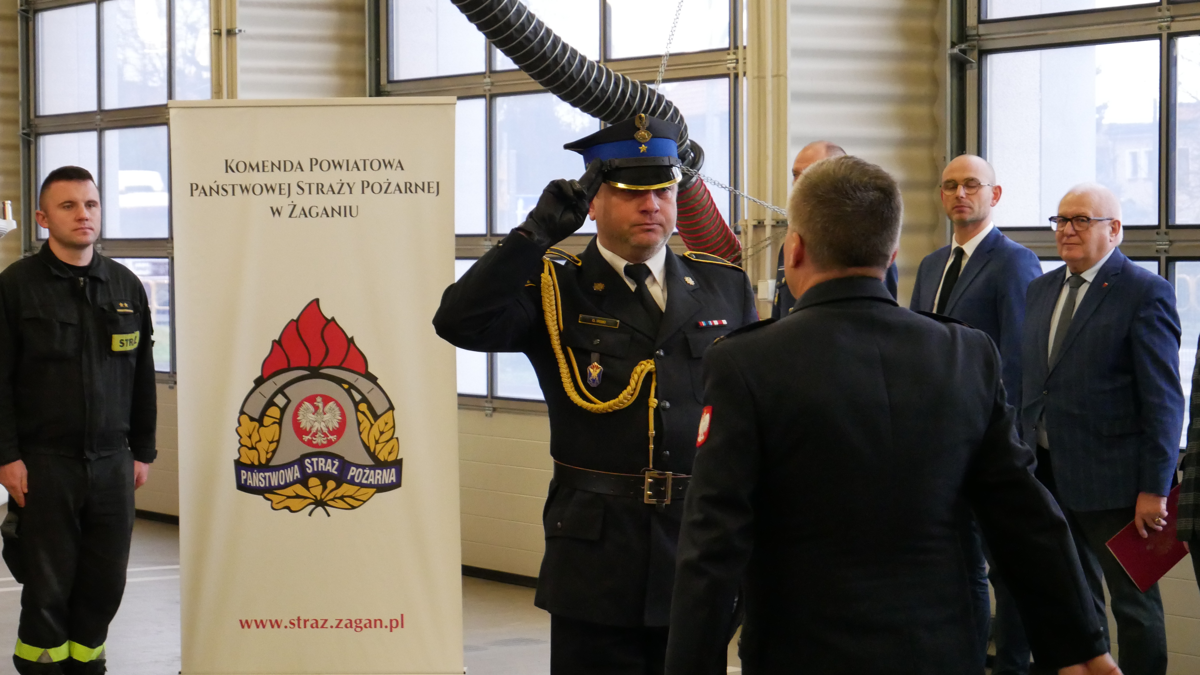 Następnie, Komendant Powiatowy Państwowej Straży Pożarnej w Żaganiu st. bryg. Jan Marszałek wręczył akty mianowania w służbie stałej strażakom: