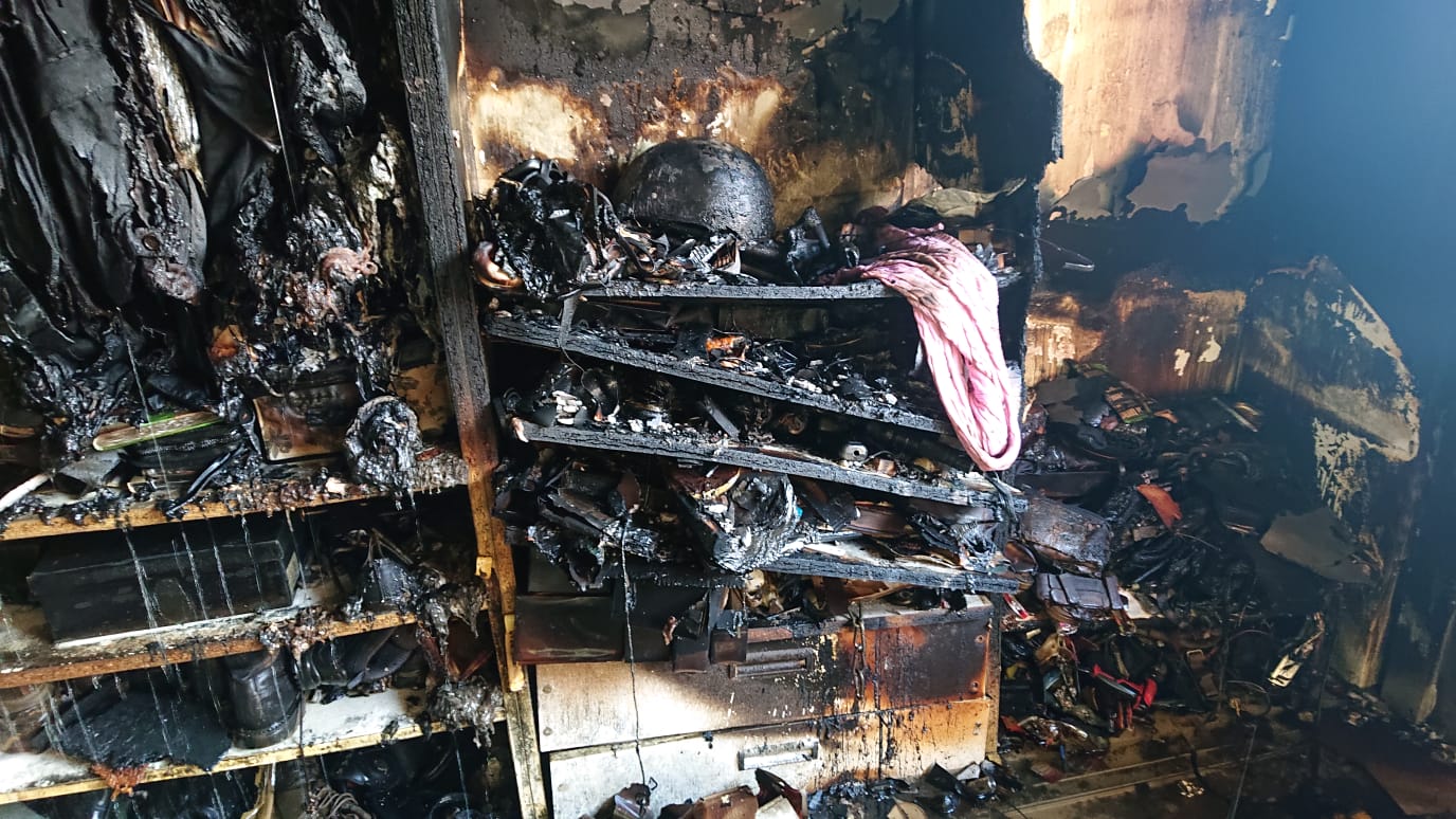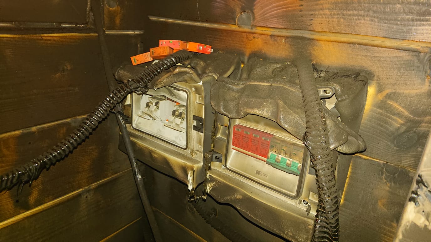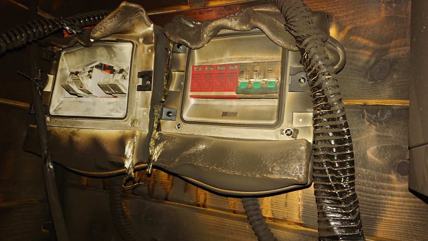 Pożar budynku mieszkalnego wyposażonego w instalację fotowoltaiczną umieszczoną na dachu budynku. Budynek murowany, kryty blachą. W chwili zaistnienia pożaru w budynku nie było żadnych osób. Właściciel powrócił do budynku w chwili gdy wszystkie pomieszczenia na parterze budynku objęte były pożarem i podjął próbę ratowania mienia osobistego, podczas próby wejścia do pomieszczenia budynku skaleczył się w prawą dłoń. Opatrunek osłonowy założyła poszkodowanemu mężczyźnie osoba postronna przed przybyciem JOP. KDR polecił przygotować do podania dwa prądy wody, kamerę termowizyjną oraz aparaty ODO. Na miejsce zdarzenia KDR polecił zadysponować ZRM, celem udzielenia pomocy poszkodowanemu mężczyźnie. KDR odłączył zasilenie energią elektryczną poprzez wyłączenie bezpieczników oraz wyłącznika głównego. Wraz z innym strażakiem KDR zlokalizował skrzynki bezpiecznikowe instalacji PV, odłączono wszystkie możliwe zabezpieczenia i połączenia instalacji PV. KDR ogłosił komunikat na kanale ratowniczym o obecności instalacji fotowoltaicznej na budynku i zachowaniu ostrożności podczas działań. Przed przystąpieniem do gaszenia polecił strażakom stosować kropliste prądy wody. Jeden prąd wody wprowadzono do środka budynku, drugi podano z zewnątrz. Spalone elementy wyposażenia wnętrza budynku stwarzające zadymienie strażacy usuwali na zewnątrz budynku. Strażacy z roty podającej prąd wodę w środku budynku, poinformowali KDR, że w jednym z pomieszczeń znajdują się przedmioty przypominające broń palną oraz magazynki z amunicją. KDR polecił ograniczyć ilość ratowników do minimum, strażacy z pozycji ukrytej schładzali pomieszczenie z podejrzanymi przedmiotami. Teren przed budynkiem zabezpieczono taśmą i wyznaczono posterunki. O zdarzeniu KDR poinformował Policję. Dowódca patrolu Policji poinformował KDR, że podjęte zostaną czynności identyfikujące podejrzane przedmioty. Budynek oddymiono. Budynek skontrolowano kamerą termowizyjną, nie stwierdzono innych oznak zaistnienia pożaru.