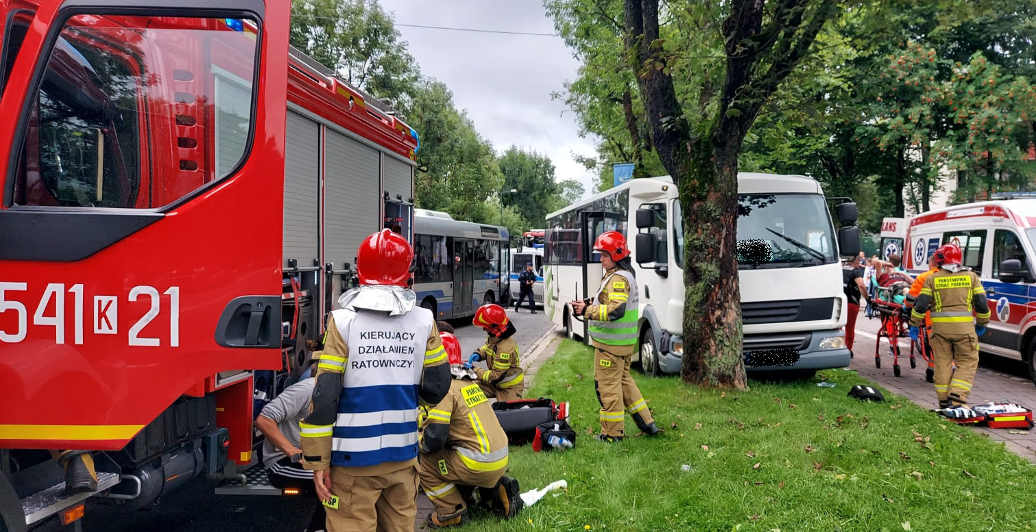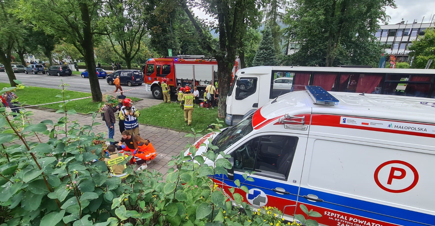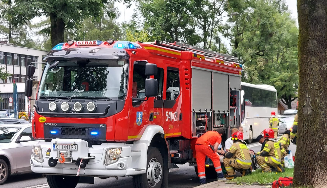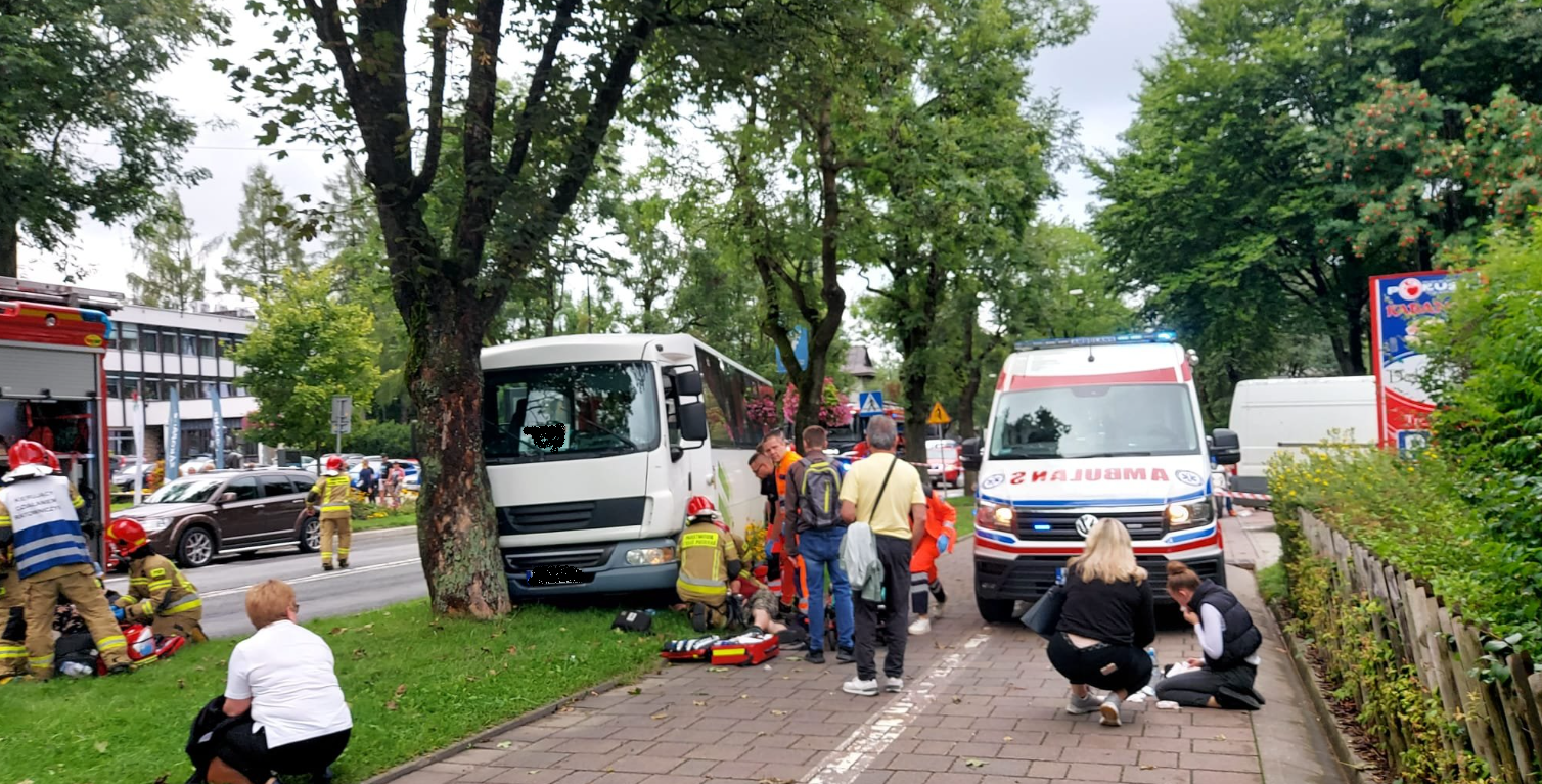 W dniu 22 sierpnia br. do Stanowiska Kierowania Komendanta Powiatowego PSP w Zakopanem około godz. 12:45 wpłynęło zgłoszenie o zdarzeniu drogowym na ul. Kościuszki w Zakopanem- naprzeciwko Urzędu Miasta. Po dojeździe na miejsce zastępów z JRG Zakopane stwierdzono: Pojazd typu BUS zjechał z drogi i uderzył w przydrożne drzewo. Działania Straży Pożarnej polegały na zabezpieczeniu miejsca zdarzenia poprzez ustawienie pojazdów strażackich z włączoną sygnalizacją świetlną oraz wygrodzenie taśmą ostrzegawczą terenu działań. Następnie przystąpiono do udzielania pomocy poszkodowanym. Busem podróżowało 14 osób, poszkodowanych zostało 8 w tym 4 dzieci. Kilka osób zostało zabranych do szpitala. Działania prowadzono wspólnie z Pogotowiem Ratunkowym i Policją.