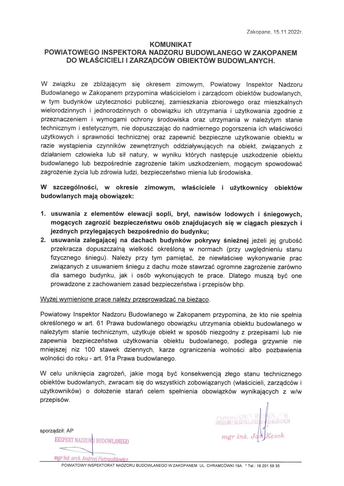 | Komunikat Powiatowego Inspektora Nadzoru Budowlanego w Zakopanem | 1.0 | 17.11.2022 11:20 st. str. Adam Bendkowski |