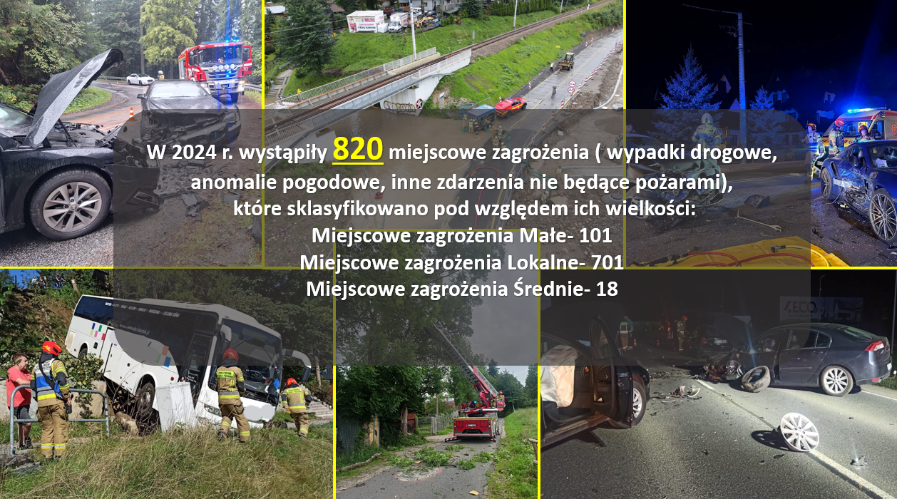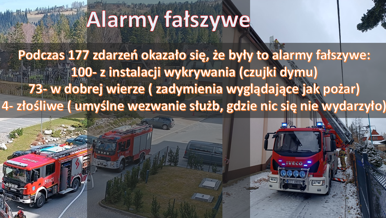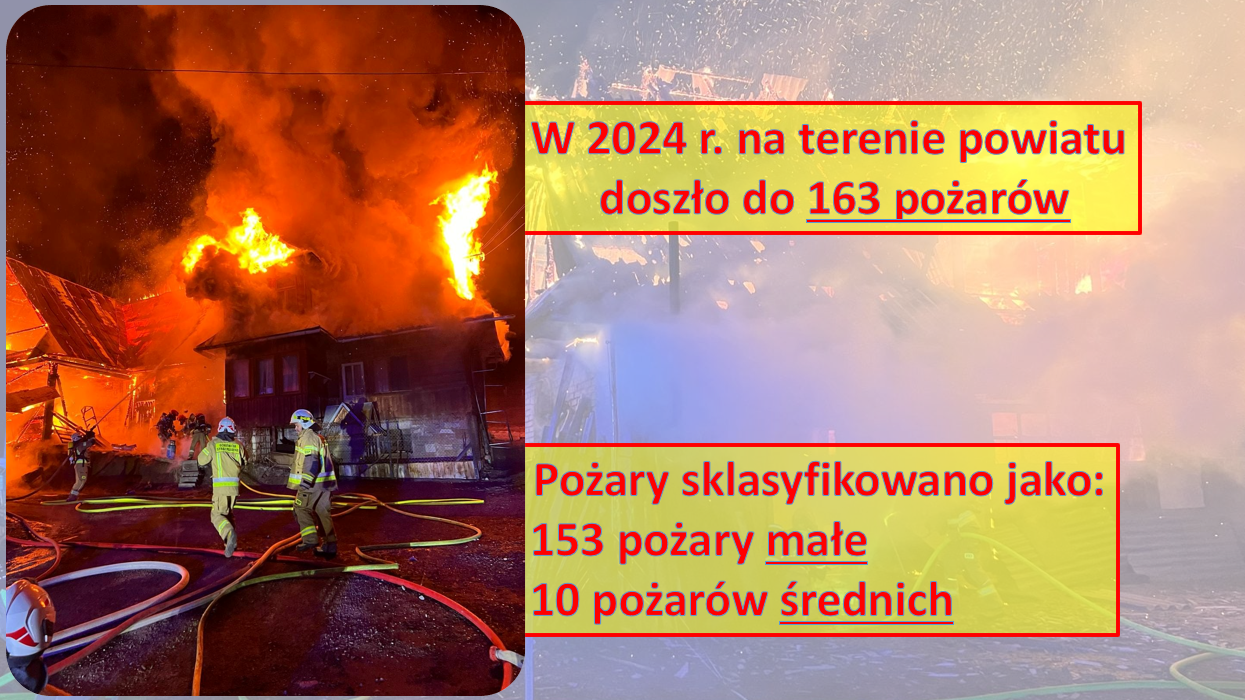 W 2024 r. jednostki Państwowej i Ochotniczych Straży Pożarnych na terenie powiatu tatrzańskiego podjęły łącznie 1160 interwencji, w tym: 163 pożary, 820 miejscowych zagrożeń i 177 alarmów fałszywych.