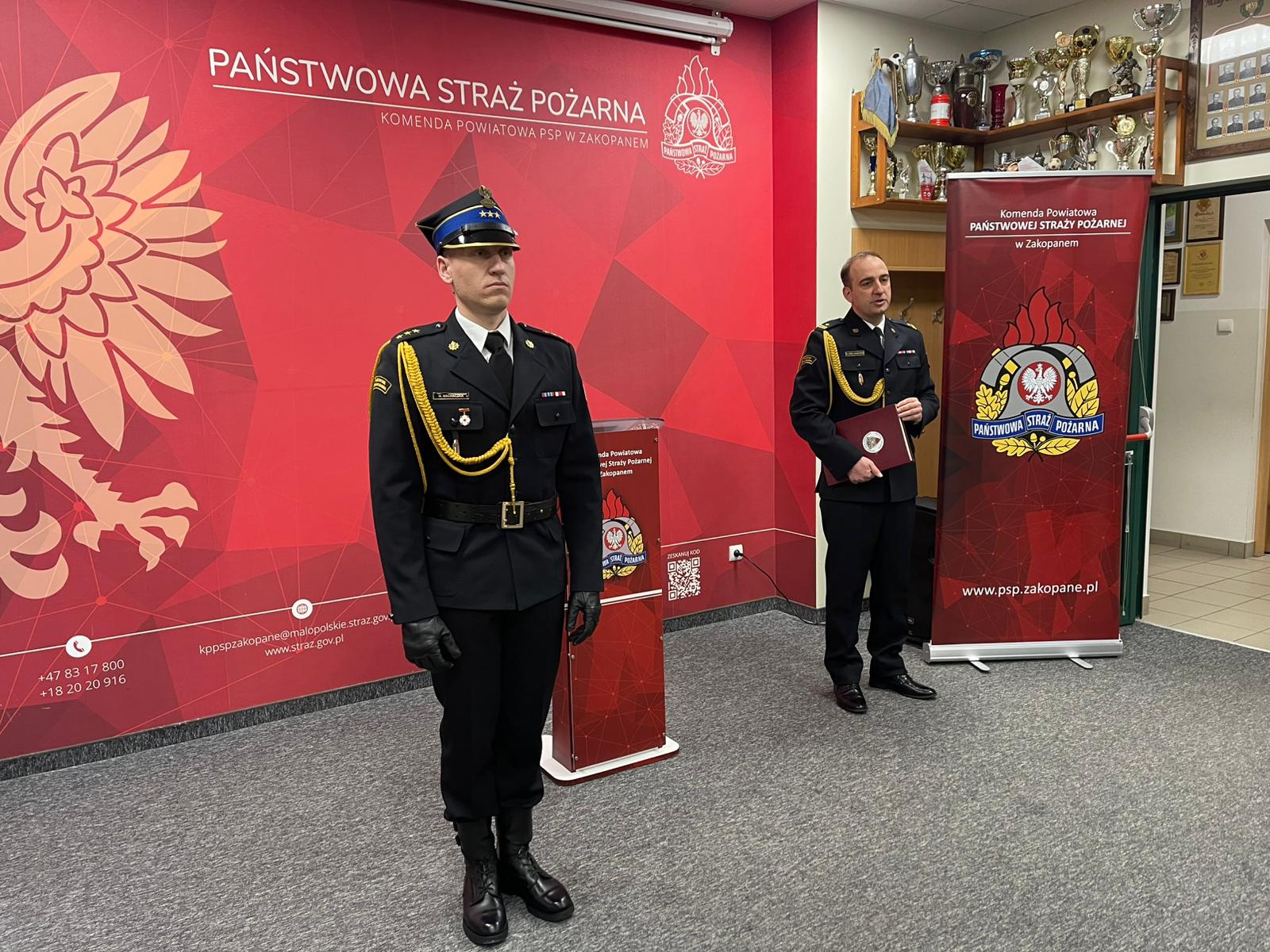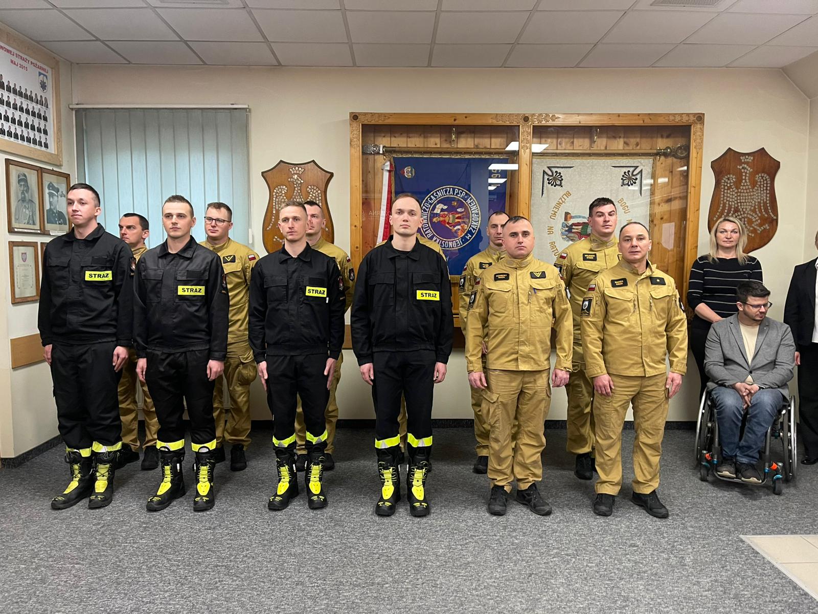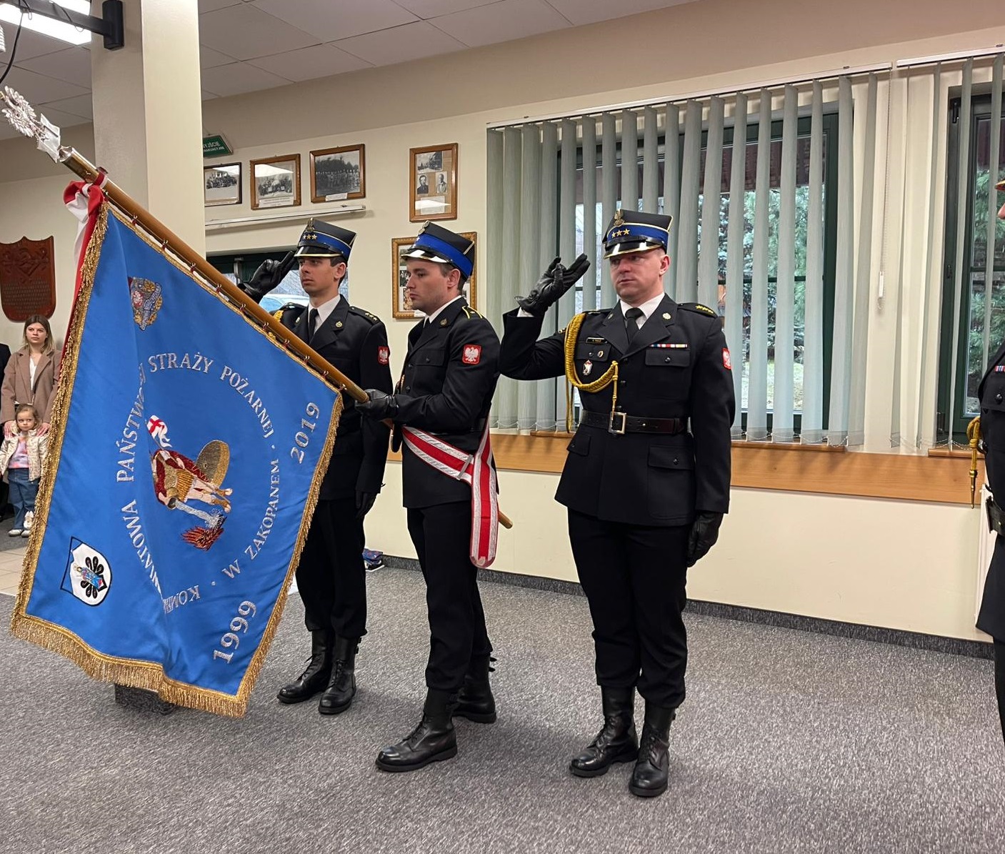 Przed sztandarem Komendy Powiatowej PSP w Zakopanem w obecności mł. bryg. Jarosława Kośmińskiego, p.o. Komendanta Powiatowego PSP w Zakopanem oraz kadry dowódczej i zmian służbowych w dniu 17 marca 2026 roku trzech nowo przyjętych do służby strażaków złożyło uroczyste ślubowanie. Słowami roty ślubowania zobowiązali się m. in.: „być ofiarnym i mężnym w ratowaniu zagrożonego życia ludzkiego i wszelkiego mienia – nawet z narażeniem życia, (...) przestrzegać prawa i dyscypliny służbowej, (...) strzec tajemnic związanych ze służbą, a także honoru, godności i dobrego imienia służby (...)". Następnie, po podpisaniu aktu ślubowania, Komendant pogratulował młodym strażakom wejścia na drogę strażackiej służby. Aby zdobyć odpowiednie kwalifikacje zawodowe młodzi strażacy wezmą w najbliższym czasie udział w szkoleniu podstawowym w zawodzie strażak. Życzymy im powodzenia!