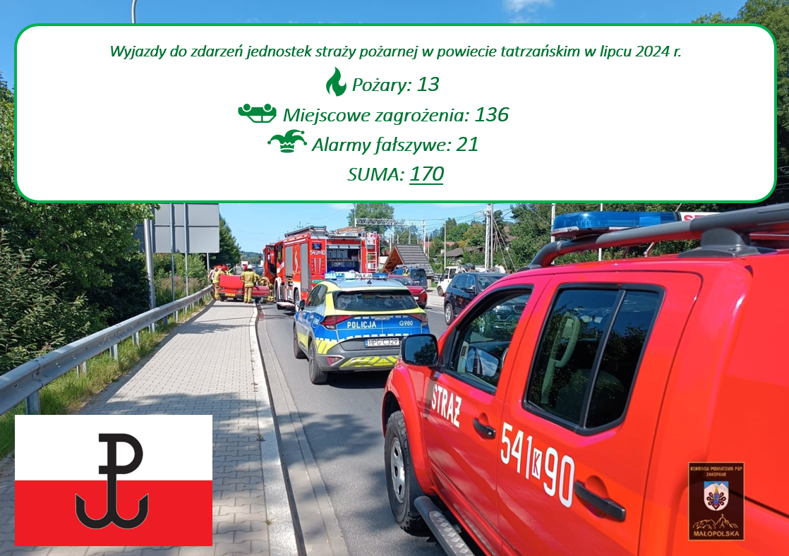 Strażacy powiatu tatrzańskiego w lipscu 2024 r. podejmowali interwencje w związku z 13 pożarami, 136 miejscowymi zagrożeniami (wypadki drogowe, zjawiska pogodowe itp.) oraz 21 alarmów fałszywych. Łącznie w lipcu wyjeżdżali do zdarzeń 170 razy.
