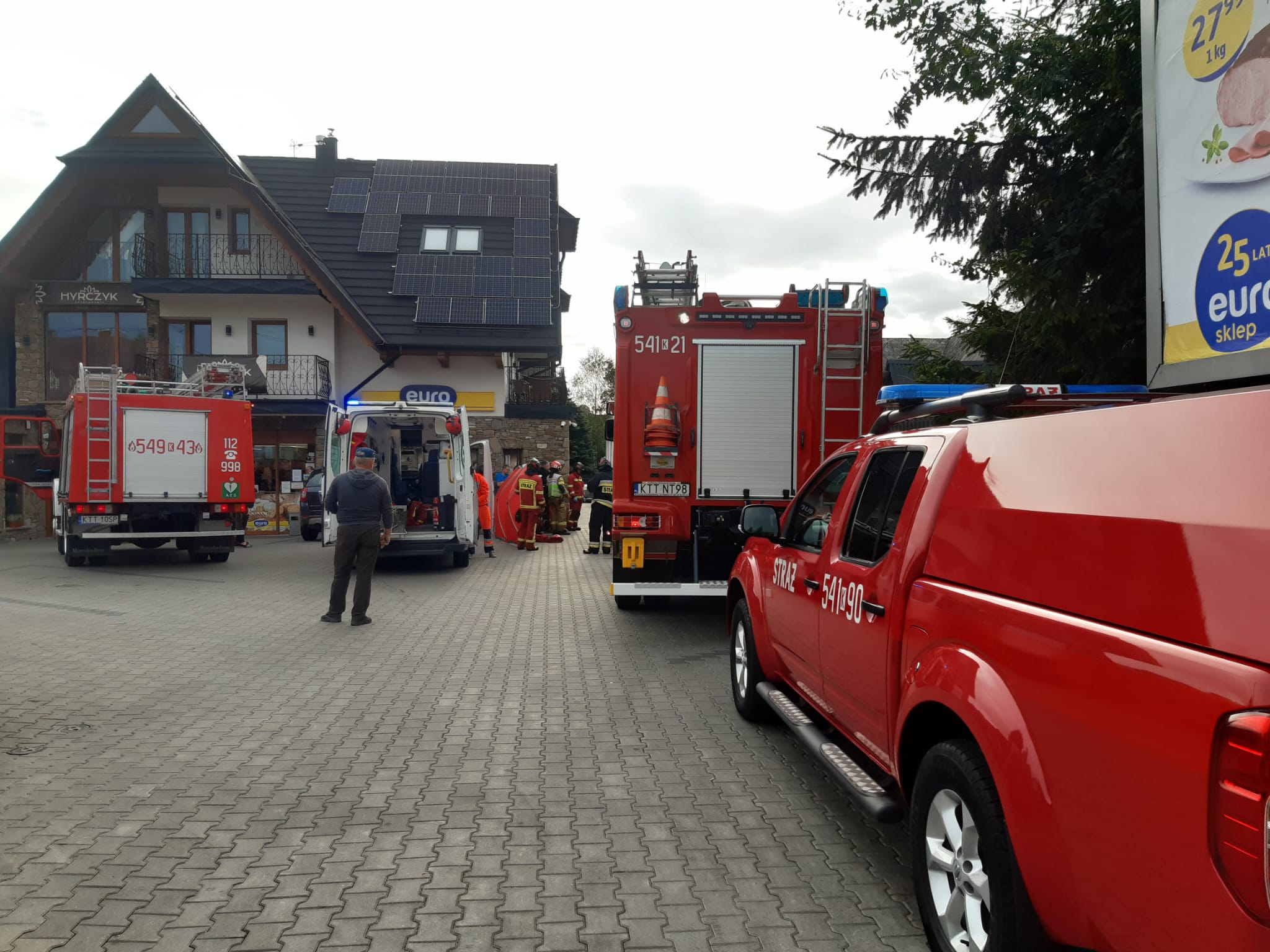 W chwili przybycia na miejsce zdarzenia pierwszego zastępu z OSP Ząb poszkodowana osoba znajdowała się za pojazdem dostawczym w pozycji leżącej na plecach, uskarżała się na ból w okolicy lędźwiowej, widoczne obrażenia ciała w okolicy uda i miednicy. Działania medyczne polegały na stabilizacji szyjnego odcinka kręgosłupa, opatrzeniu rany na prawym udzie i prowadzeniu wsparcia psychicznego do czasu przyjazdu ZRM. Po przyjeździe zastępów z JRG Zakopane wygrodzono miejsce gdzie znajdowała się poszkodowana kobieta parawanem ochronnym. Po zaopatrzeniu medycznym osoby poszkodowanej, strażacy pomogli ratownikom medycznym w przełożeniu kobiety na nosze próżniowe, a następnie w przeniesieniu do karetki. Poszkodowana została zabrana do Szpitala Powiatowego w Zakopanem.