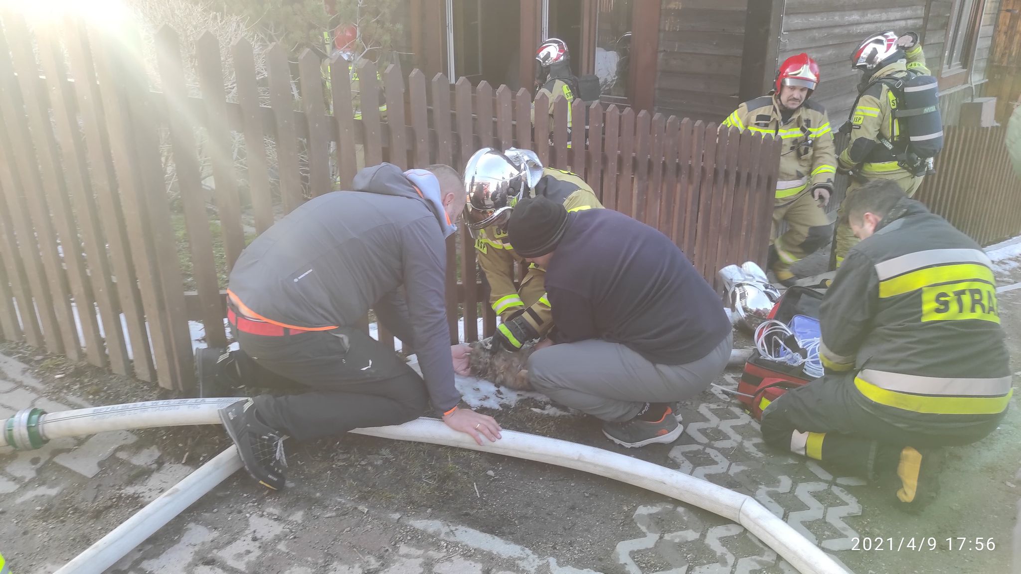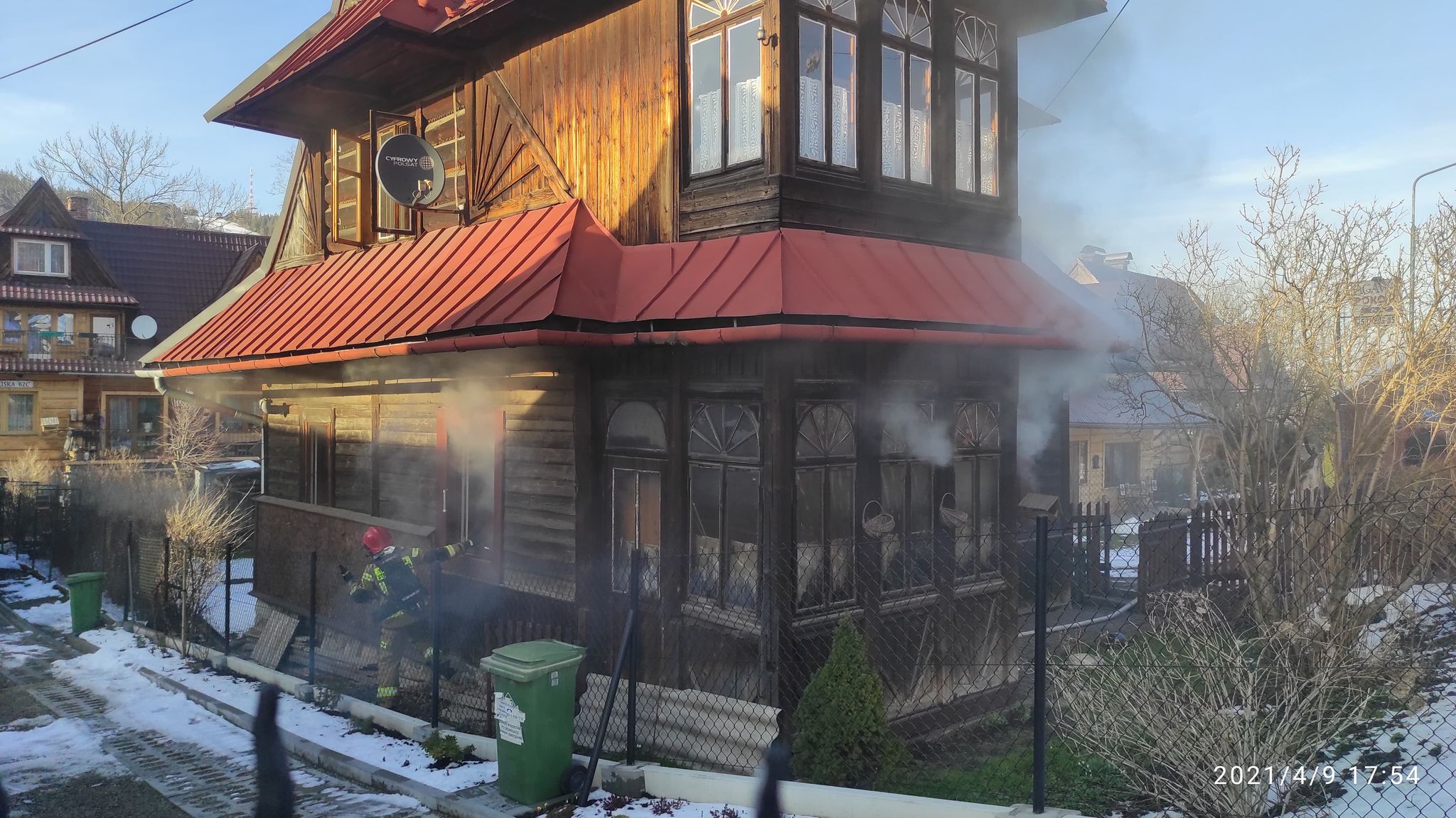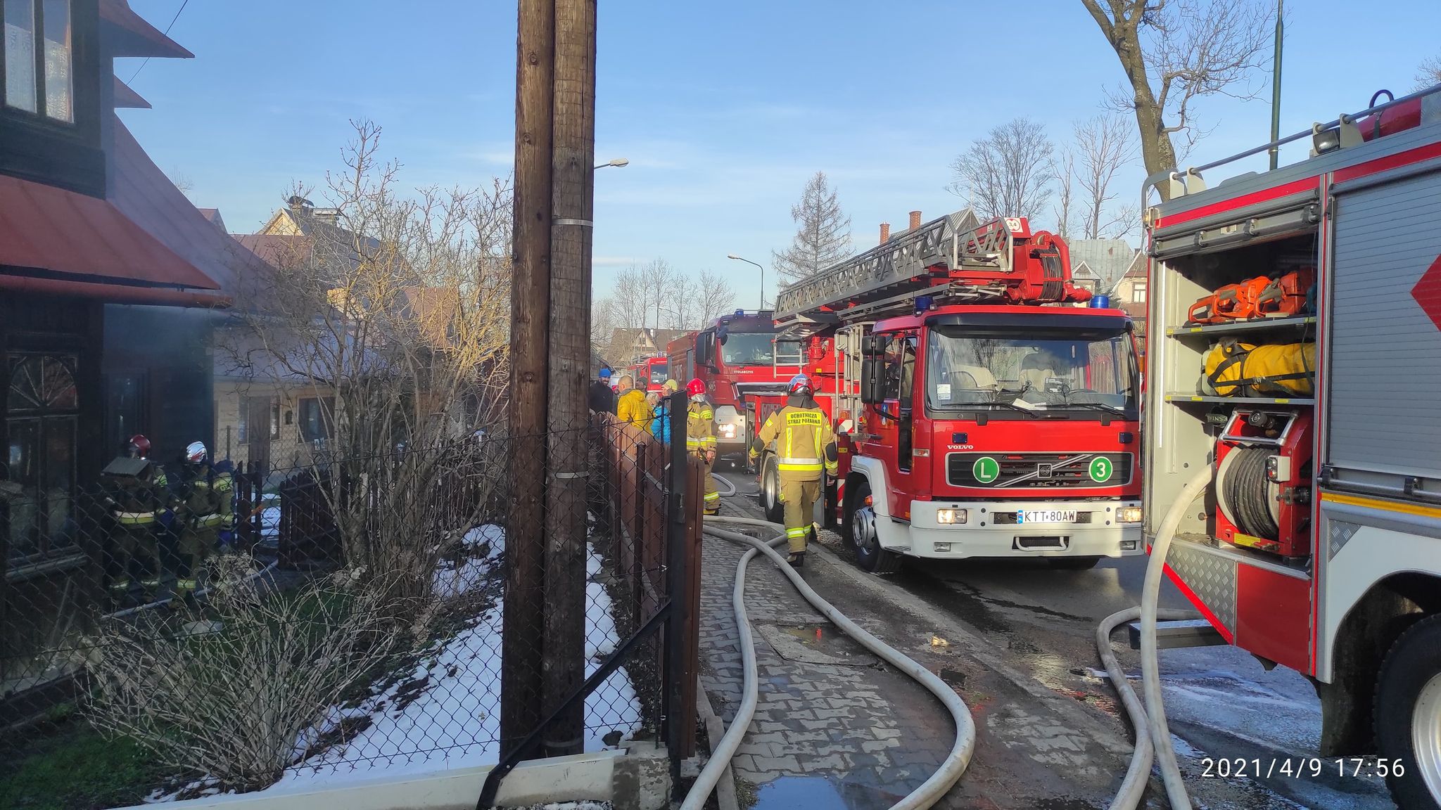 9 kwietnia 2021 miał miejsce pożar budynku drewnianego dwukondygnacyjnego. W chwili przybycia pierwszych zastępów na miejsce zdarzenia z okien na parterze wydobywał się gęsty dym. Zamieszkująca w budynku starsza kobieta została wyprowadzona na zewnątrz przed przybyciem służb przez mężczyznę, który przechodził chodnikiem, była przytomna z oparzeniami pierwszego stopnia rąk i twarzy. Została zaopatrzona przez przybyły na miejsce ZRM. Uzyskano informację, że w budynku nie przebywają inne osoby. Działania polegały na wprowadzeniu przez wejście główne dwóch rot gaśniczych wyposażonych w kamerę termowizyjną i linię gaśniczą do wnętrza budynku. Po zlokalizowaniu pożaru otwarto wszystkie okna w pomieszczeniach na parterze jak i na pierwszym piętrze celem oddymienia budynku. W trakcie przeszukiwania w jednym z pomieszczeń na parterze znaleziono małego psa, którego ewakuowano na zewnątrz, zwierzę nie reagowało, stwierdzono jedynie płytkie oddechy. Podano mu tlen i wykonano masaż serca. Po ok.20 min pies odzyskał świadomość i zaczął normalnie oddychać. Odratowany pies został przekazany właścicielowi. Następnie przystąpiono do rozbiórki części drewnianej ściany która uległa zapaleniu oraz kaflowego pieca. Zdemontowano również część drewnianej boazerii ze ściany i sufitu. Pomieszczenia wszystkie sprawdzono miernikiem gazowym i kamerą termowizyjną.