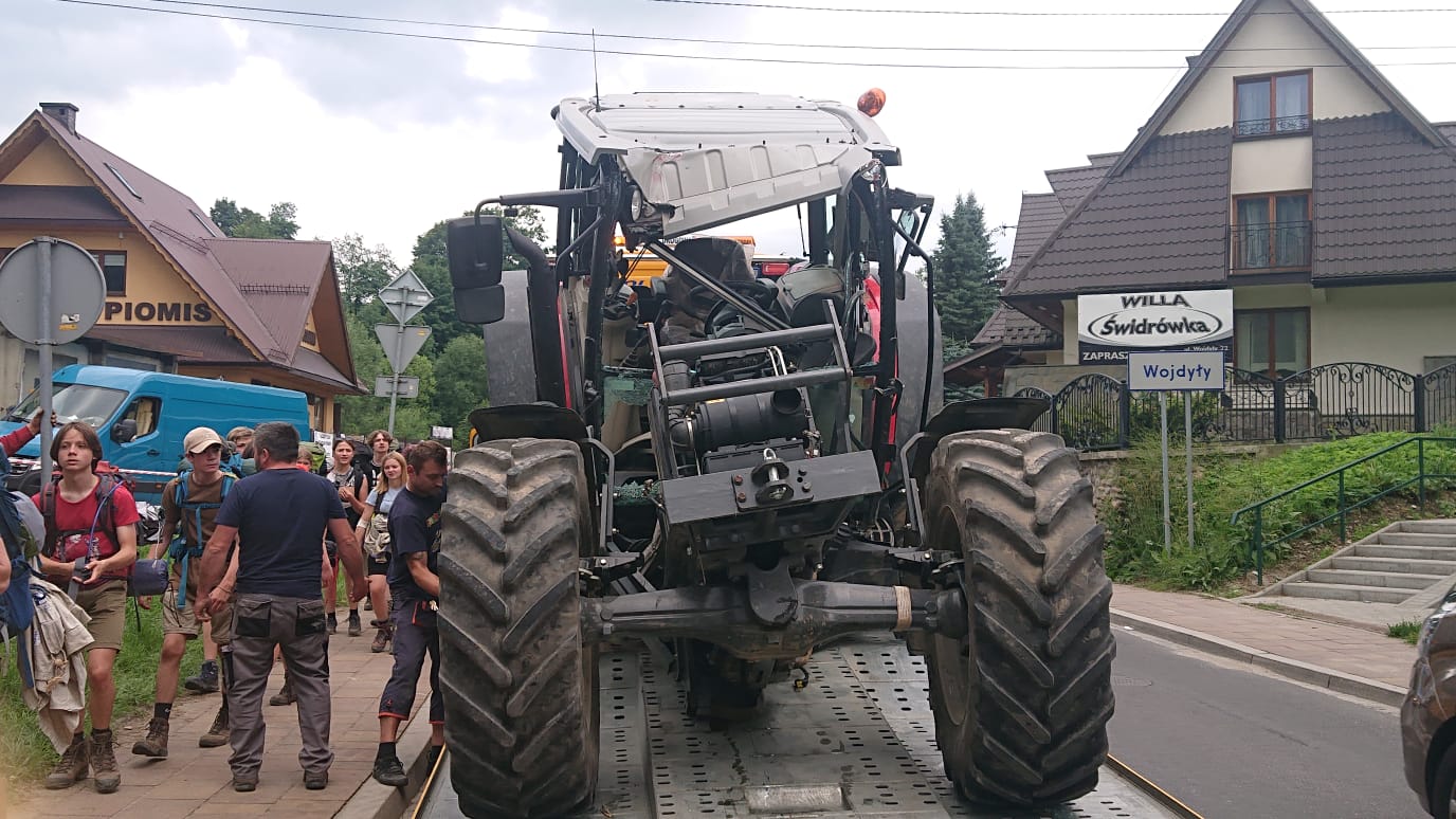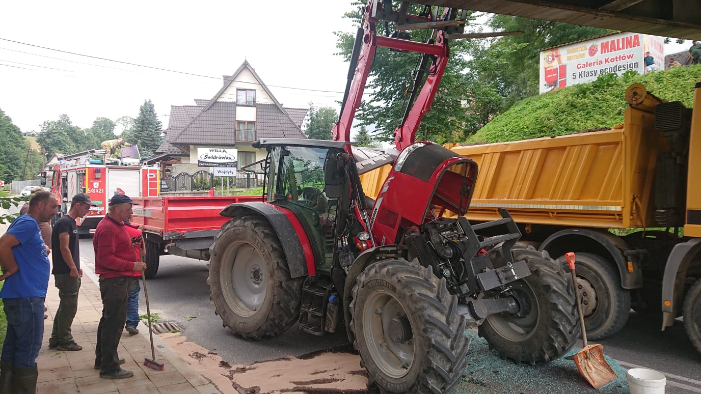 W dniu 23 lipca 2021r kierujący ciągnikiem rolniczym, zbyt wysoko podniósł ładowacz czołowy tzw. Tur i doprowadził do zderzenia z przęsłem wiaduktu kolejowego. W zdarzeniu brała udział 1 osoba. Jako pierwszy na miejsce zdarzenia przybył zastęp JOP z JRG Zakopane. Zabezpieczono miejsce zdarzenia poprzez odpowiednie ustawienie samochodu ratowniczego. Kierujący ciągnikiem sam opuścił pojazd i przebywał obok traktora w pozycji stojącej. KDR ocenił stan zdrowia kierowcy (bez urazów), polecił wystawić posterunki do kierowania ruchem drogowym, odłączono akumulator w uszkodzonym pojeździe, zabezpieczono plamę z rozlanych płynów eksploatacyjnych pojazdu sorbentem i matami sorpcyjnymi. KDR skontrolował stan techniczny wiaduktu kolejowego, nie stwierdzono żadnych uszkodzeń. Po usunięciu pojazdu z miejsca zdarzenia przez pomoc drogową, strażacy usunęli i zmyli powstałą plamę wodnym roztworem środka zmywającego. Usunięto z jezdni kawałki szkła i plastiku zagrażające uczestnikom ruchu drogowego.