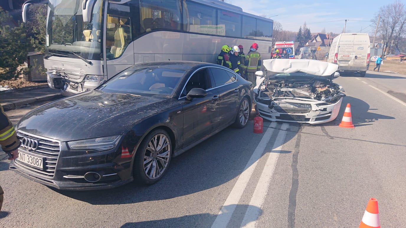Zderzenie autobusu i dwóch samochodów osobowych.