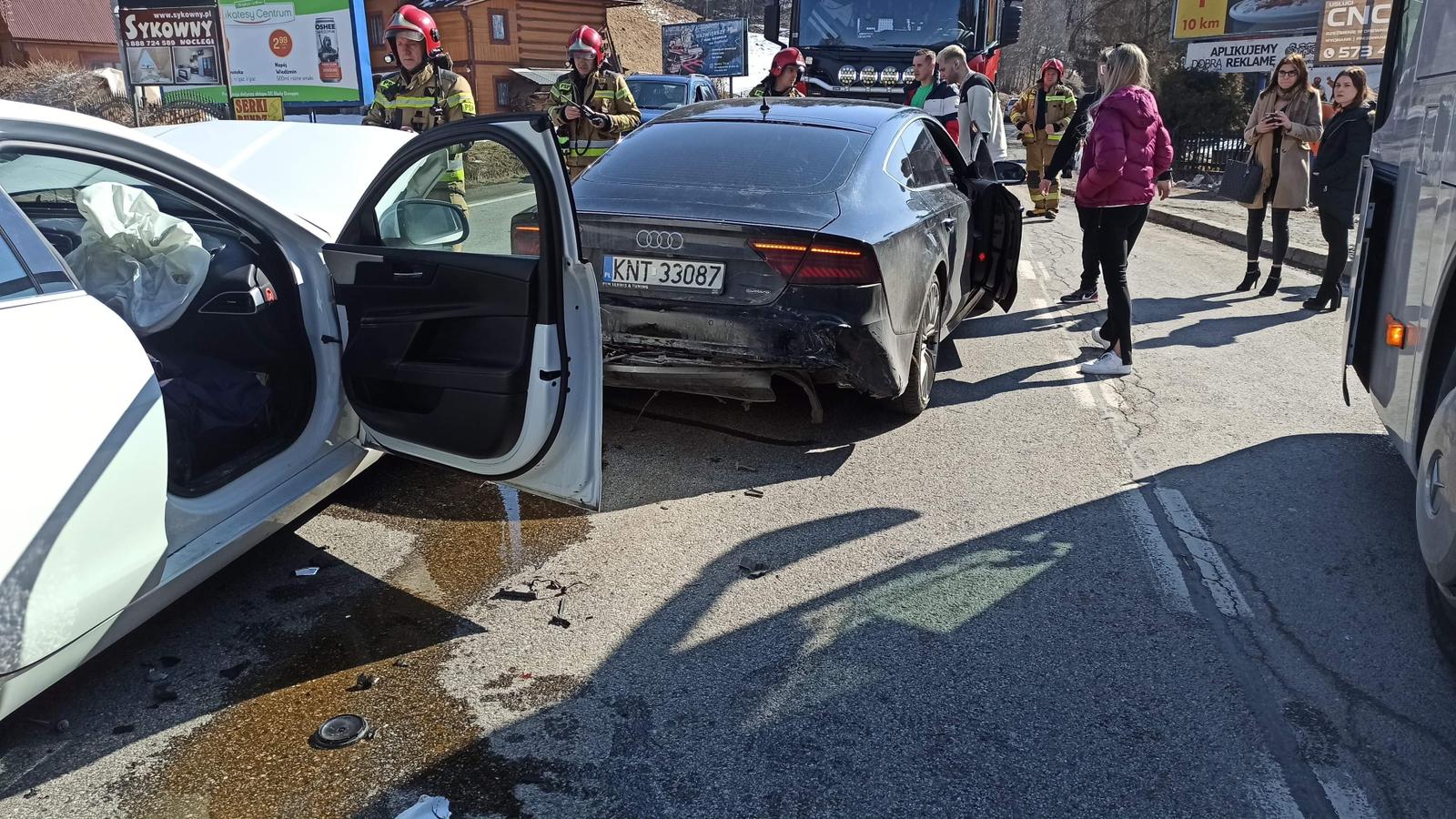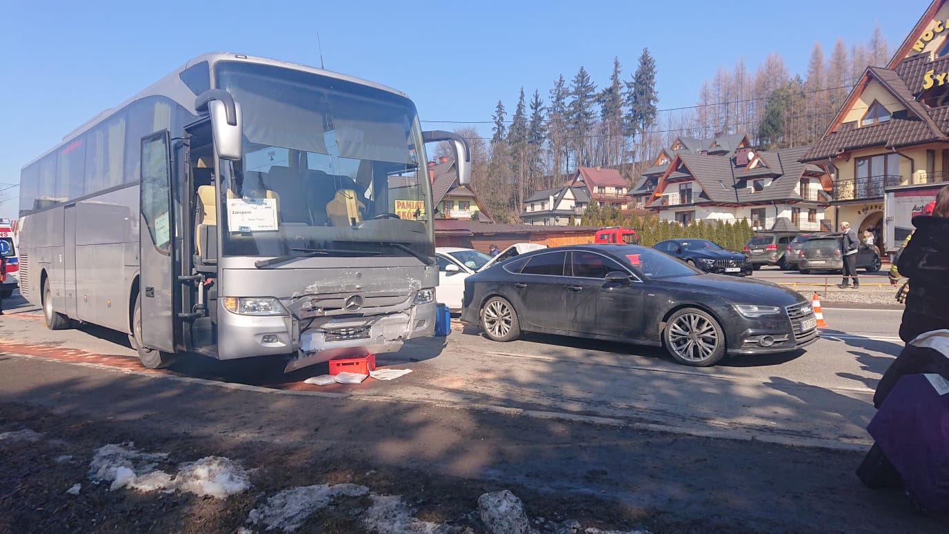 W dniu 17 marca 2022 na DK 47 w miejscowości Biały Dunajec kierujący autokarem Mercedes najechał na tył samochodu osobowego Jaguar, który następnie uderzył w tył pojazdu Audi. W zdarzeniu brało udział 30 osób. 25 osób podróżowało autokarem, 4 podróżowały samochodem Jaguar, 1 osoba podróżowała samochodem Audi. Jako pierwszy na miejsce zdarzenia przybył zastęp JOP z JRG Zakopane. Zabezpieczono miejsce zdarzenia, poprzez odpowiednie ustawienie samochodu ratowniczego oraz rozstawienie stożków ostrzegawczych. Wszyscy uczestnicy zdarzenia opuścili pojazdy przed przybyciem JOP i stali na chodniku obok samochodów. I KDR polecił ocenić stan zdrowia uczestników zdarzenia, 2 osoby podróżujące autokarem zgłosiły ratownikom niewielki ból w okolicach szyi, 1 osoba podróżująca samochodem Jaguar zgłosiła ból prawej nogi w okolicy kolana. Osobom poszkodowanym podróżującym autokarem udzielono wsparcia psychicznego do czasu przekazania ZRM. U osoby podróżującej samochodem osobowym stwierdzono niewielkie skaleczenie w okolicy kolana, założono opatrunek osłonowy. II KDR polecił wystawić posterunki do kierowania ruchem drogowym (wyznaczono objazd przez Biały Dunajec ul. Miłośników Podhala), odłączono akumulatory w uszkodzonych pojazdach, ograniczono powstałe rozlewisko płynów eksploatacyjnych z uszkodzonych pojazdów, poprzez użycie mat sorpcyjnych i sorbentu. Po zakończeniu działań Policji strażacy na prośbę kierującego samochodem Jaguar użyli rozpieracza hydraulicznego, do otwarcia tylnej klapy pojazdu, w celu wyjęcia bagażu znajdującego się w bagażniku. Po zabraniu samochodów z miejsca zdarzenia przez pomoc drogową, polecił usunąć kawałki szkła i plastiku zagrażające uczestnikom ruchu drogowego. Osoby podróżujące autobusem odjechały z miejsca zdarzenia, zastępczym autokarem podstawionym przez właściciela firmy przewozowej.