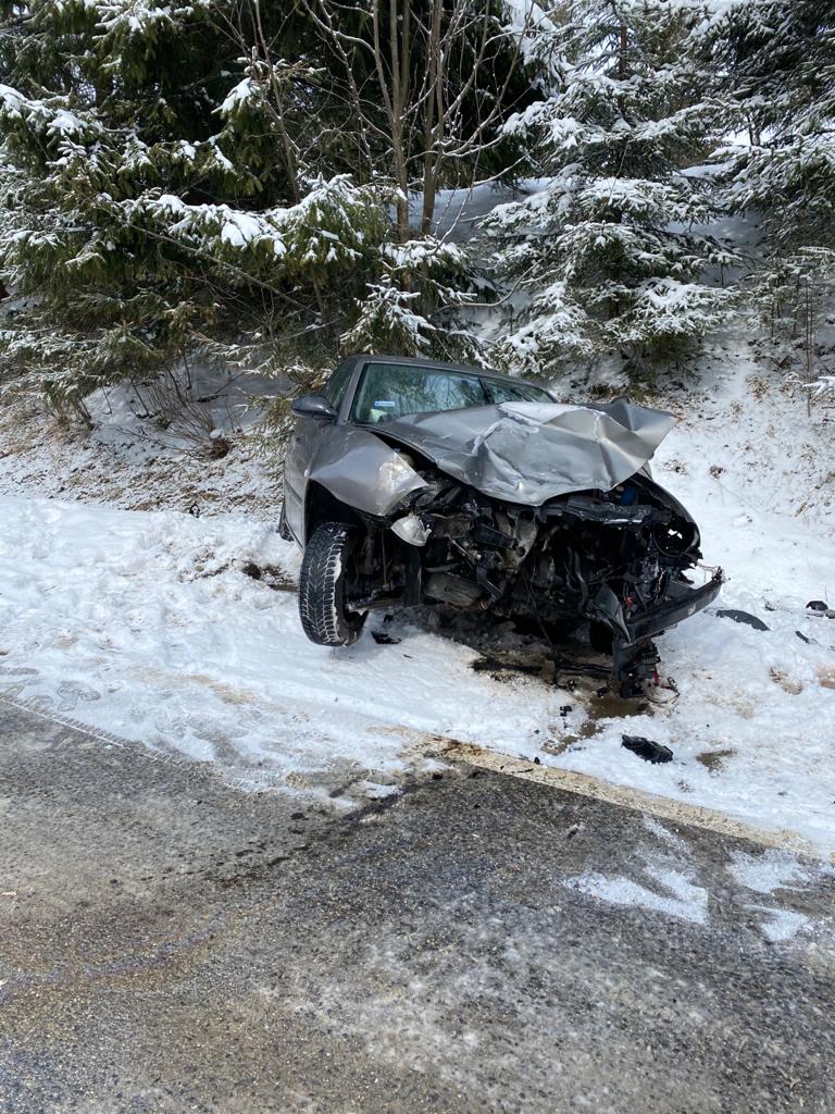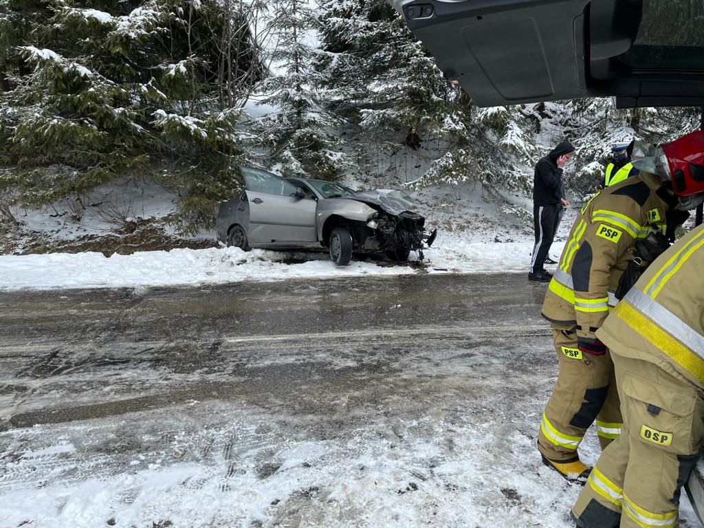 W dniu 8 kwietnia doszło do czołowego zderzenia dwóch samochodów osobowych w wyniku czego poszkodowana została jedna osoba, z pojazdu marki Mercedes. Ze względu na oblodzoną nawierzchnię oraz trudne warunki spowodowane intensywnymi opada śniegu podjęto decyzję o całkowitym wstrzymaniu ruchu na drodze zabezpieczając miejsce zdarzenia odpowiednim ustawieniem pojazdu pożarniczego oraz przy użyciu stożków ostrzegawczych. Działania polegały na zabezpieczeniu miejsca zdarzenia, udzieleniu KPP poszkodowanej kobiecie do czasu przyjazdu ZRM (wsparcie psychiczne), odłączeniu zasilania w pojazdach, sorpcji rozlanych płynów eksploatacyjnych. Decyzją kierownika ZRM po przebadaniu kobiety pozostała ona na miejscu zdarzenia. Po zakończeniu czynności prowadzonych przez Policję doga została uprzątnięta a ruch został przywrócony. Uszkodzone pojazdy zostały zabrane przez pomoc drogową w miejsca wskazane przez właścicieli, a na miejsce zdarzenia zadysponowano piaskarkę.