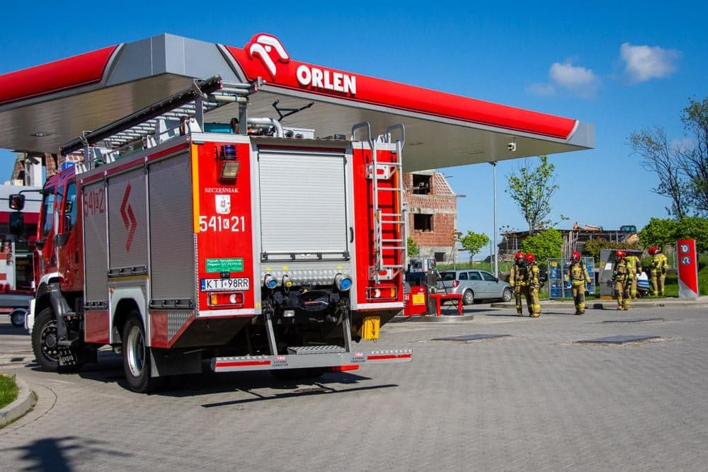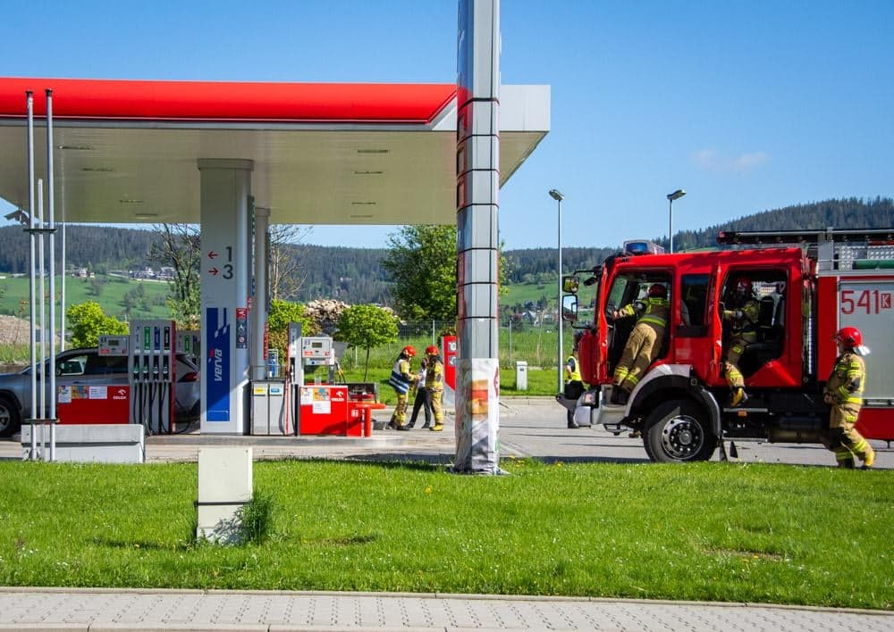 06-06-2021, Krzeptówki Potok na stacji paliw w wyniku niezachowania ostrożności przez kierującego pojazdem osobowym po zakończonym tankowaniu, kierujący pojazdem podczas odjazdu ze stanowiska uszkodził przyczepką dystrybutor oraz rozciął wąż do tankowania gazu LPG. Przed przyjazdem JOP, pracownicy stacji polecili osobom znajdującym się na stacji oddalić się w bezpiecznie miejsce. Następnie pracownicy stacji zakręcili główny zawór, od przepompowni na linii doprowadzającej gaz ze zbiornika do dystrybutora. Działania straży pożarnej polegały na: kontroli urządzeniami pomiarowymi uszkodzonego dystrybutora oraz węża do tankowania gazu, sprawdzeniu na przepompowni zamknięcia zaworów odcinających dopływ gazu, wyznaczeniu strefy zagrożonej wybuchem. Strażacy pracującym bezpośrednio przy uszkodzonym dystrybutorze oraz wężu zabezpieczeni w AODO. Po dokonanych pomiarach stwierdzono, że w odległości do 0,5 m od uszkodzonego węża i dystrybutora urządzenia pomiarowe wskazują obecność gazu. Zabezpieczono doraźnie taśmą uszkodzony wąż, skontrolowano zamknięcie zaworów na linii gazu. Na miejsce zdarzenia przez zarządcę obiektu został wezwany serwis, w celu naprawy uszkodzeń. W trakcie prowadzonych działań na stację przybył technik Policji, w celu dokonania oględzin.