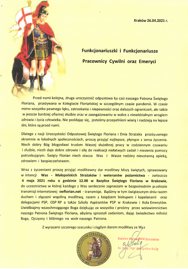 Życzenia Małopolskiego Kapelana Strażaków ks. bryg. Władysława Kuliga z okazji Dnia Strażaka 2021