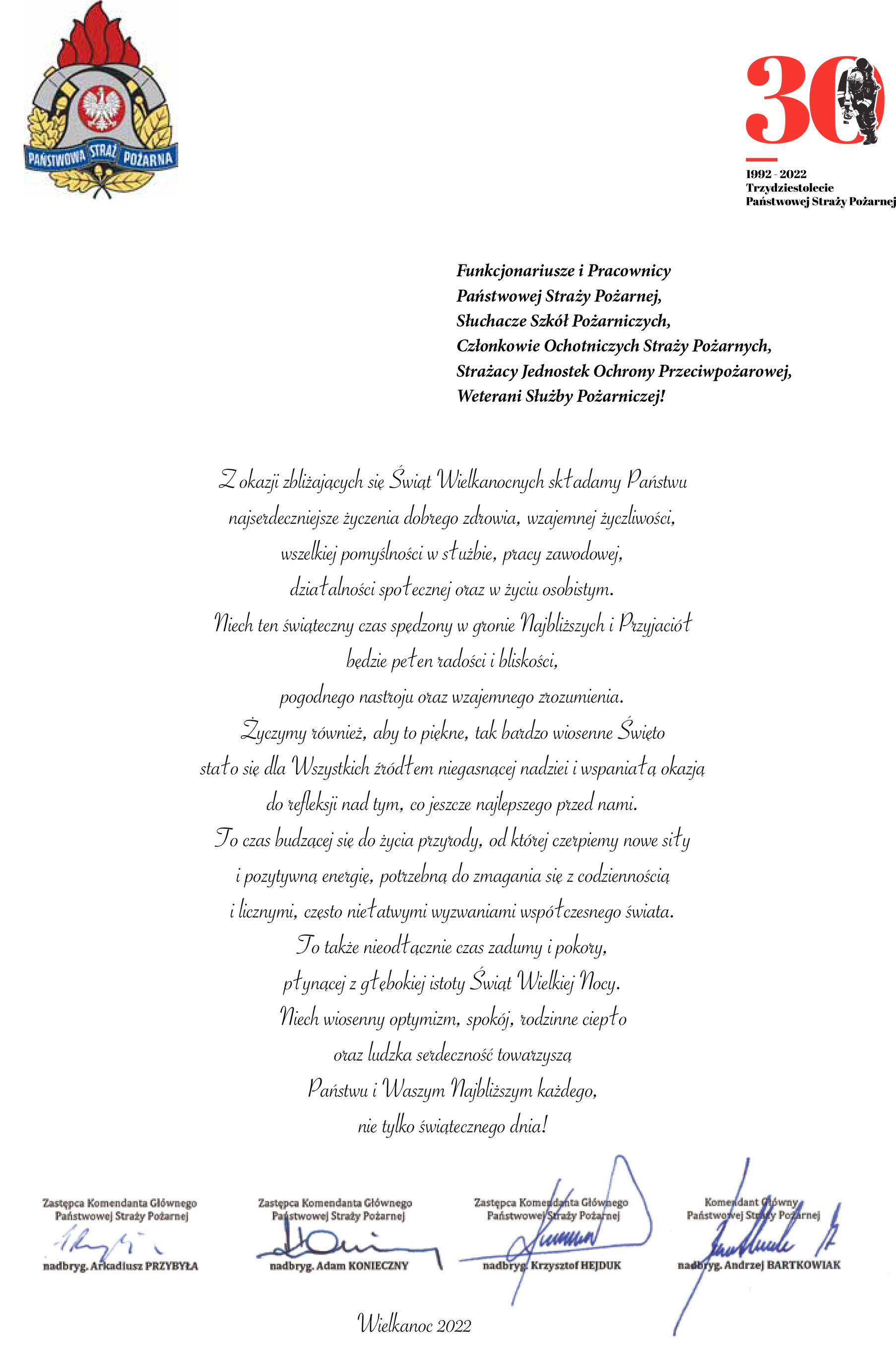 | Życzenia świąteczne Komendanta Głównego Państwowej Straży Pożarnej | 1.0 | 15.04.2022 09:31 mł. bryg. Krzysztof Leja |