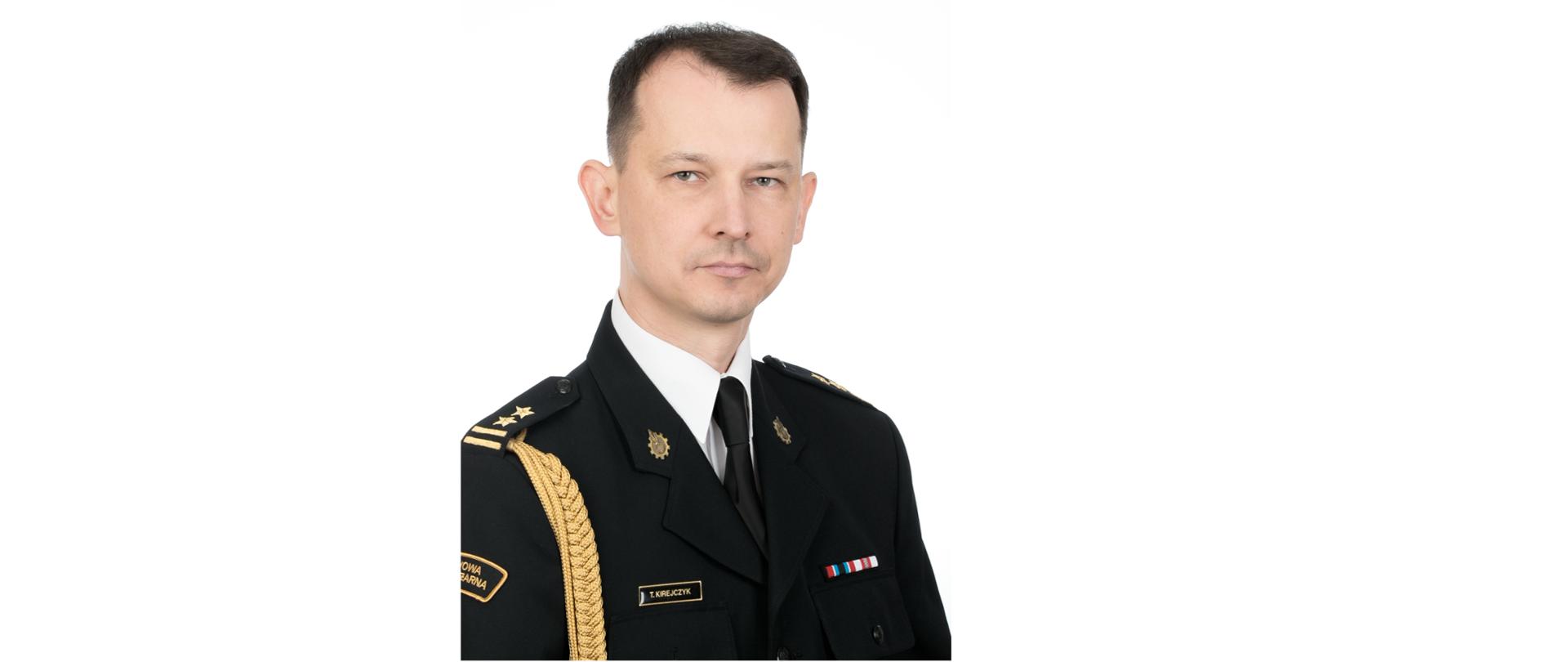 Bryg. mgr inż. Tomasz Kirejczyk z ochroną przeciwpożarową związany jest od 2001 r., kiedy to rozpoczął naukę w Szkole Głównej Służby Pożarniczej w Warszawie. Po jej ukończeniu i uzyskaniu stopnia mł. kpt. został skierowany do służby w Komendzie Miejskiej PSP w Białymstoku. Doświadczenie i umiejętności zawodowe zdobywał uczestnicząc w działaniach ratowniczych. Był członkiem Specjalistycznej Grupy Ratownictwa Chemiczno-Ekologicznego „BIAŁYSTOK” i Specjalistycznej Grupy Ratownictwa Technicznego „BIAŁYSTOK”. W 2014 r. został przeniesiony do Komendy Wojewódzkiej PSP na stanowisko Starszego Specjalisty w Wydziale Operacyjnym. Pełnił nieetatową funkcję rezerwowego Zastępcy Dowódcy Kompanii Gaśniczej „Białystok” COO. Doświadczenie i umiejętności wykorzystywał prowadząc szkolenia obsad stanowisk kierowania PSP oraz będąc członkiem zespołu inspekcyjnego wykonującego czynności kontrolne w KM i KP PSP oraz pododdziałów COO. Zajmując od dnia 01.03.2021 r. stanowisko Naczelnika Wydziału Kadr z zaangażowaniem wykonywał przypisane obowiązki służbowe, umiejętnie koordynując i nadzorując pracę pionu kadrowego w podlaskich komendach, kierując się szeroko rozumianym interesem ochrony ppoż. i dobrem służby. Nabyte umiejętności i doświadczenie zawodowe oraz predyspozycje osobowe zaowocowały wysoką oceną przełożonych oraz powołaniem na stanowisko Zastępcy Komendanta Powiatowego w Komendzie Powiatowej PSP w Zambrowie z dniem 01.07.2023 r.