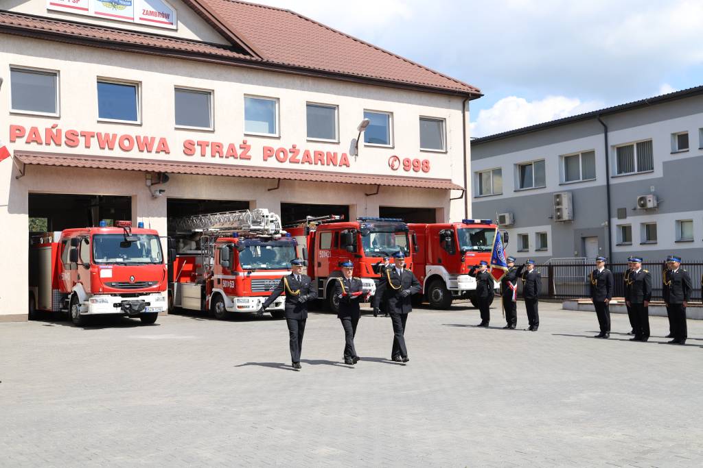 Uroczystość rozpoczęła się złożeniem meldunku przez dowódcę uroczystości bryg. Adama Wysmukła dla Zastępcy Podlaskiego Komendanta Wojewódzkiego PSP st. bryg. Roberta Tadeusza Dzierżka. Następnie dokonano podniesienia flagi państwowej i odegrano hymn państwowy.