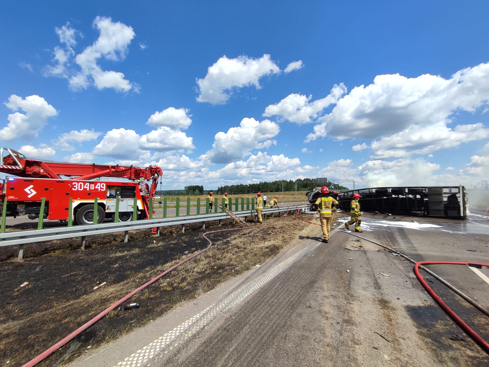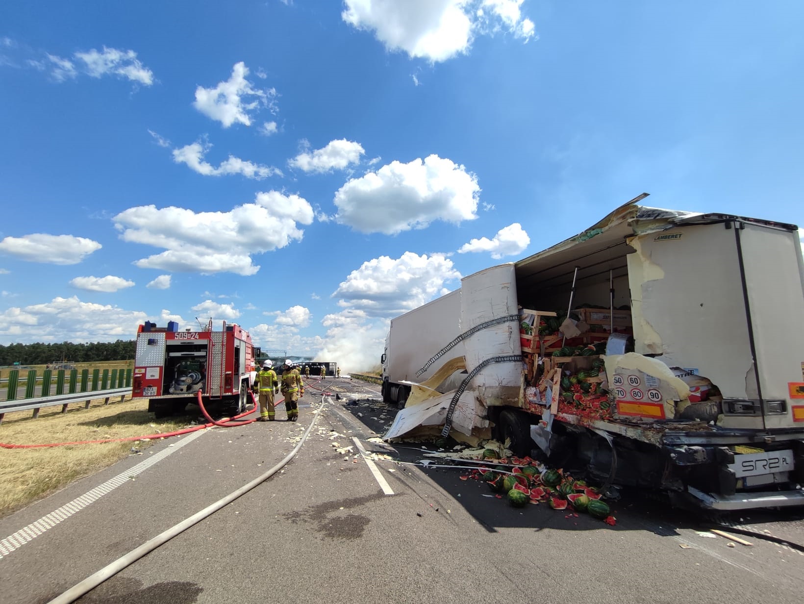 Po dojechaniu na miejsce zdarzenia zastano jedną z ciężarówek stojącą na pasie awaryjnym przy prawej stronie jezdni w kierunku Białegostoku z uszkodzoną tylną częścią naczepy typu chłodnia, z której częściowo wysypał się ładunek (arbuzy w drewnianych boksach). Drugi ciągnik siodłowy z naczepą, na której znajdowały się płyty meblowe, w wyniku uderzenia przewrócił się na prawy bok w poprzek drogi na całej jej szerokości z przodem opartym o bariery rozdzielające przeciwległe pasy ruchu i objęty był całkowicie pożarem. Pojazdami podróżowało łącznie 3 osoby. Samochodem ciężarowym, który uległ zapaleniu, podróżował jedynie kierowca, opuścił pojazd przed przybyciem straży i znajdował się pod opieką ZRM. Drugim samochodem ciężarowym podróżował dwóch mężczyzn nie wymagali pomocy medycznej.